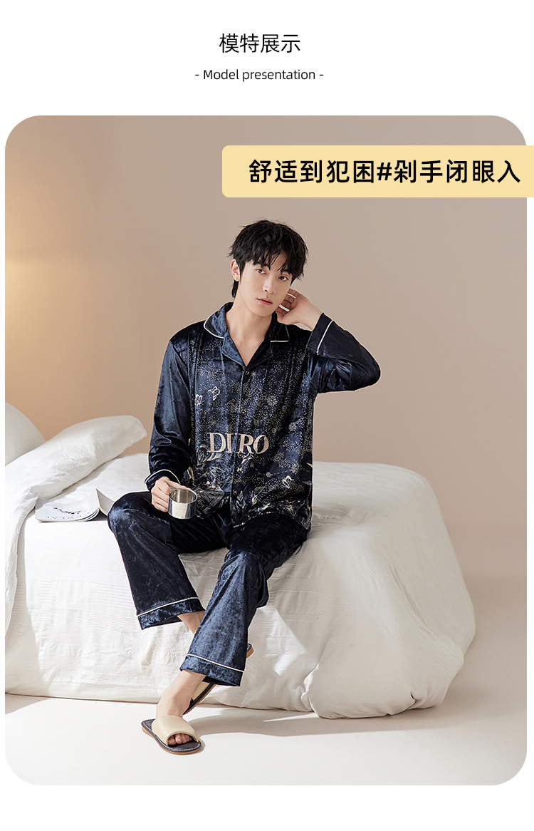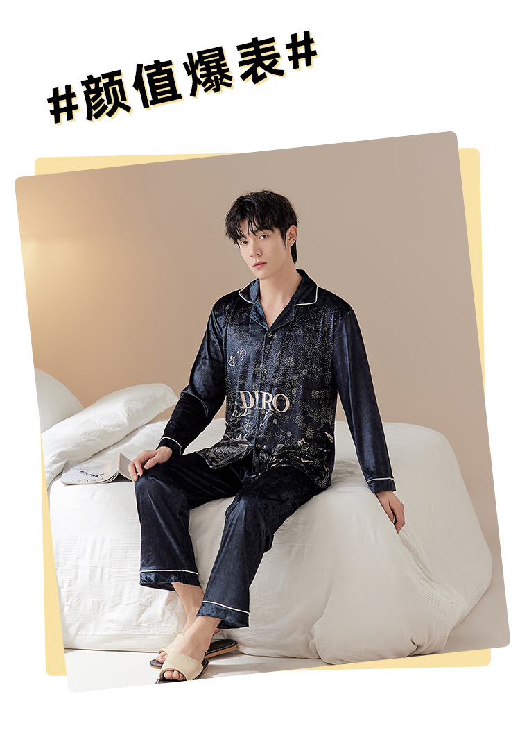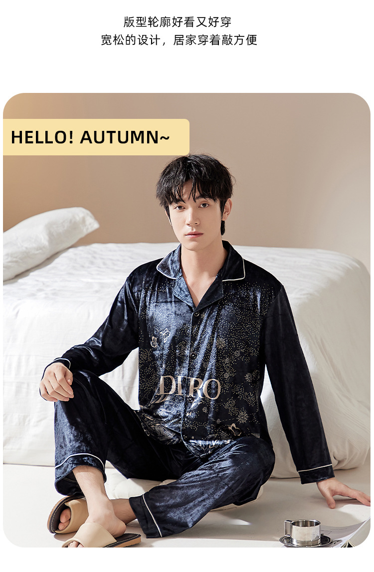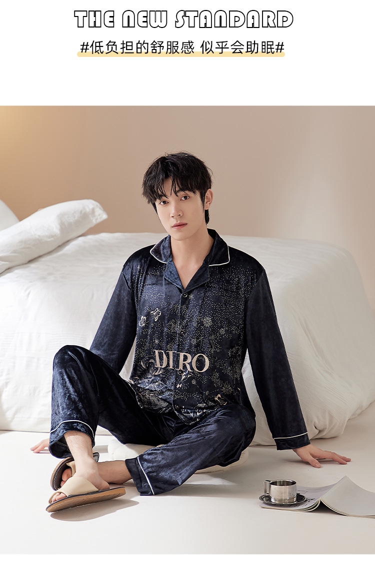 2024 다이아몬드 벨벳 남성 가을과 겨울 새로운 잠옷 잘 생긴 하이 엔드 센스 골드 벨벳 홈 옷은 세트 밖에서 입을 수 있습니다.스토어 가기