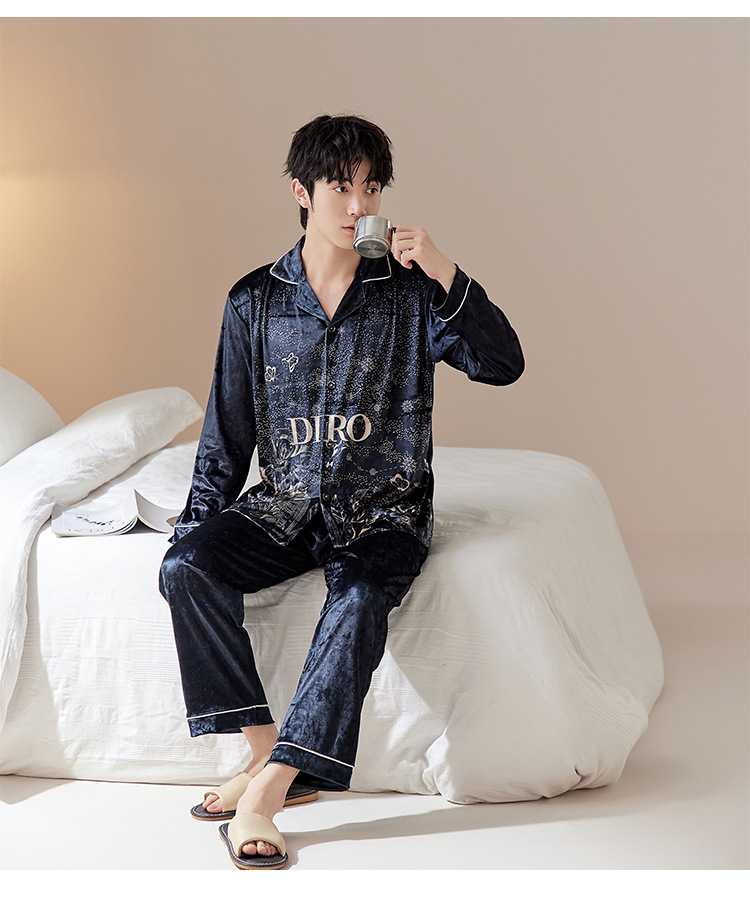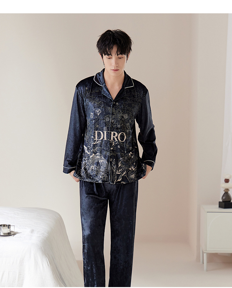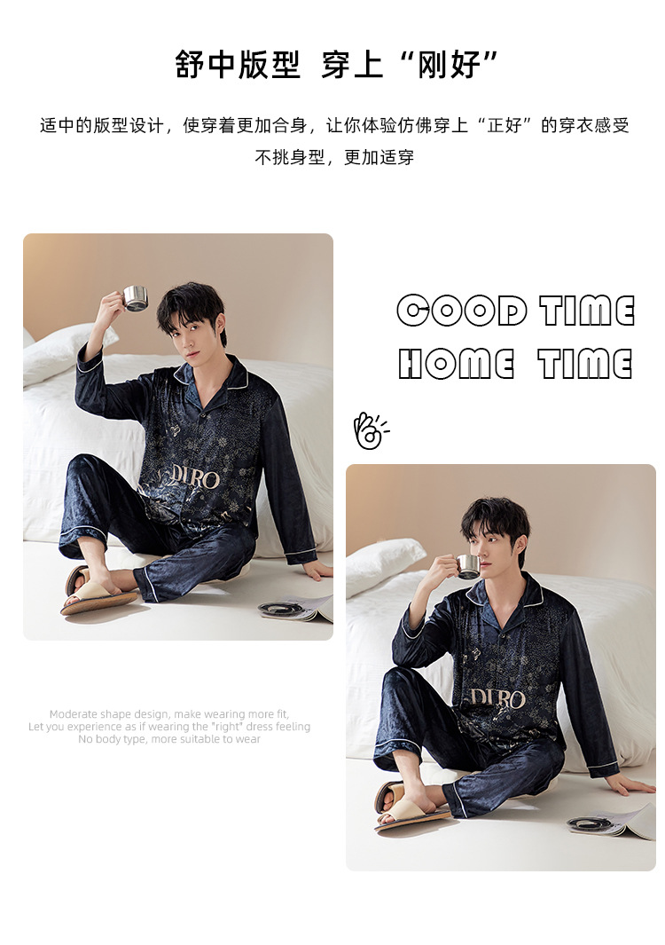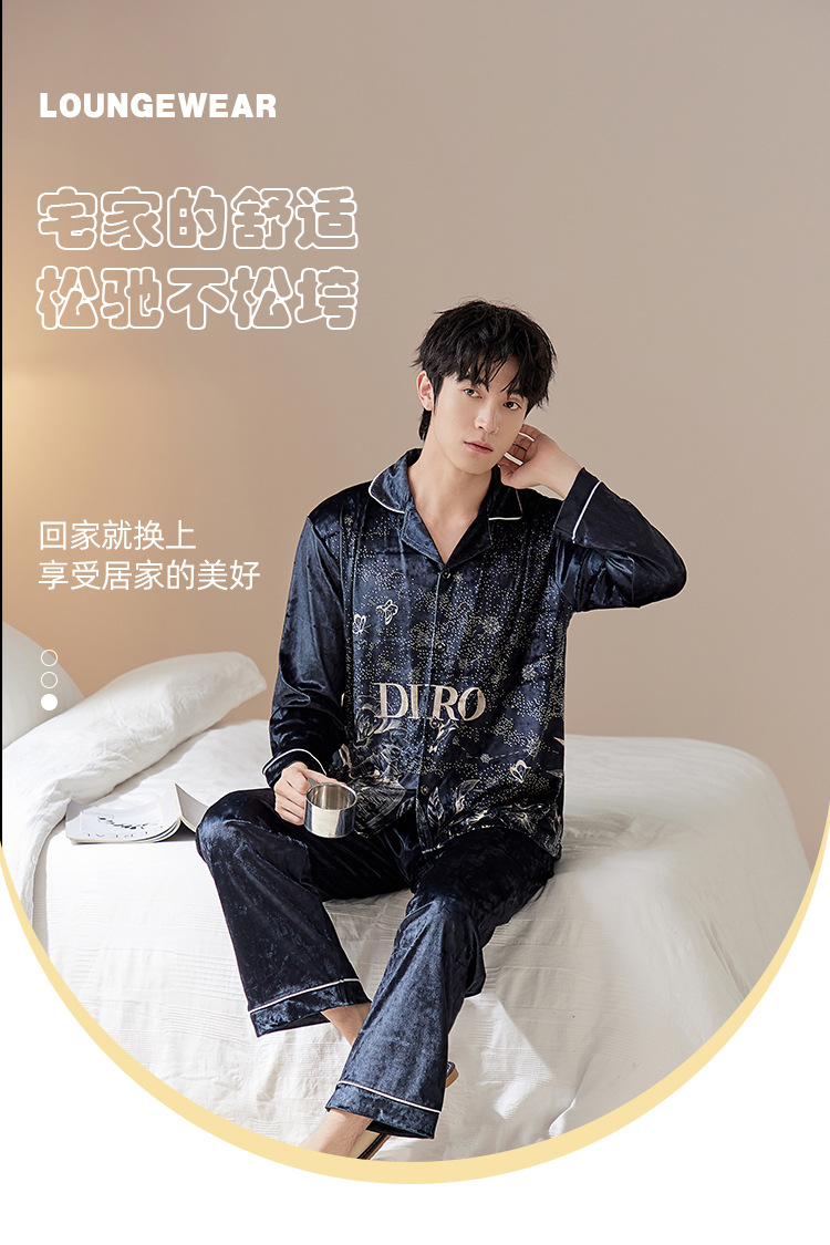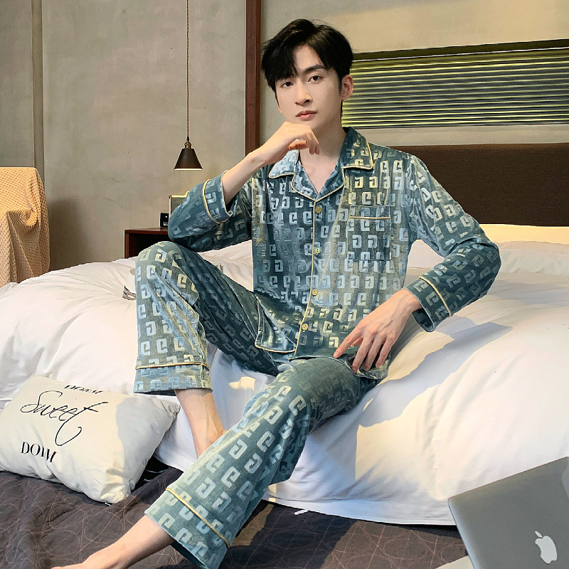 2024 다이아몬드 벨벳 남성 가을과 겨울 새로운 잠옷 잘 생긴 하이 엔드 센스 골드 벨벳 홈 옷은 세트 밖에서 입을 수 있습니다.스토어 가기