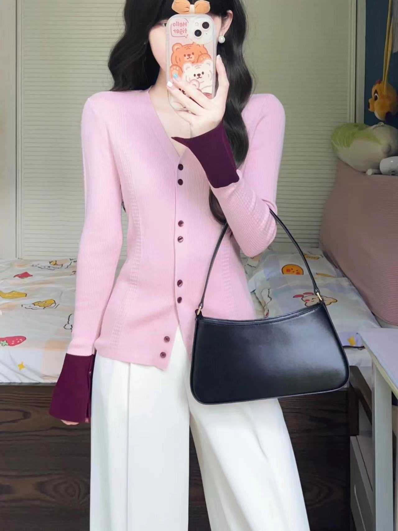 法式复古高级感V领长袖打底衫女秋款独特设计感修身拼色开衫毛衣