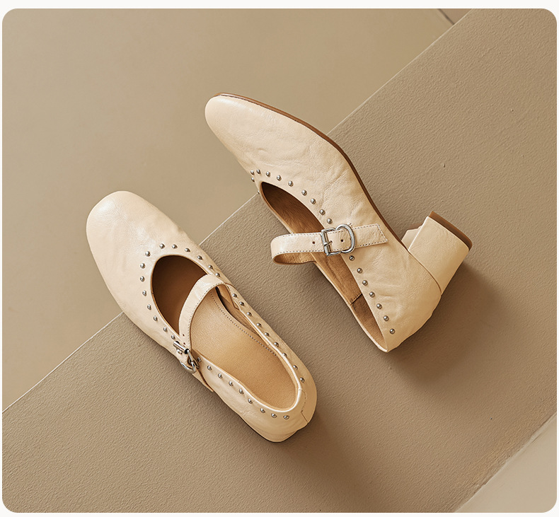 2024 가을 새로운 라운드 헤드 Mary Jane 신발 여성의 얕은 입 미드 힐 신발 두꺼운 뒤꿈치 신발 리벳 양가죽 신발 도매스토어 가기