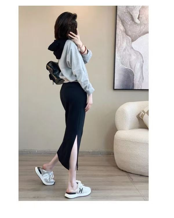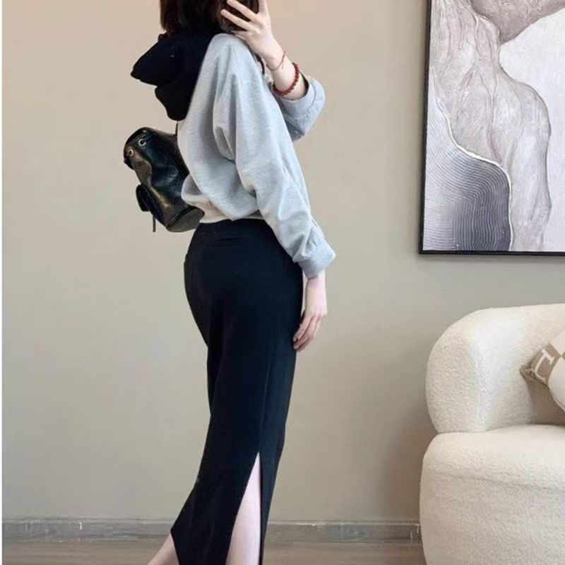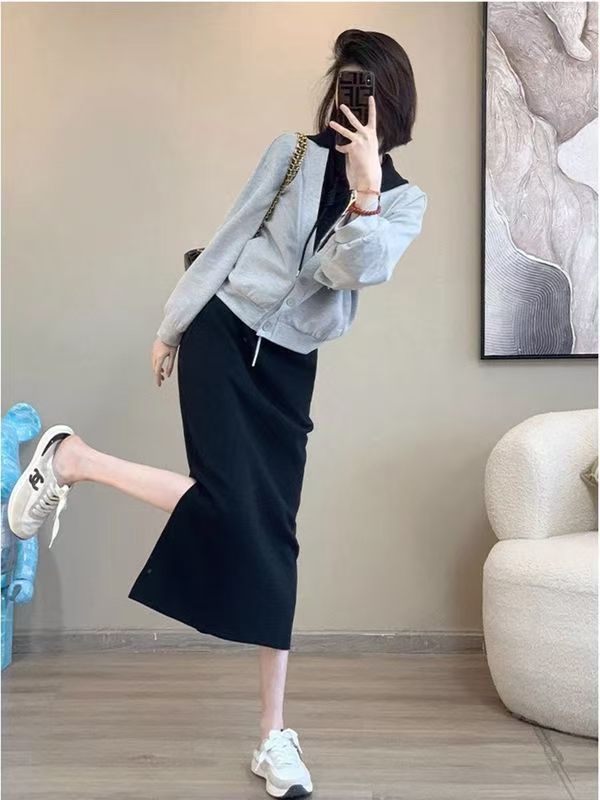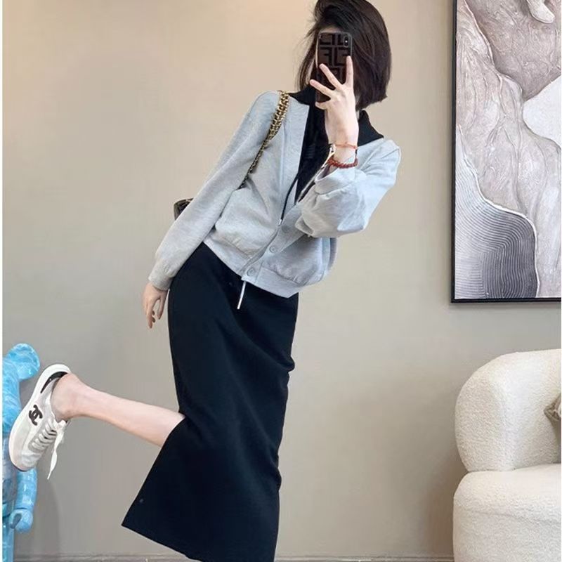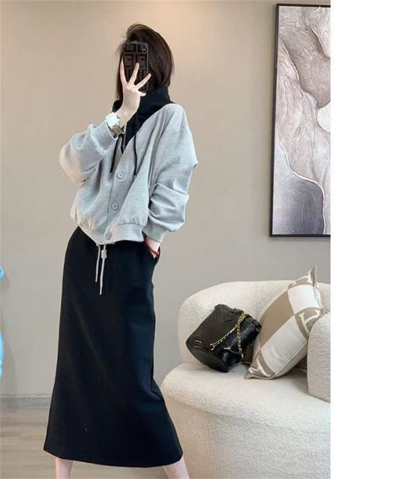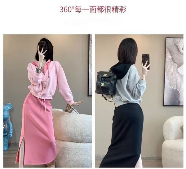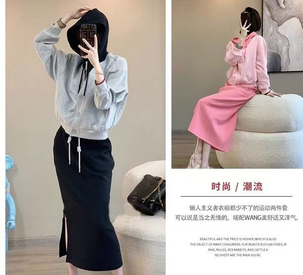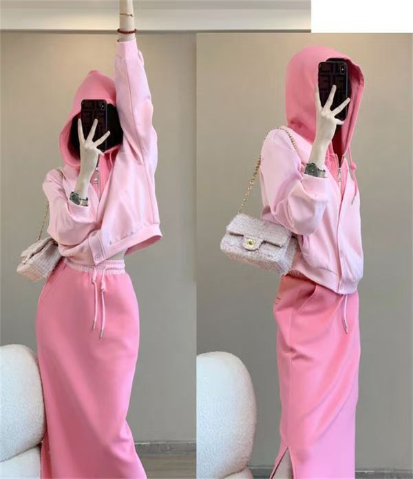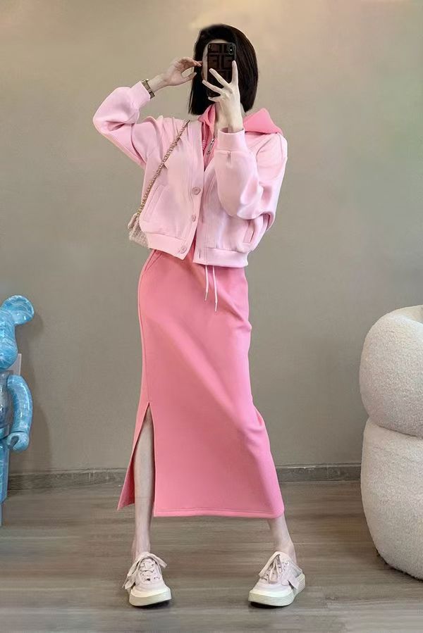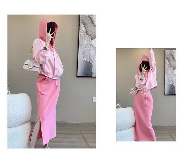 핑크 바느질 후드 스웨터 여성용 카디건 투피스 세트 2024 가을 새 재킷 니트 스커트 세트 여성스토어 가기