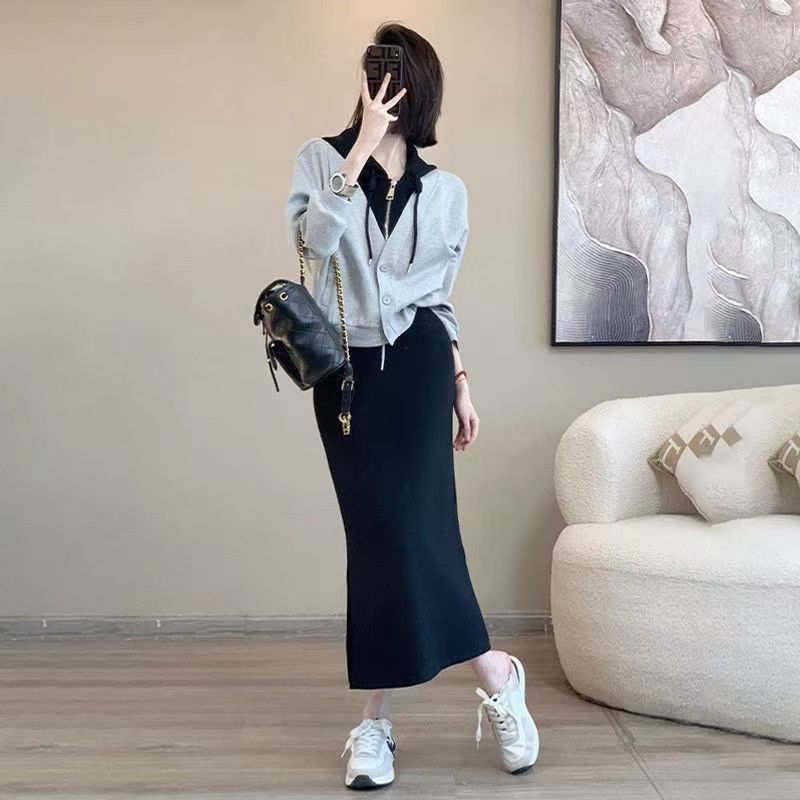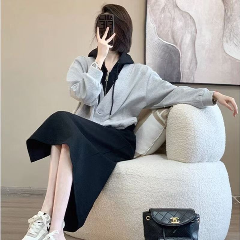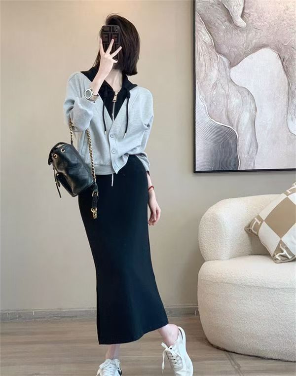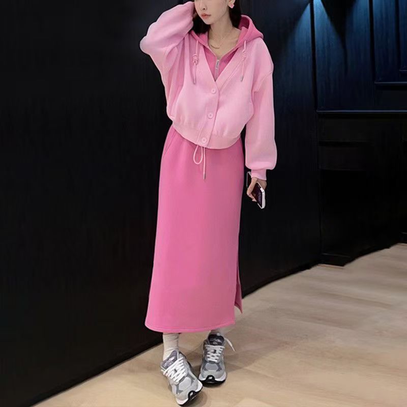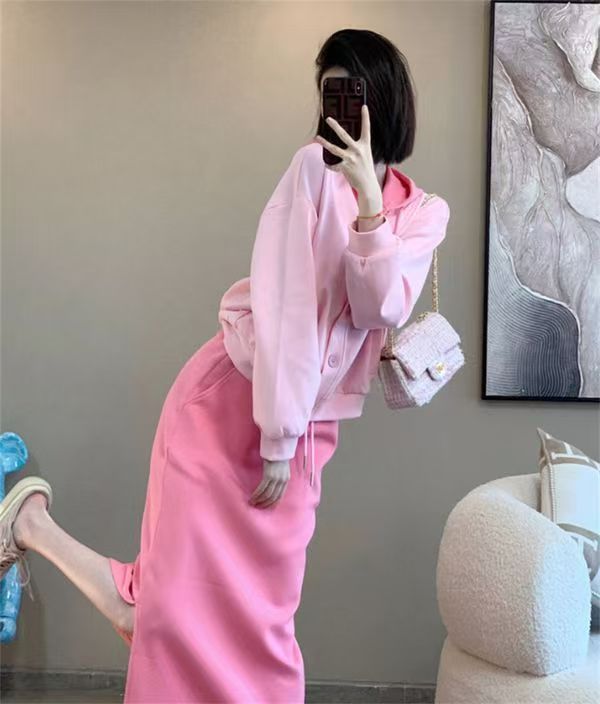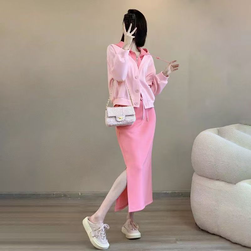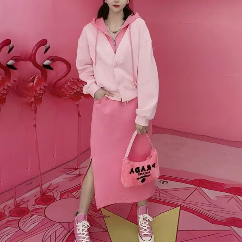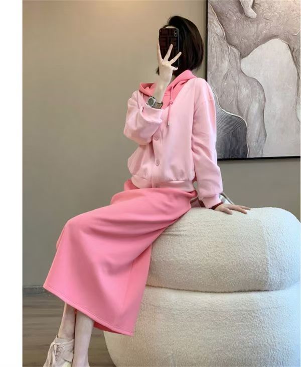 핑크 바느질 후드 스웨터 여성용 카디건 투피스 세트 2024 가을 새 재킷 니트 스커트 세트 여성