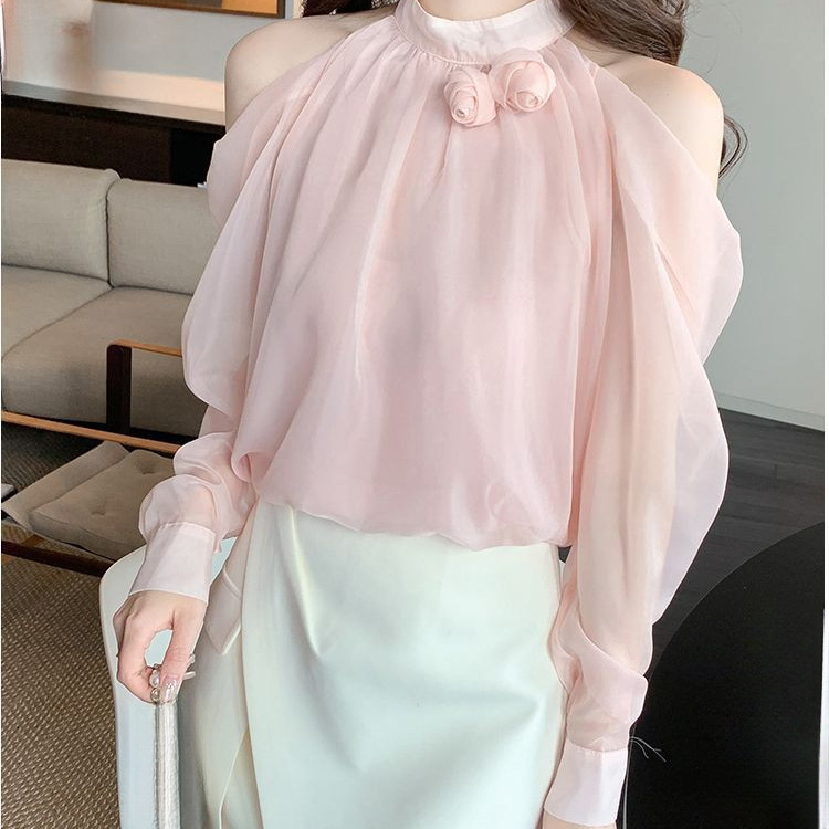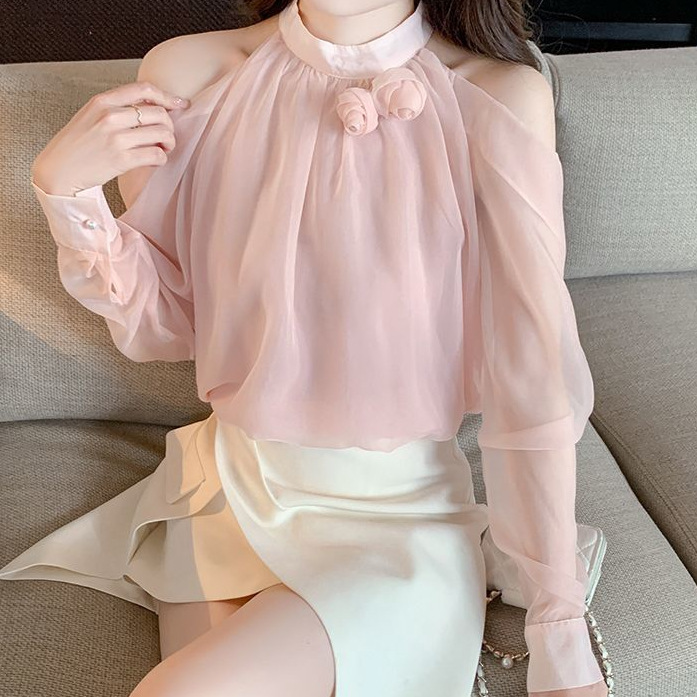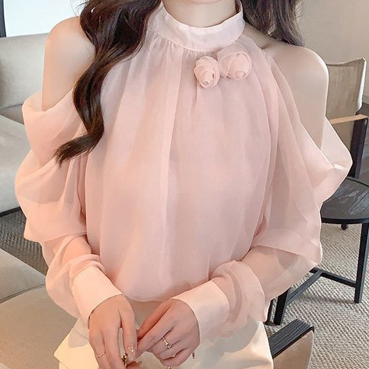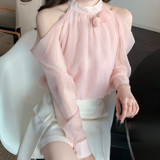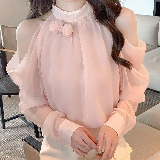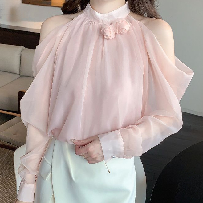 쉬폰 셔츠 봄 여성의 2024 새로운 세련된 셔츠 이른 봄 기질 오프 숄더 디자인 탑 여성