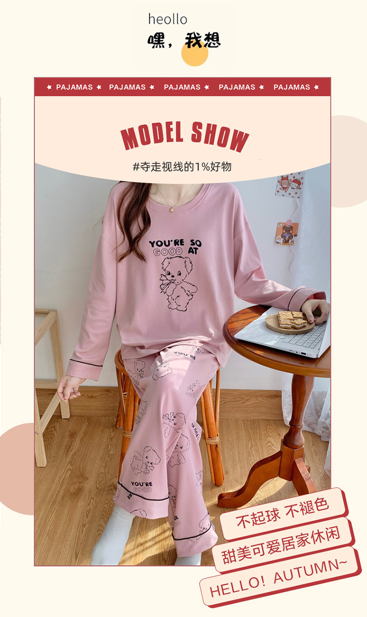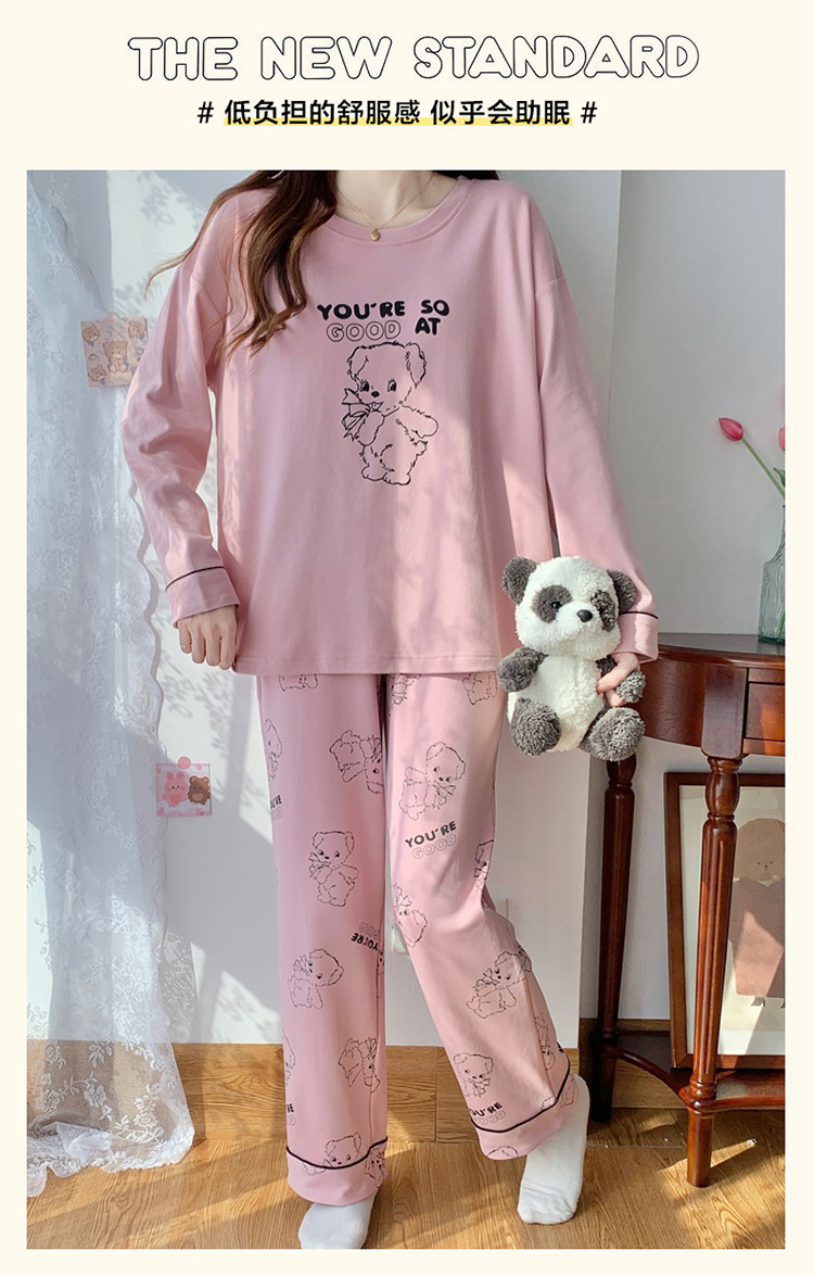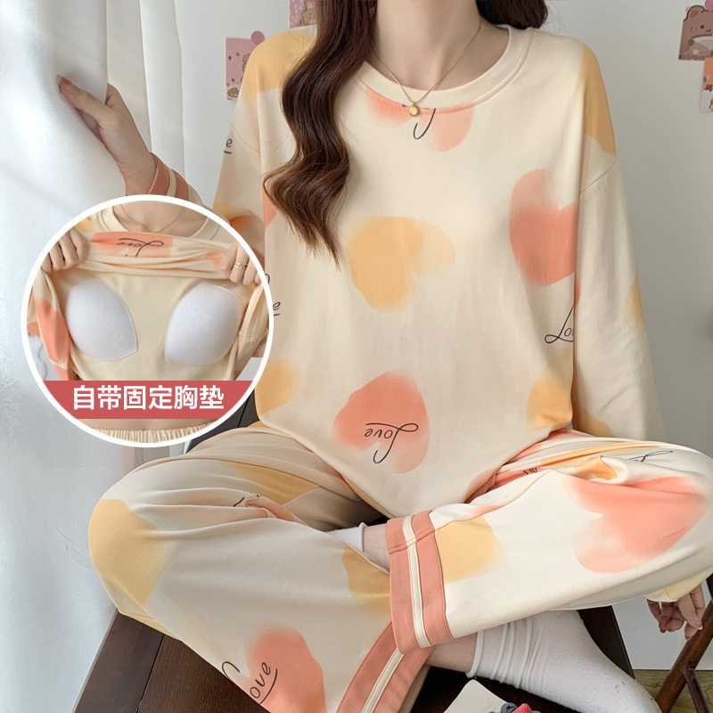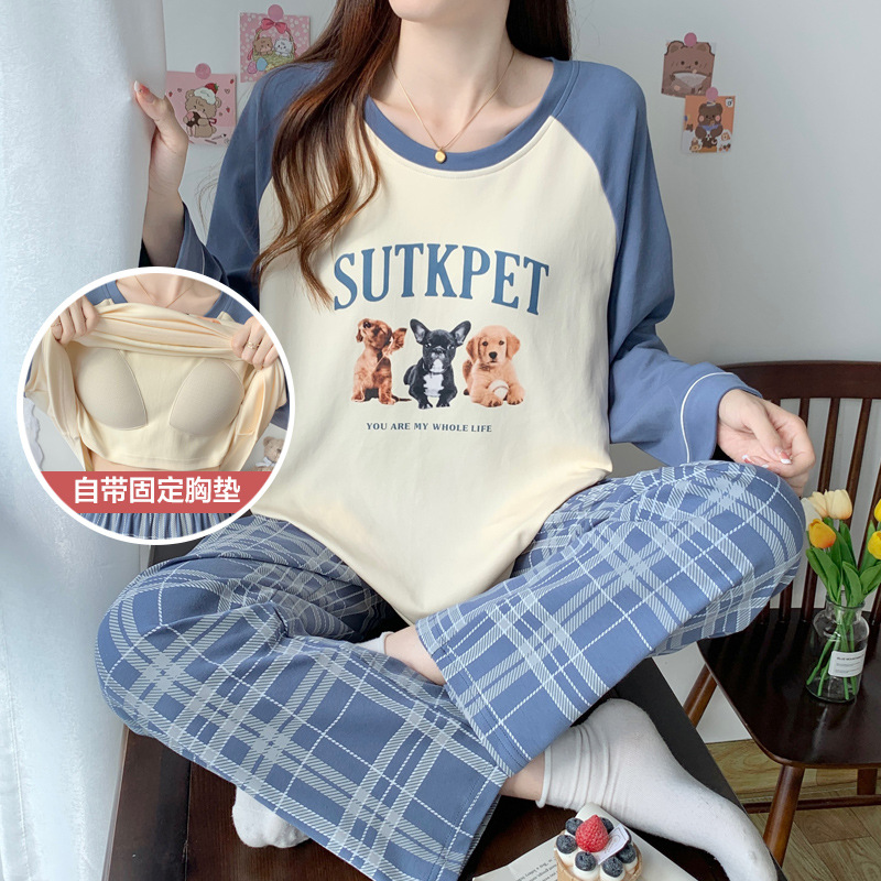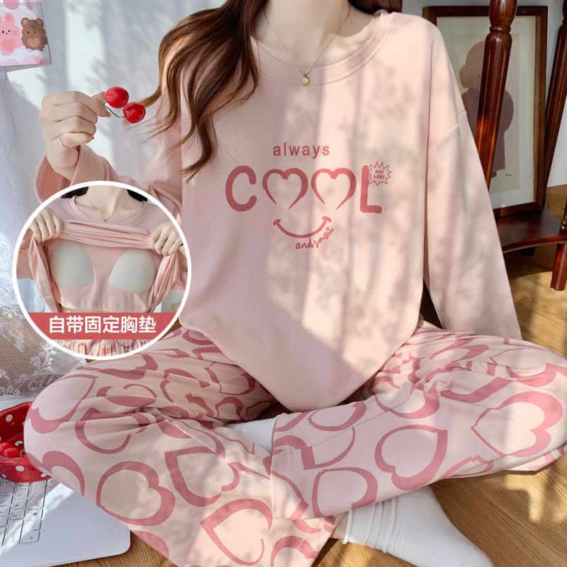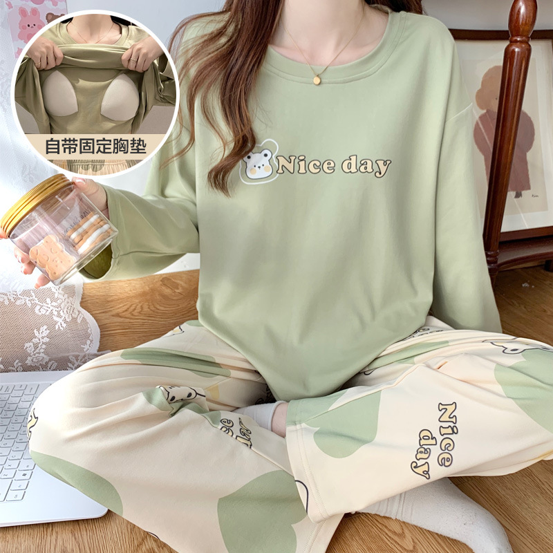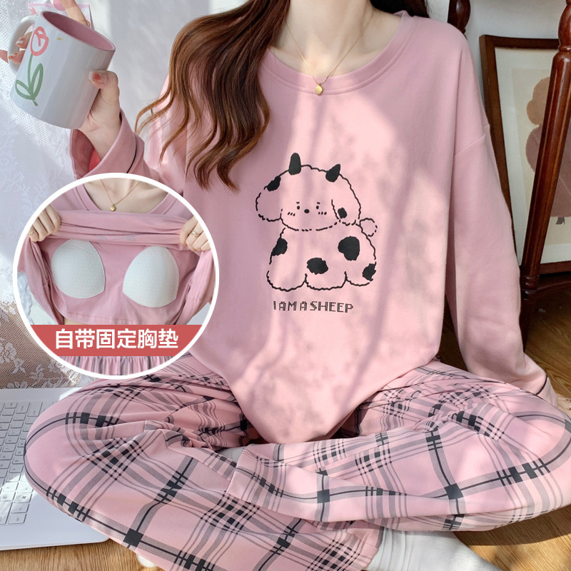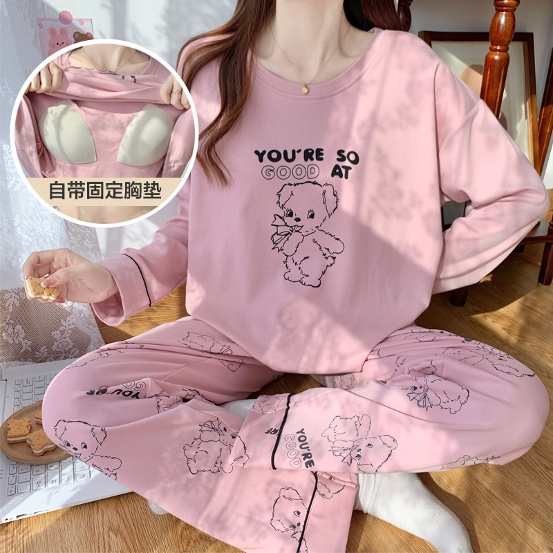 여자 면 잠옷 봄 가을 가슴 패드 한 조각 외부 착용 만화 느슨한 홈 옷 세트 2024 새로운스토어 가기
