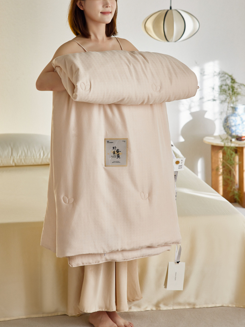 面料选用80支兰精天丝棉大提花,复古大欧式提花,进口织机织造,将画稿更好的呈现出来。既有天丝的光泽柔滑,又兼具长绒棉的细糯棉柔。内衬防钻层为针织纱布面料,采用独特的缝制方案,将内衬和被面缝合,在使用过程中不会产生膈应感。 丝胎拉制后,厚薄均匀,手工缝合,一针一线,只为生产一条不跑棉的合格蚕丝被。 被芯底部开有1.5米长检测口,精致做工和精选蚕丝一览无余。 【参数】 面料:径向100%莱赛尔纤维(兰精) 纬向100%棉(新疆长绒棉) 填充:100%柞蚕丝(中长丝绵) 重量: 春秋被: 150*200cm,填充1斤,整被3.6斤左右 220*240cm,填充2斤,整被6.6斤左右