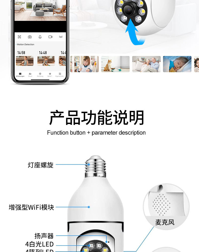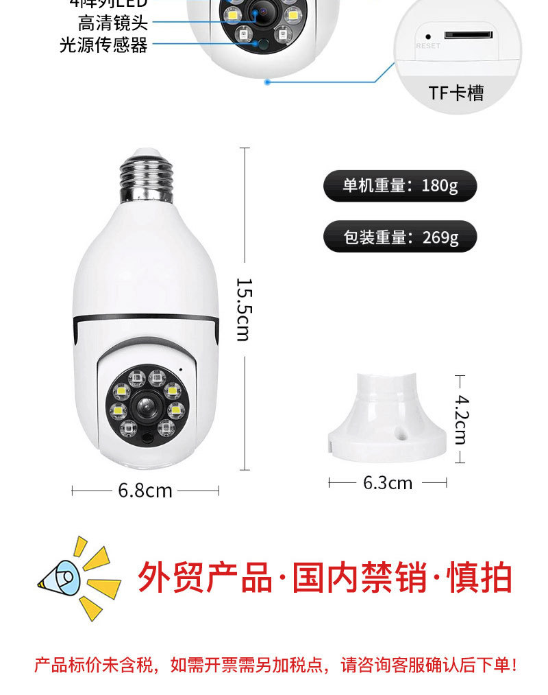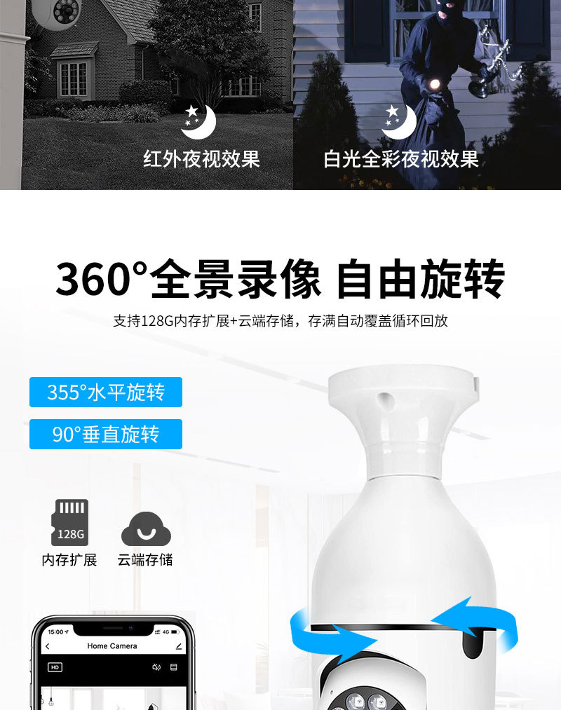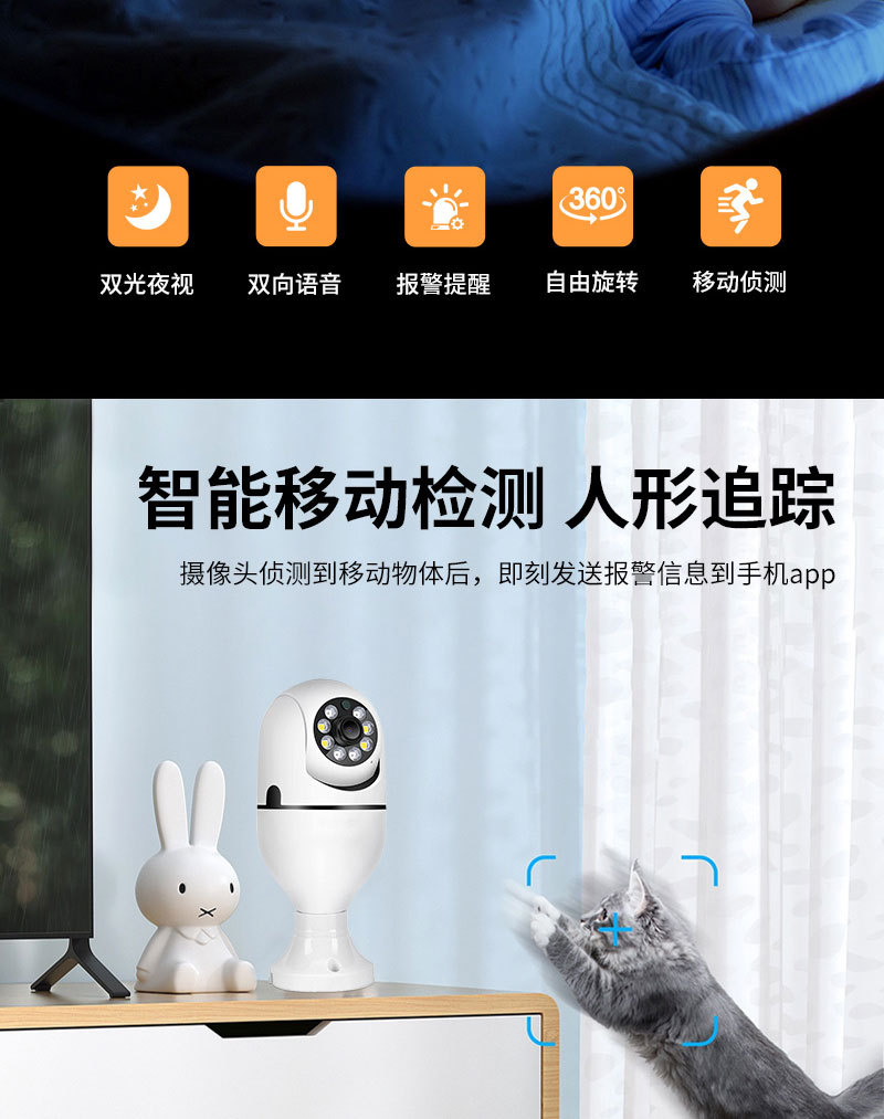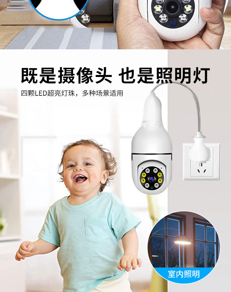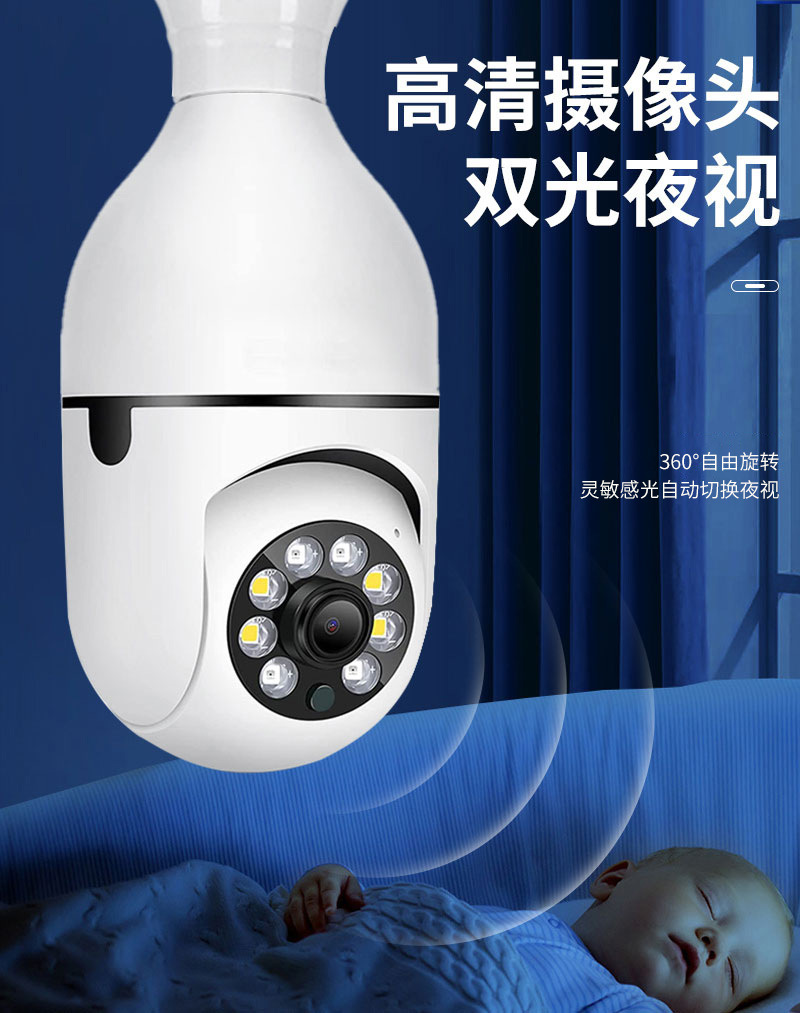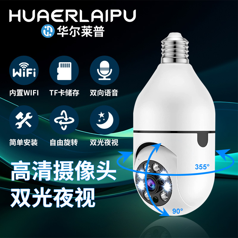 A6 전구 카메라 360 ° 회전 실내 이중 조명 풀 컬러 고화질 야간 투시경 홈 무선 Wi-Fi 카메라