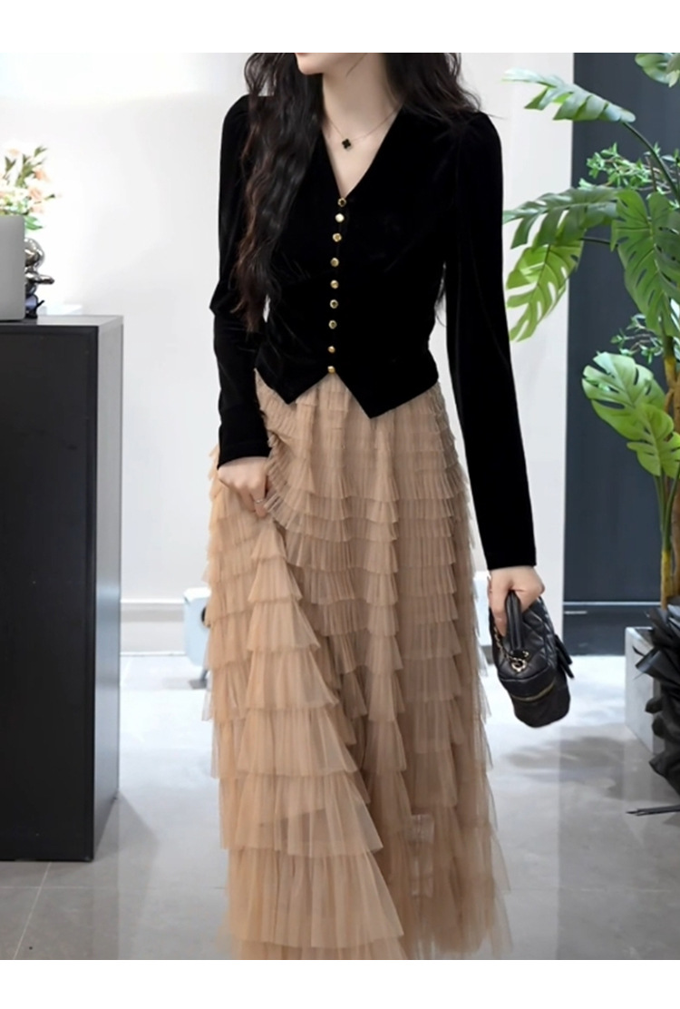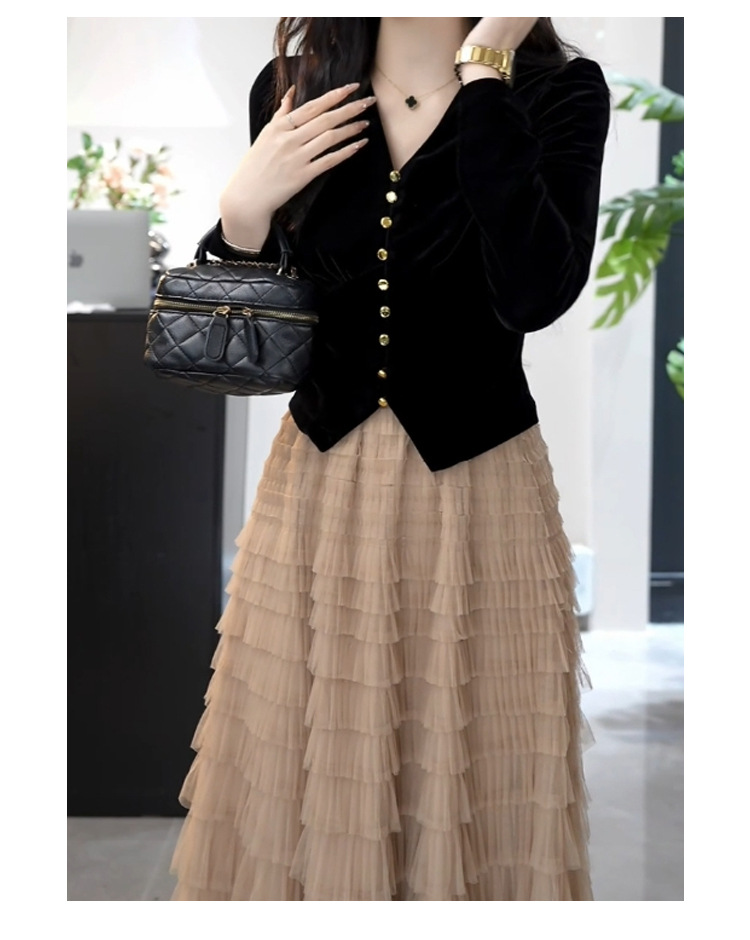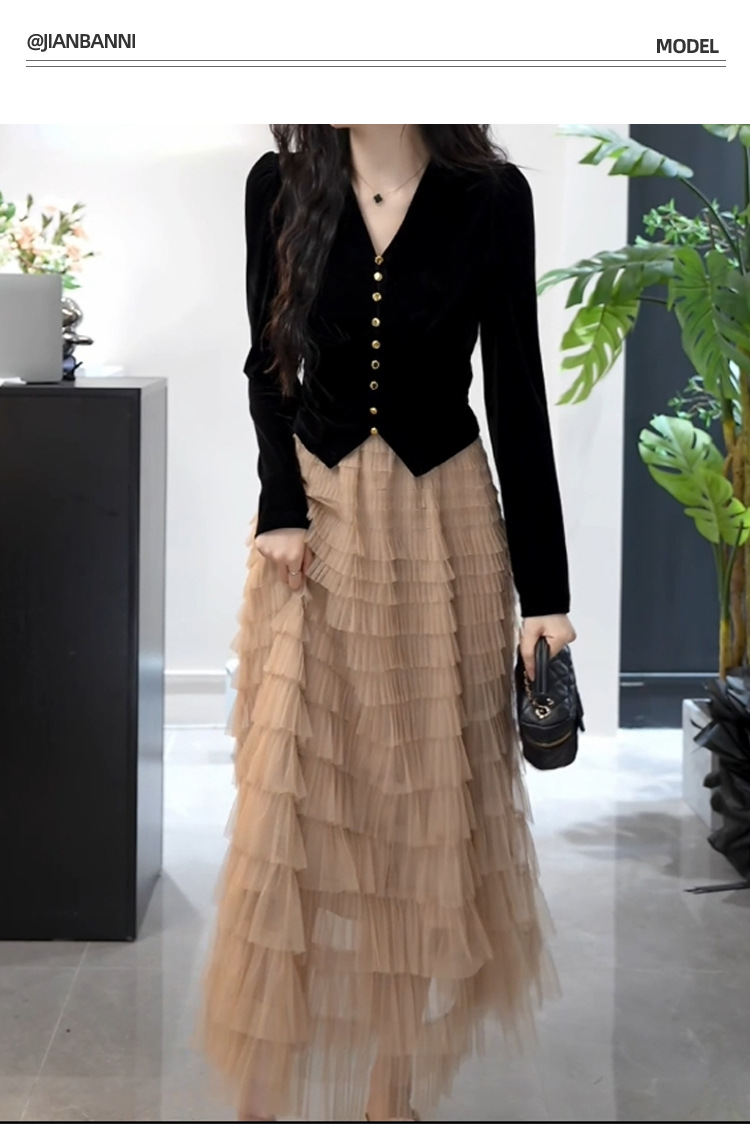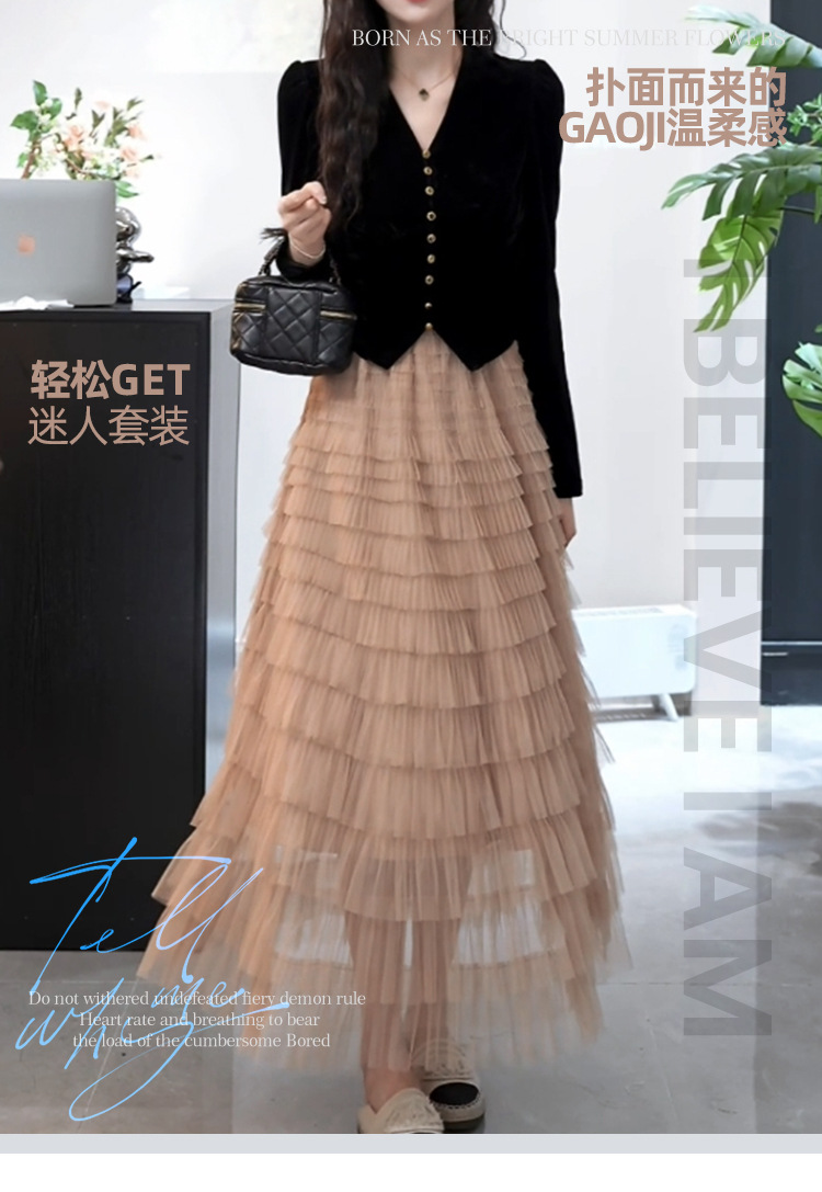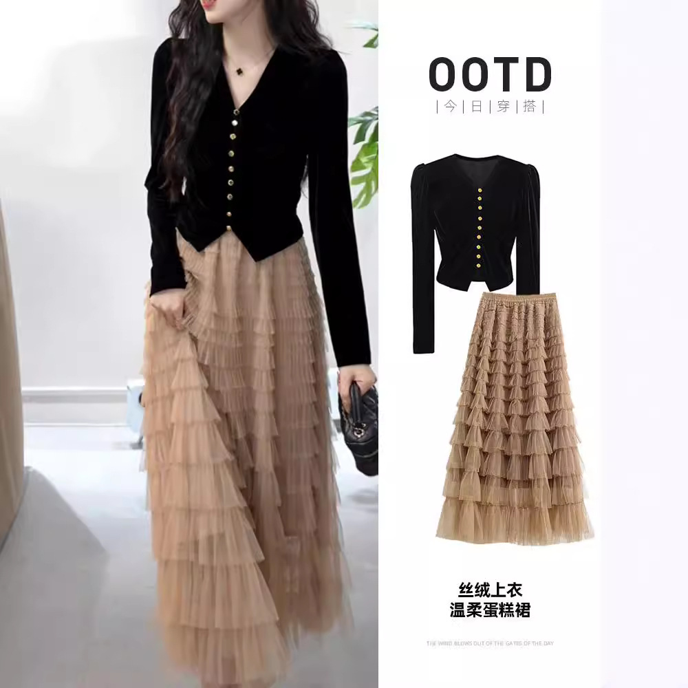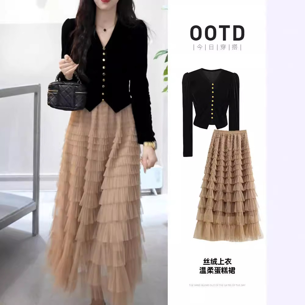 벨벳 셔츠+메쉬 케이크 스커트 브이넥 긴팔 숏탑 여성 투피스 세트 스커트 작은 프랑스 스타일 세트스토어 가기