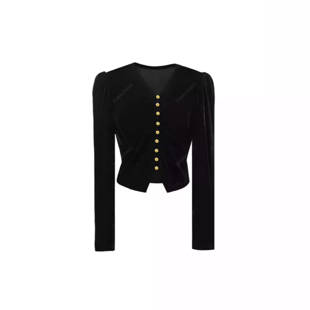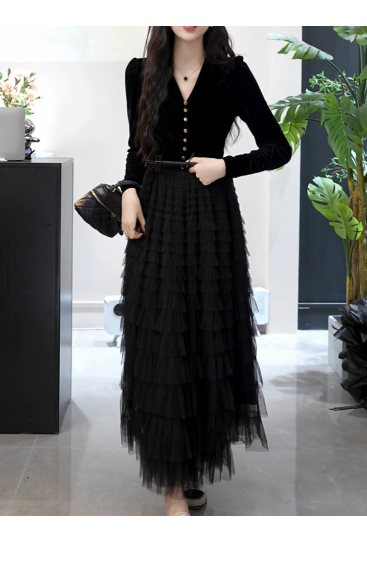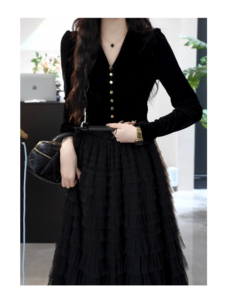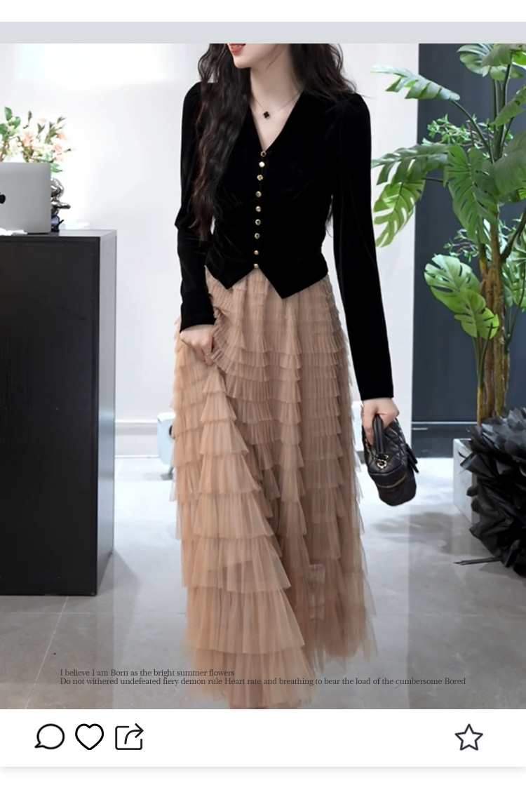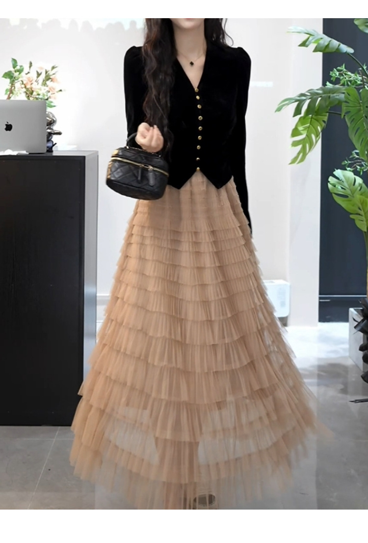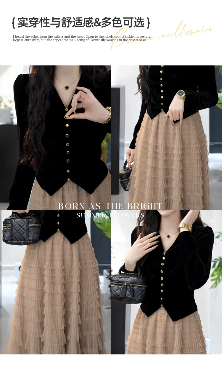 벨벳 셔츠+메쉬 케이크 스커트 브이넥 긴팔 숏탑 여성 투피스 세트 스커트 작은 프랑스 스타일 세트스토어 가기