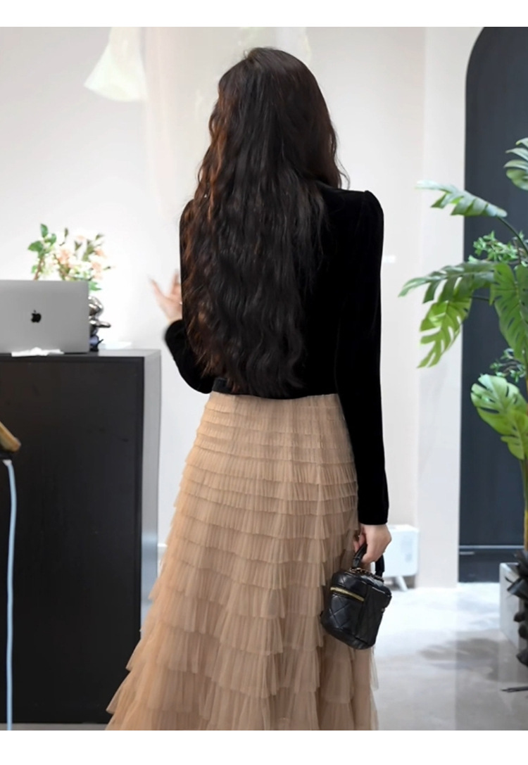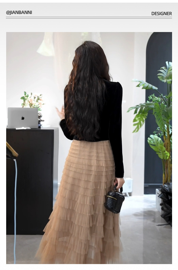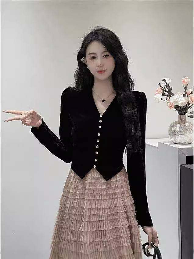 벨벳 셔츠+메쉬 케이크 스커트 브이넥 긴팔 숏탑 여성 투피스 세트 스커트 작은 프랑스 스타일 세트