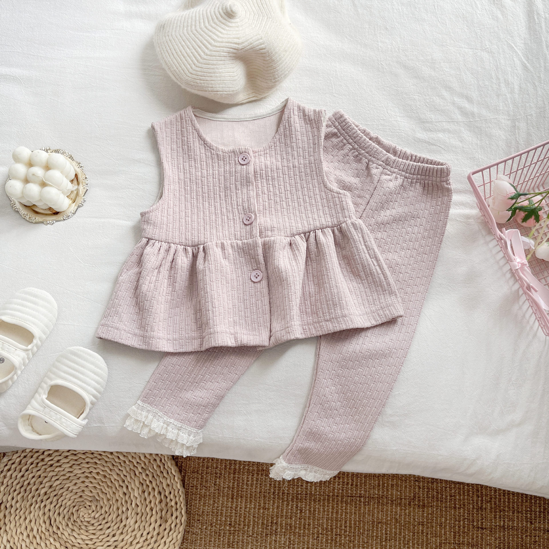 In 한국식 봄과 가을 아기 소녀 달콤한 민소매 탑 레이스 바지 소녀 세련된 한국식 투피스 세트스토어 가기