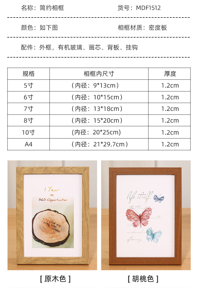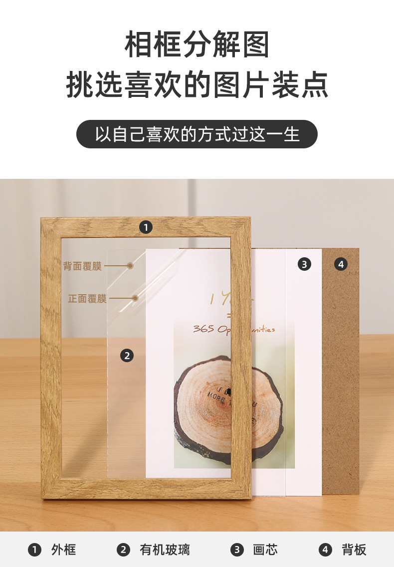 二、相框成品包含:(外框、塑料有机玻璃、中间照片纸,后密度板背板、挂钩)