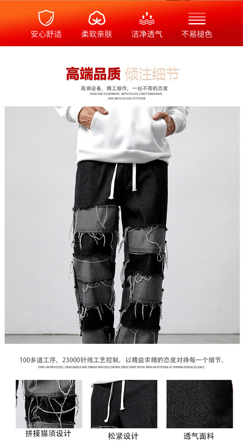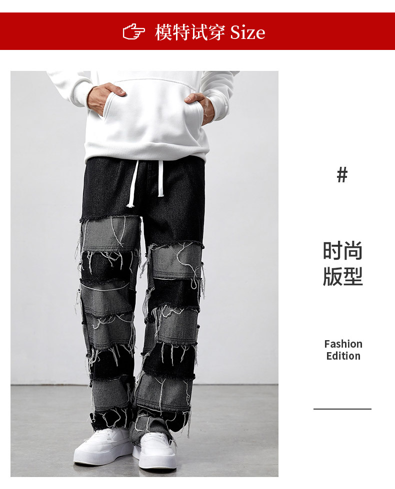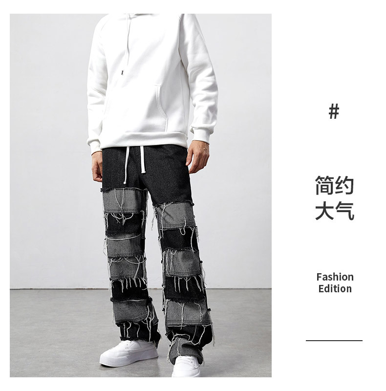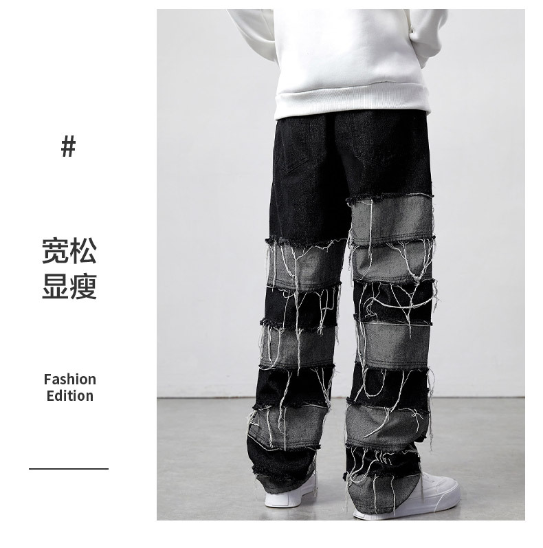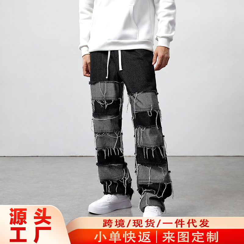 아메리칸 하이 스트리트 태슬 스플라이스 청바지, 스트레이트 와이드 팬츠, 유럽 및 미국 대형 남성 청바지, 국경 간 전용스토어 가기