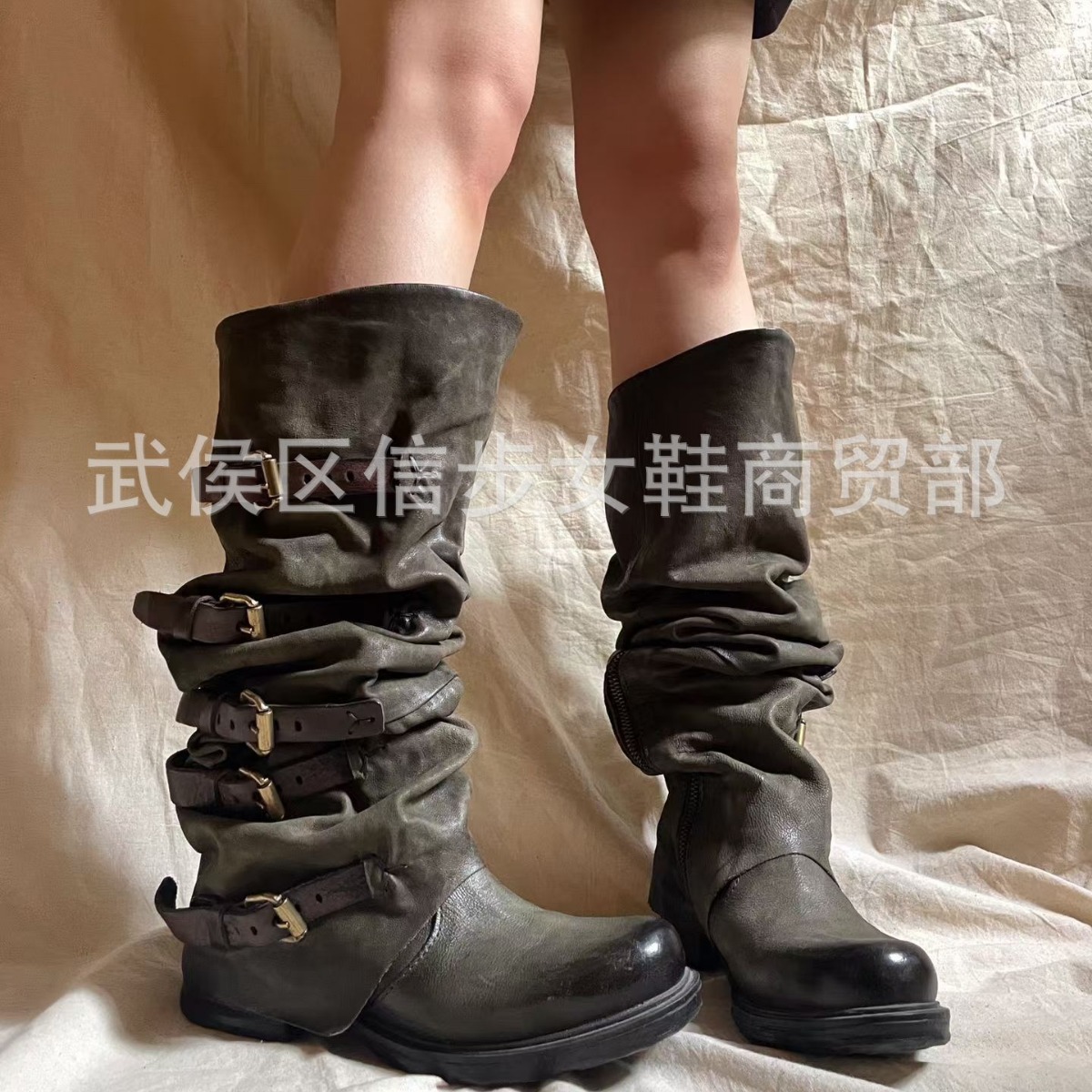 대외 무역 국경 간 벨트 버클 주름 부츠 여성용 부츠 둥근 발가락 두꺼운 영국 벨트 버클 나이트 부츠 소프트 가죽 힙 부츠스토어 가기