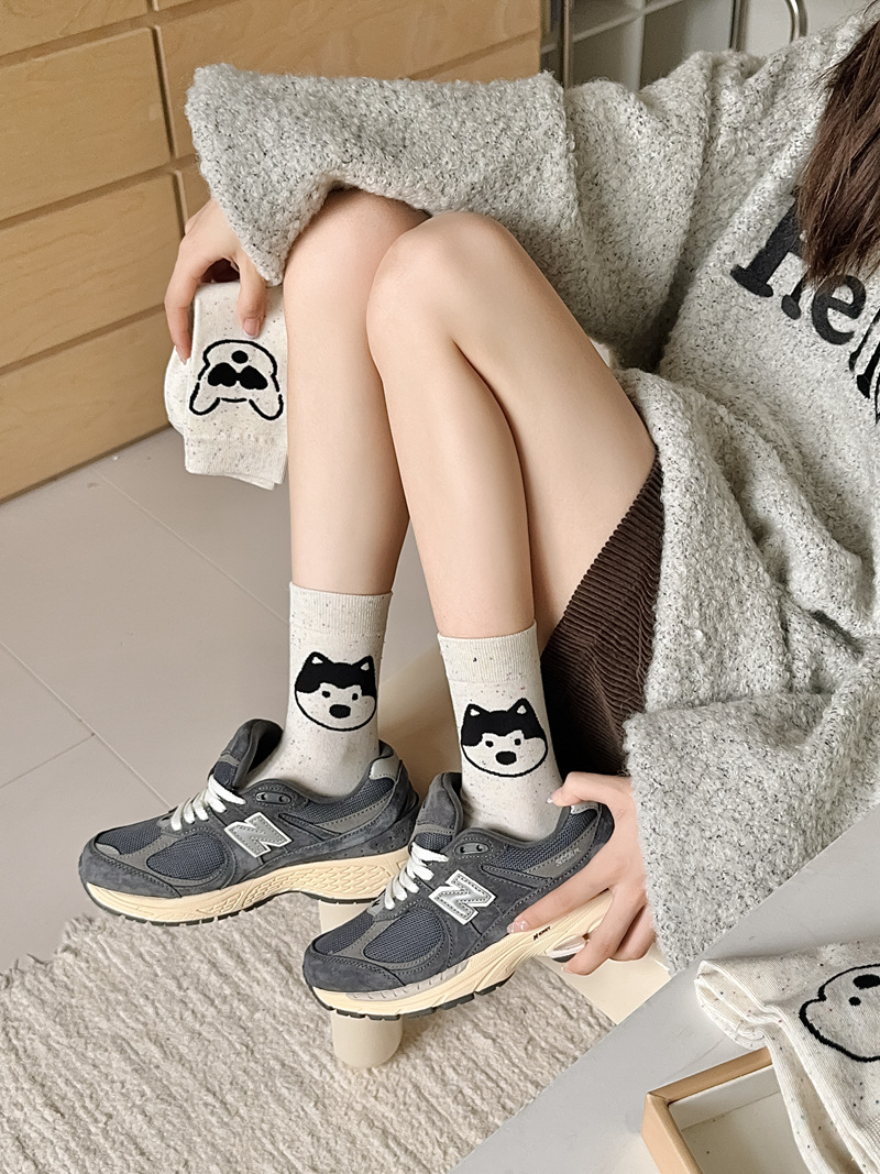 귀여운 강아지 양말 여성용 Orn 원사 중간 길이 양말 봄과 가을 코튼 양말 Ins 유행 일본 스타일 만화 스택 양말 여성용 양말