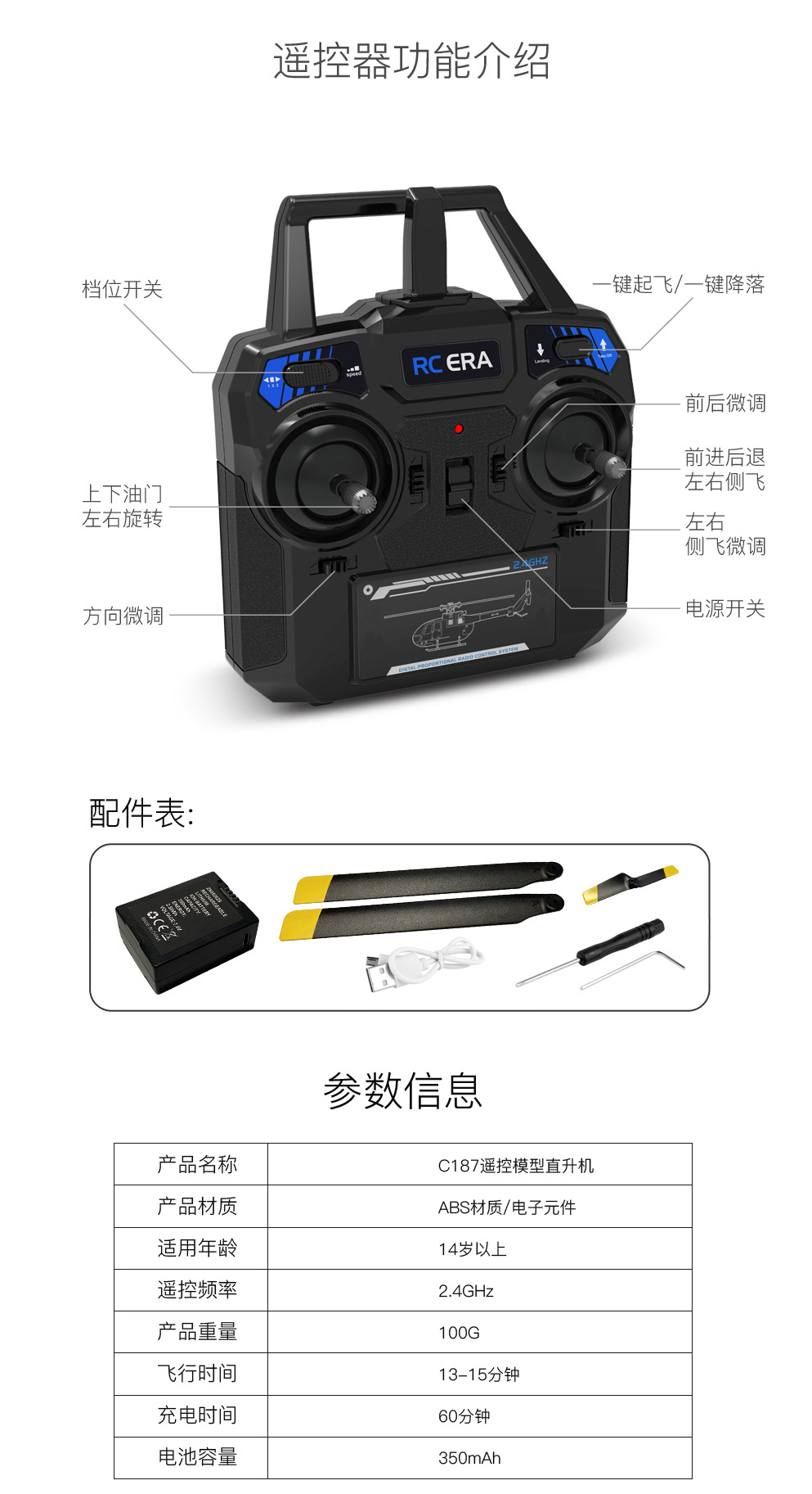 产品附带配件明细:彩盒包装*1、直升机*1、遥控器*1、说明书*1、USB充电器*1、主螺旋桨*2、尾螺旋桨*1、锂电池*1、螺丝刀*1、六角扳手*1