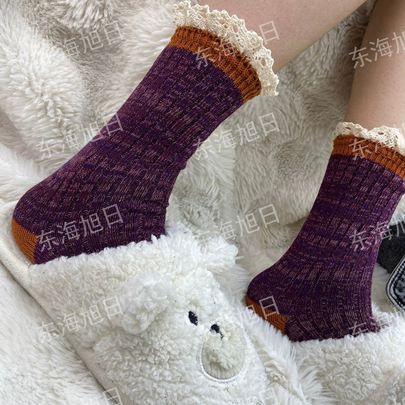 가을과 겨울 고구마 폭발 레트로 게으른 스타일 레이스 컬러 라인 니트 콘트라스트 컬러 파일 양말 중간 튜브 면 양말 어린이를위한 일본 스타일