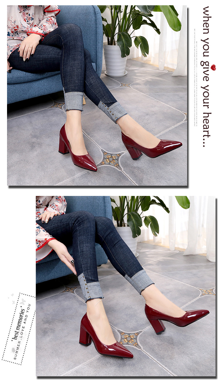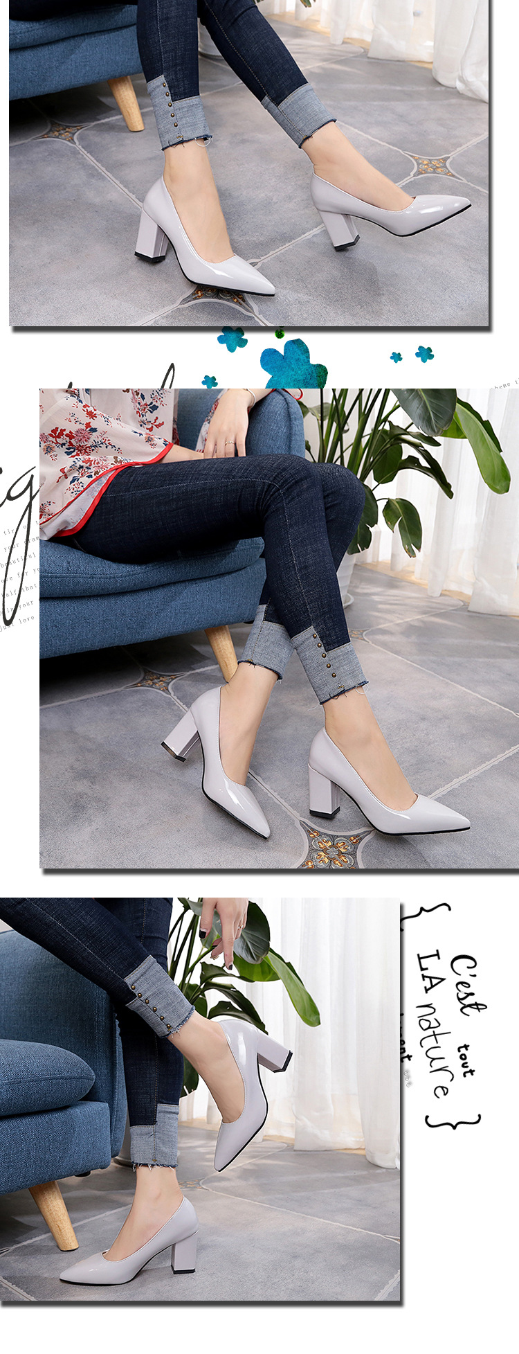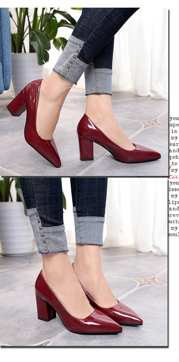 하이힐 여성의 2024 새로운 여성 신발 봄 유럽과 미국의 뾰족한 발가락 얕은 입 싱글 신발 여성의 청키 힐 미드 힐 패션 신발 크기 43스토어 가기