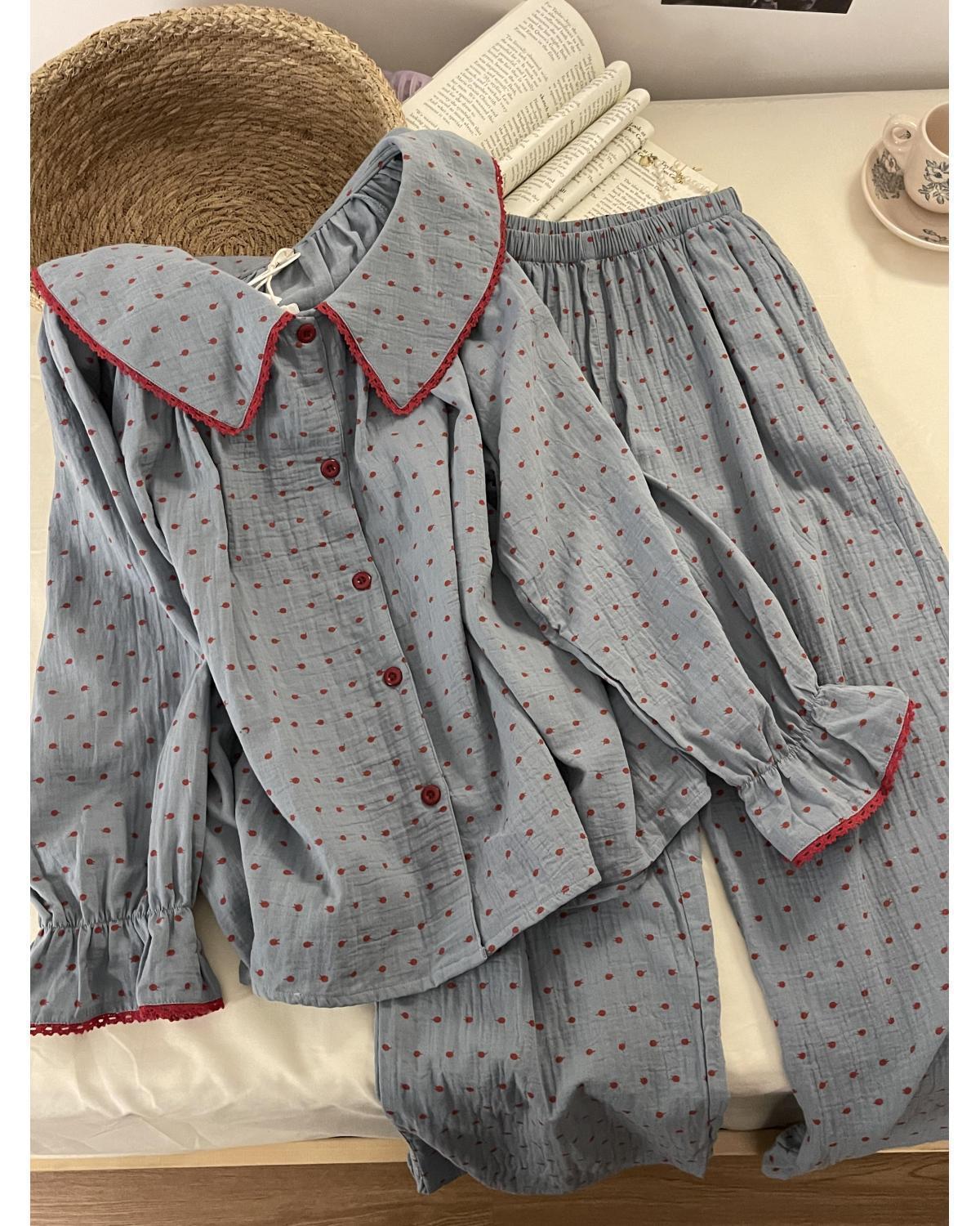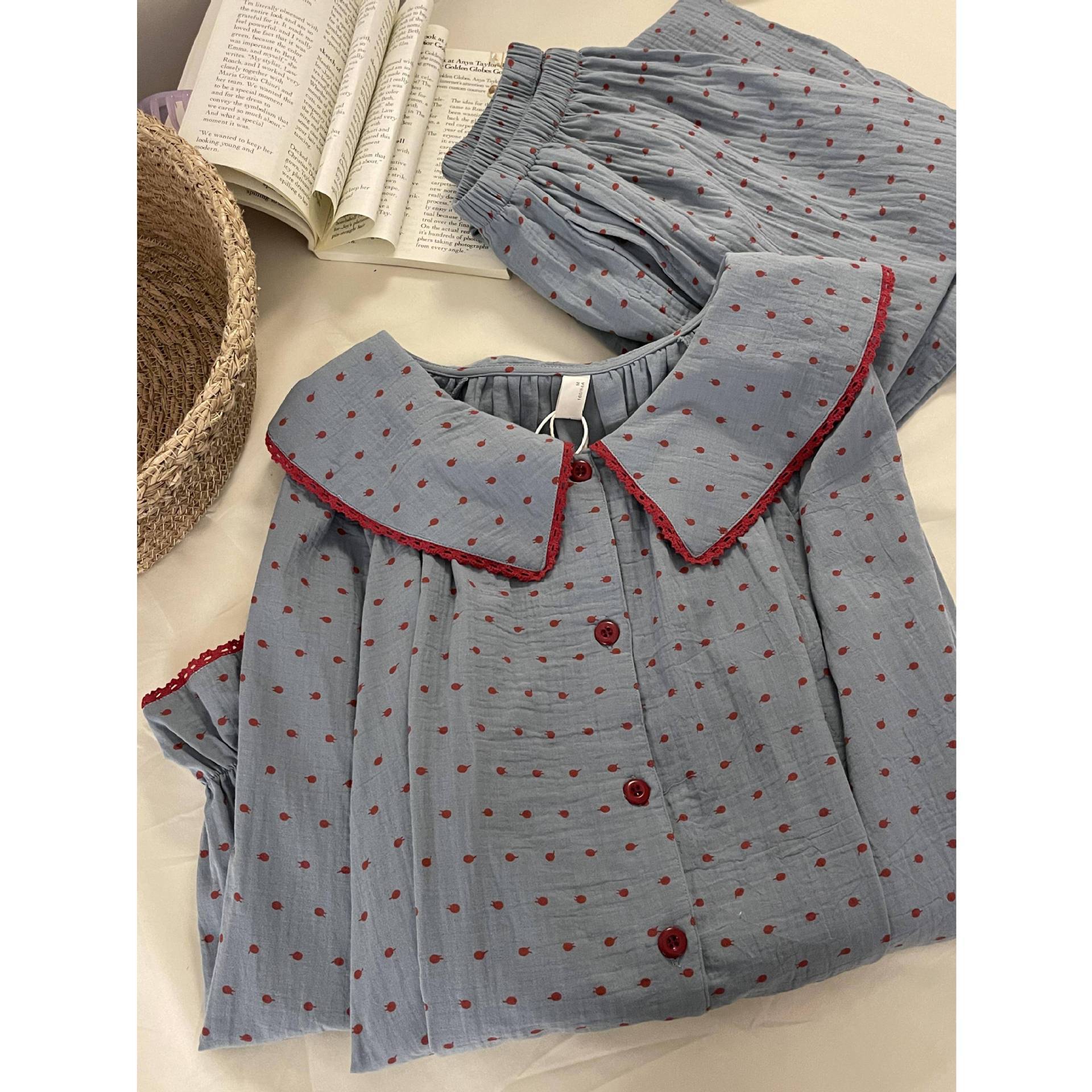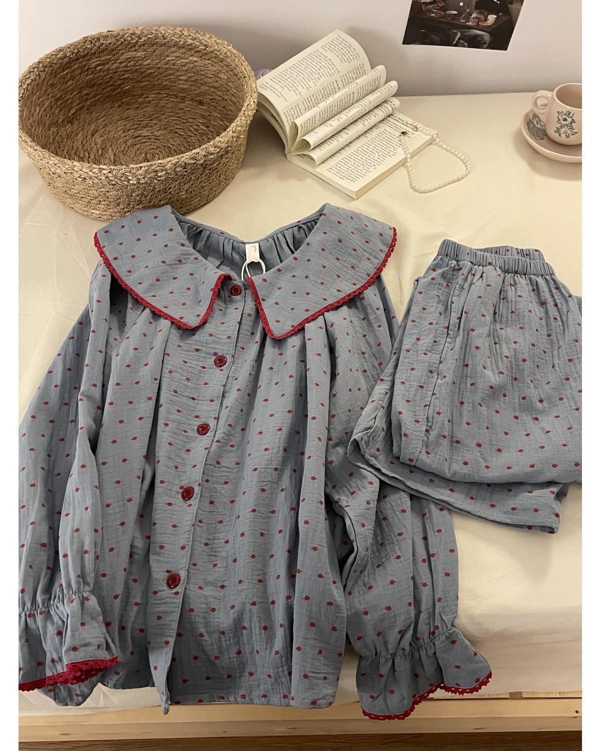 한국 스타일 귀여운 웨이브 도트 인형 칼라 파자마 여성 가을 구름 면 느슨한 긴 소매 학생 기숙사 홈 옷 세트스토어 가기