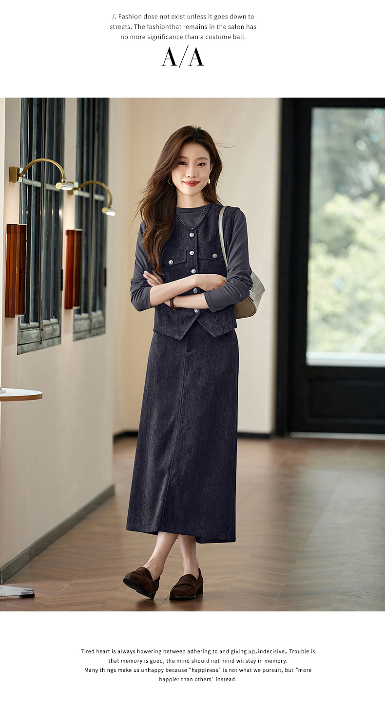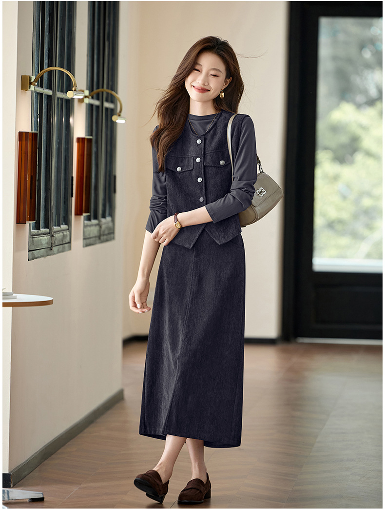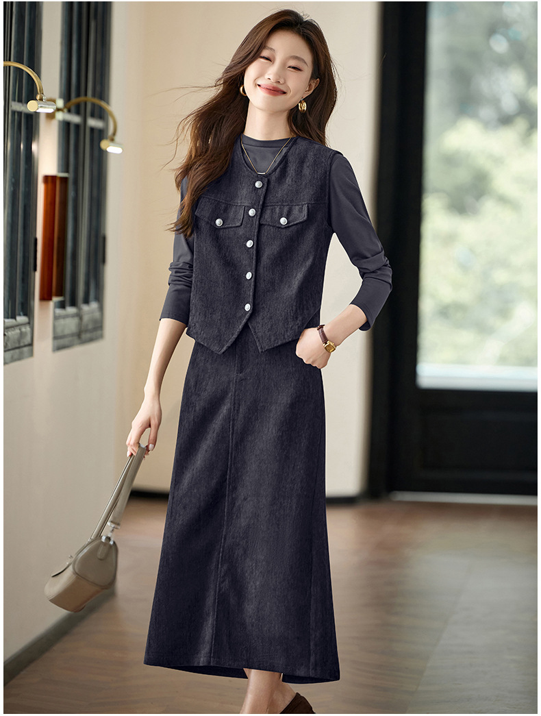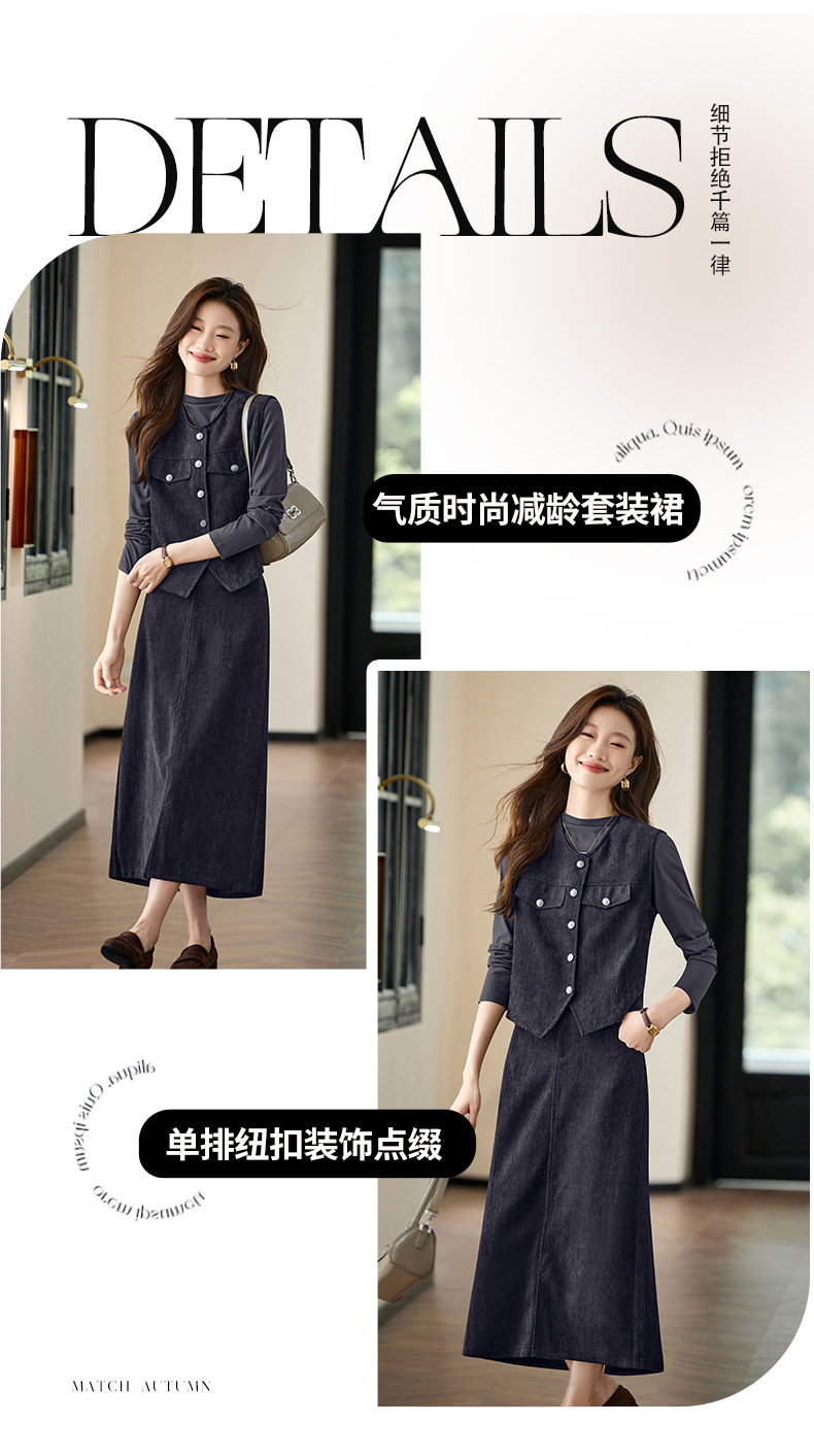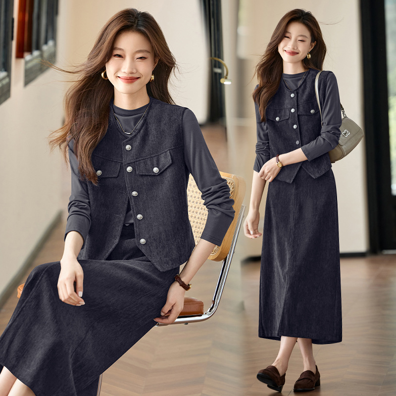 패션 세트 가을 새로운 여성 슬림 우아한 우아한 조끼 긴 소매 티셔츠 3 조각 스커트 YL680스토어 가기