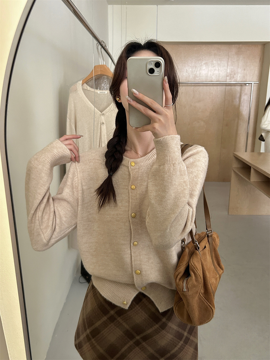2025년 신상품! 한국 스타일 고품질 12색 여성 캔디 컬러 골드 버튼 기본형 라운드넥 니트 가디건