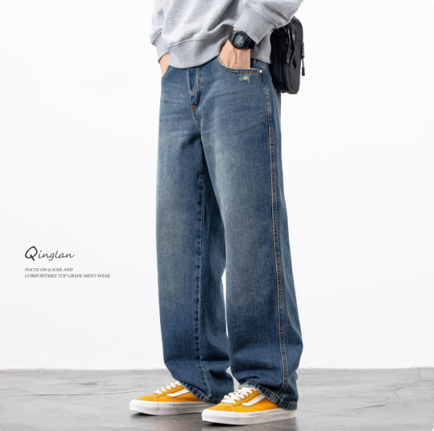 씨쿠즈 아메리칸 스타일 클린핏 블루 스트레이트 진 남성용 가을 레트로 워싱 루즈핏 캐주얼 롱 팬츠