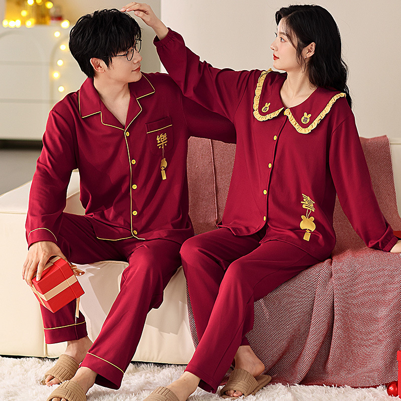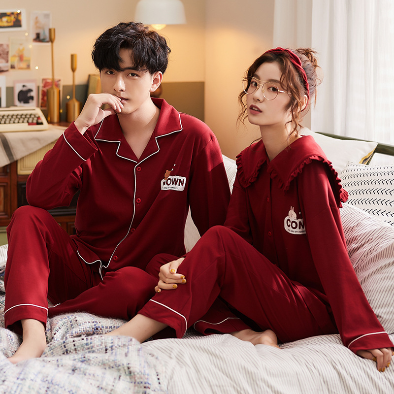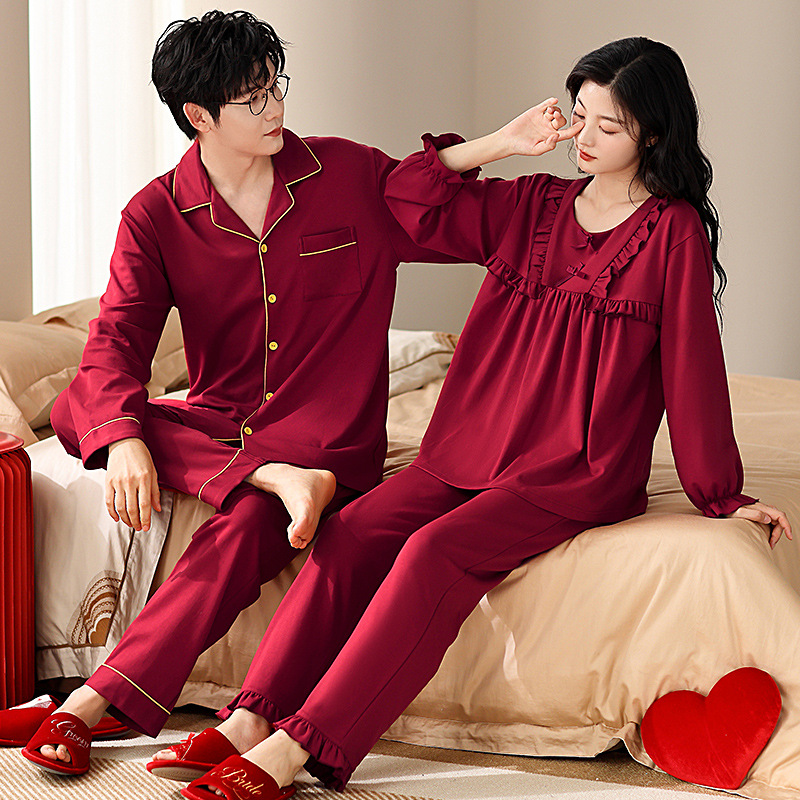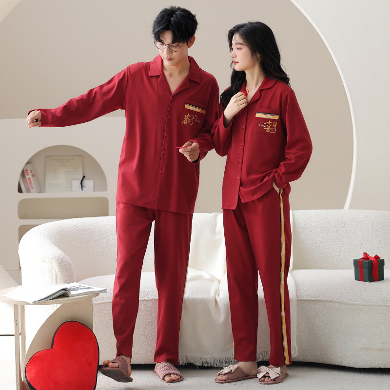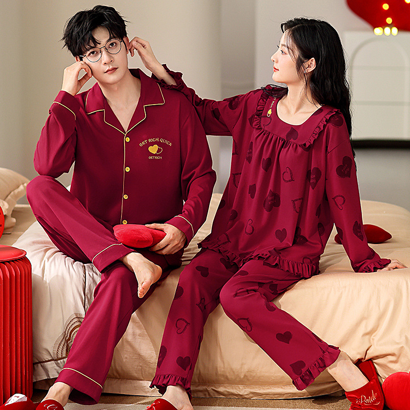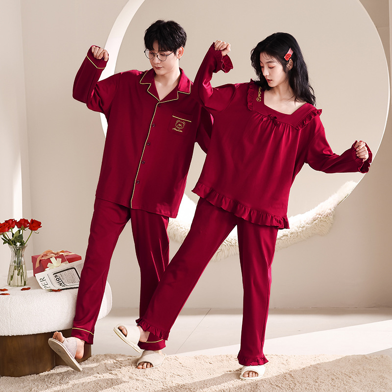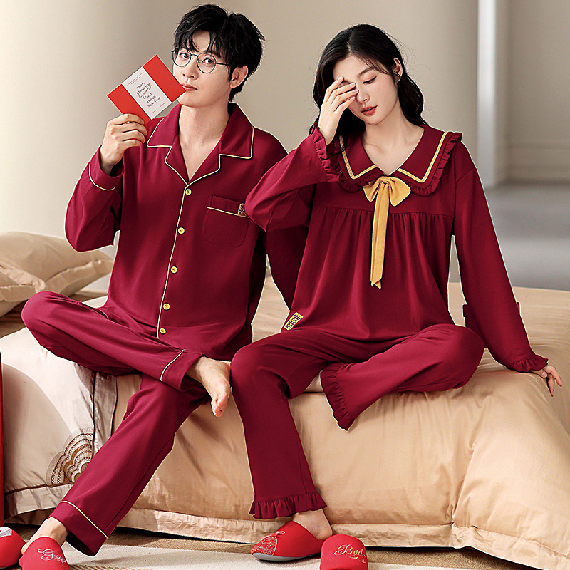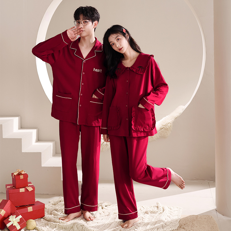 순면 레드 커플 잠옷 신혼한 세트 봄과 가을 여성 달콤한 스타일 연못 카디건 남자 홈 옷스토어 가기