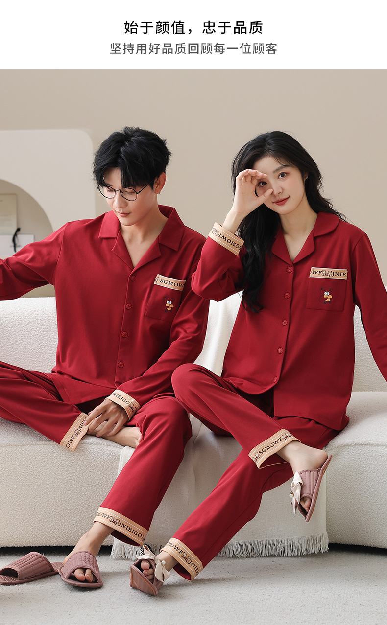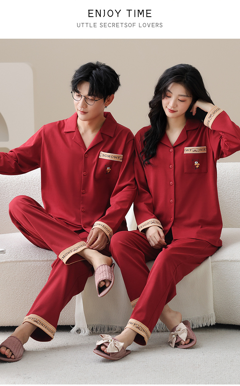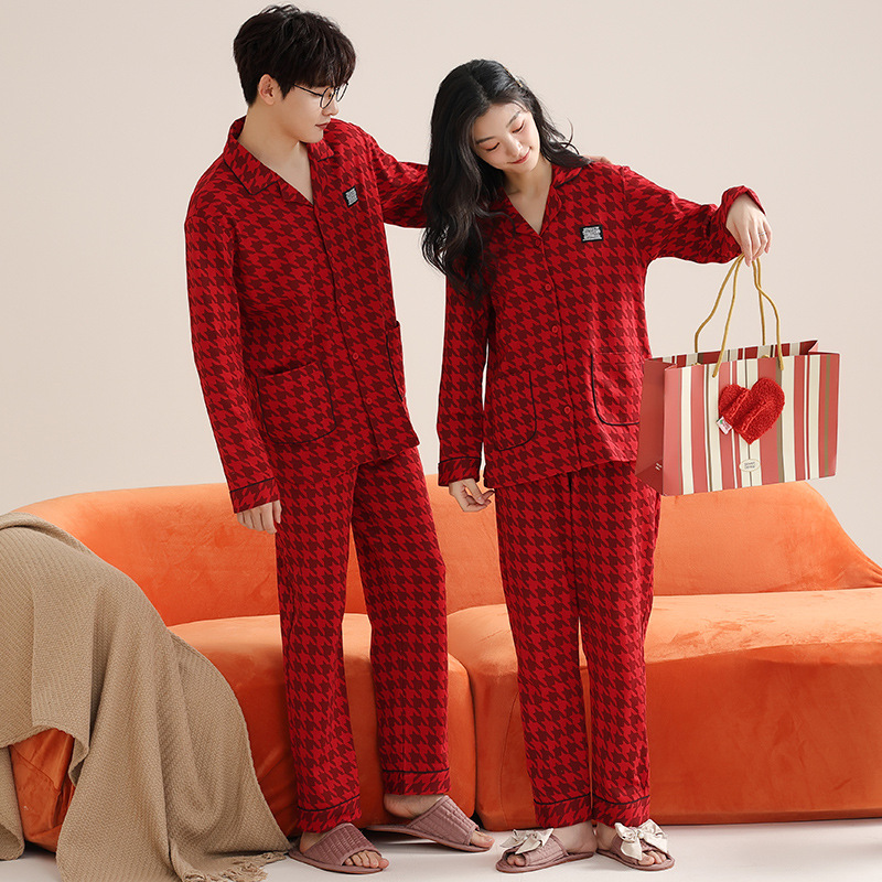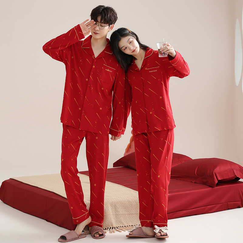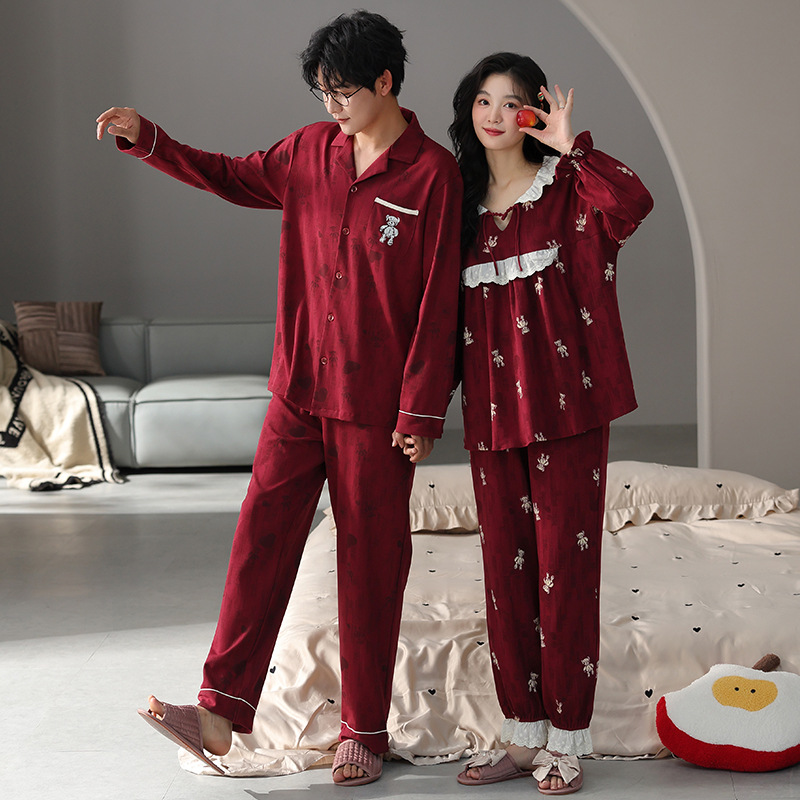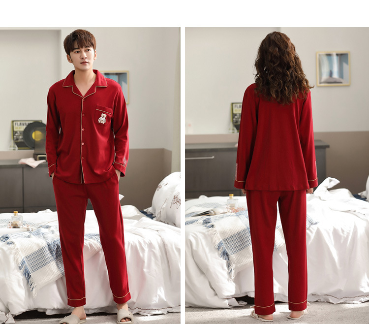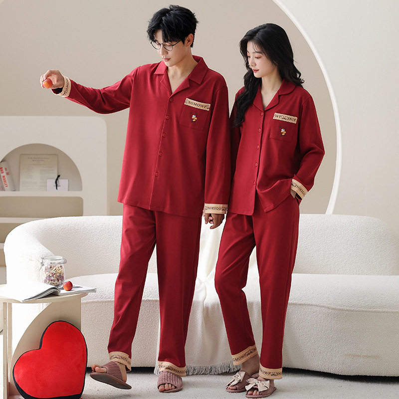 순면 레드 커플 잠옷 신혼한 세트 봄과 가을 여성 달콤한 스타일 연못 카디건 남자 홈 옷스토어 가기