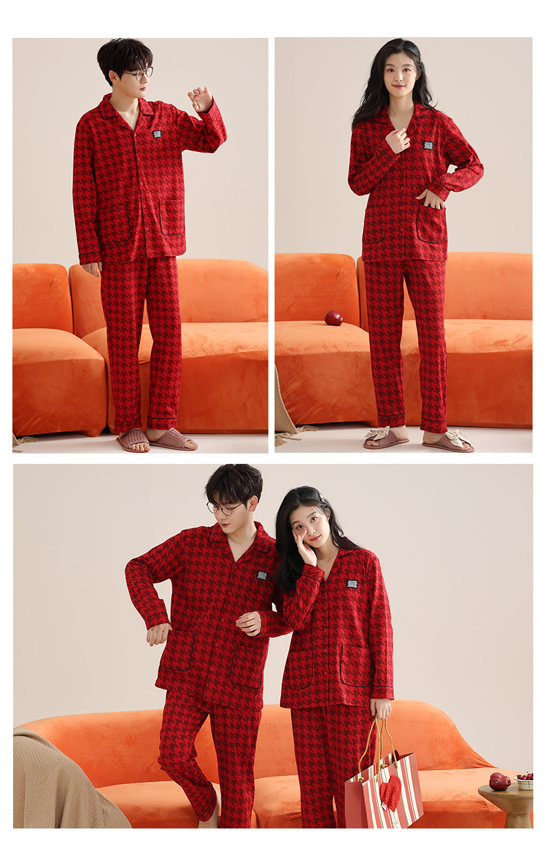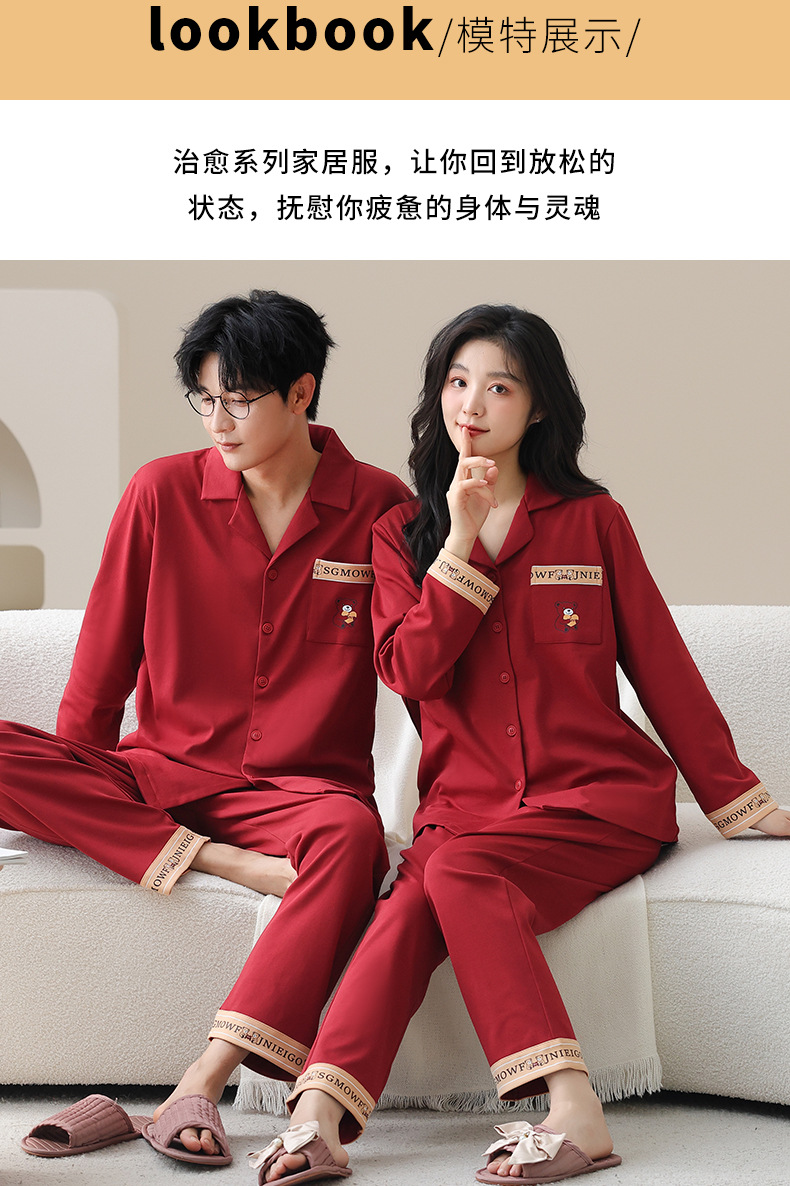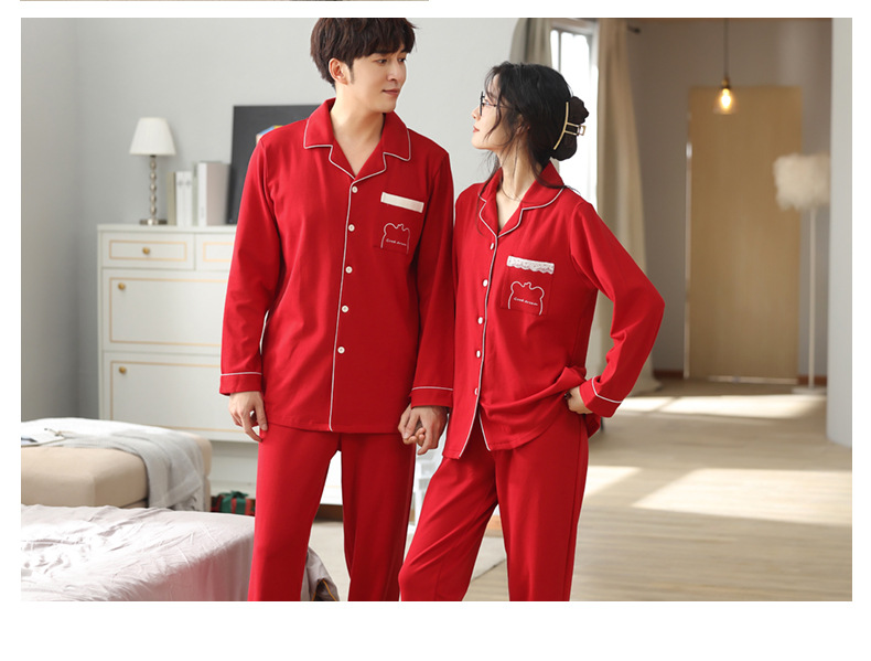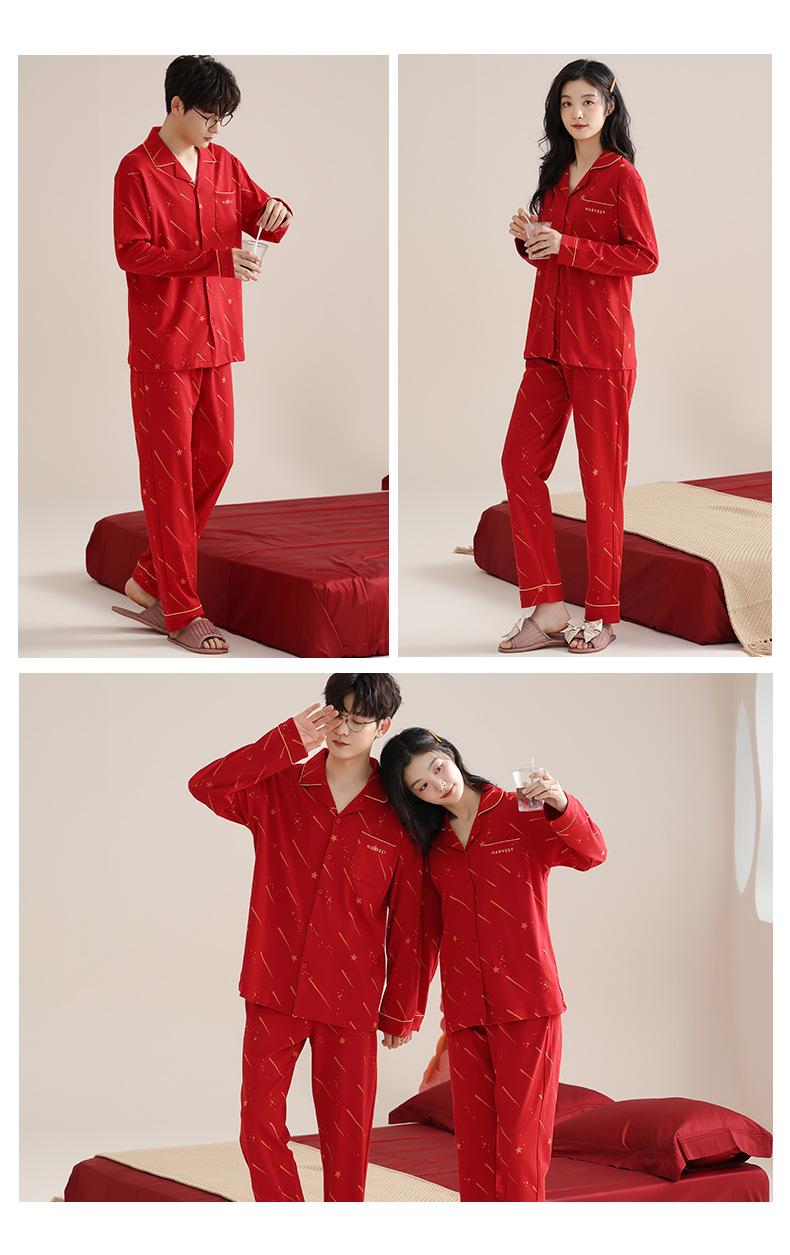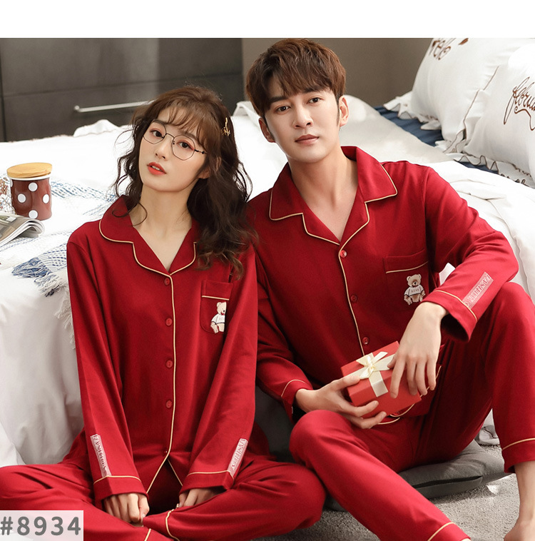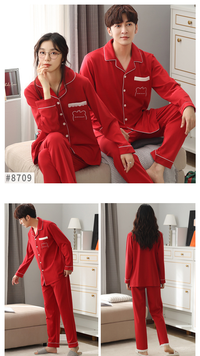 순면 레드 커플 잠옷 신혼한 세트 봄과 가을 여성 달콤한 스타일 연못 카디건 남자 홈 옷스토어 가기
