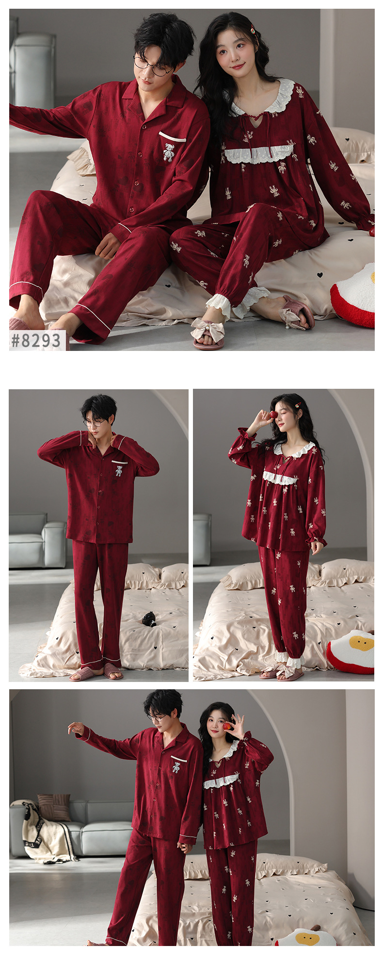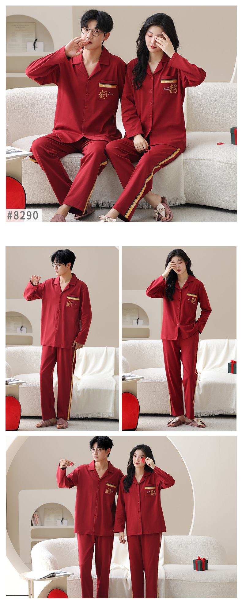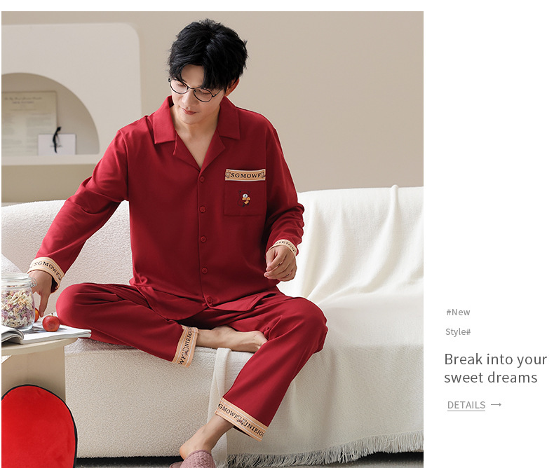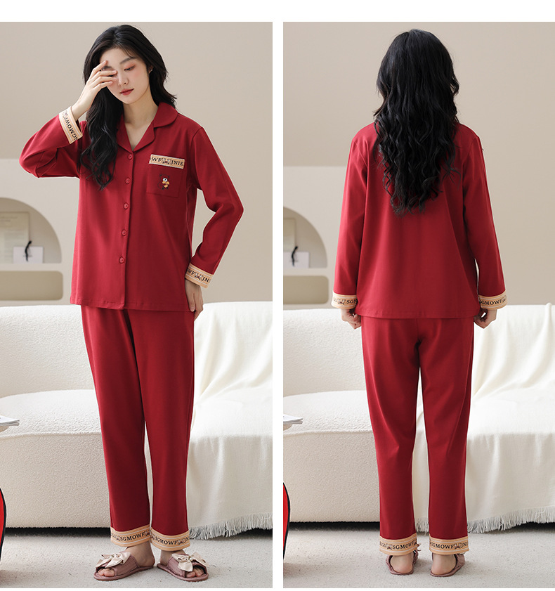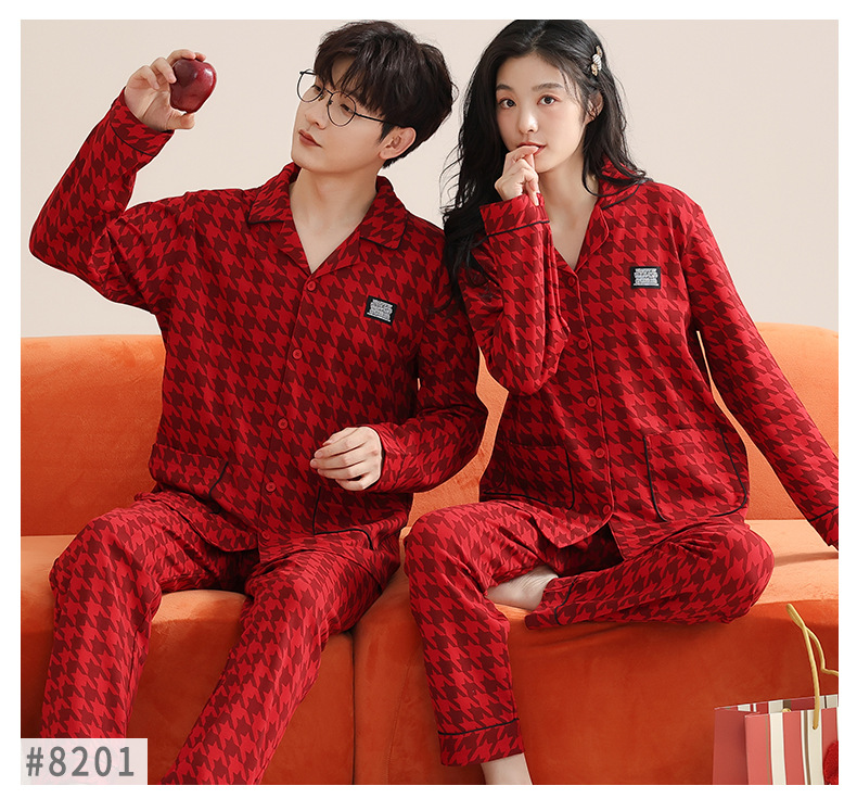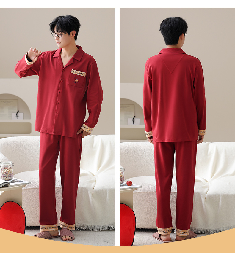 순면 레드 커플 잠옷 신혼한 세트 봄과 가을 여성 달콤한 스타일 연못 카디건 남자 홈 옷스토어 가기