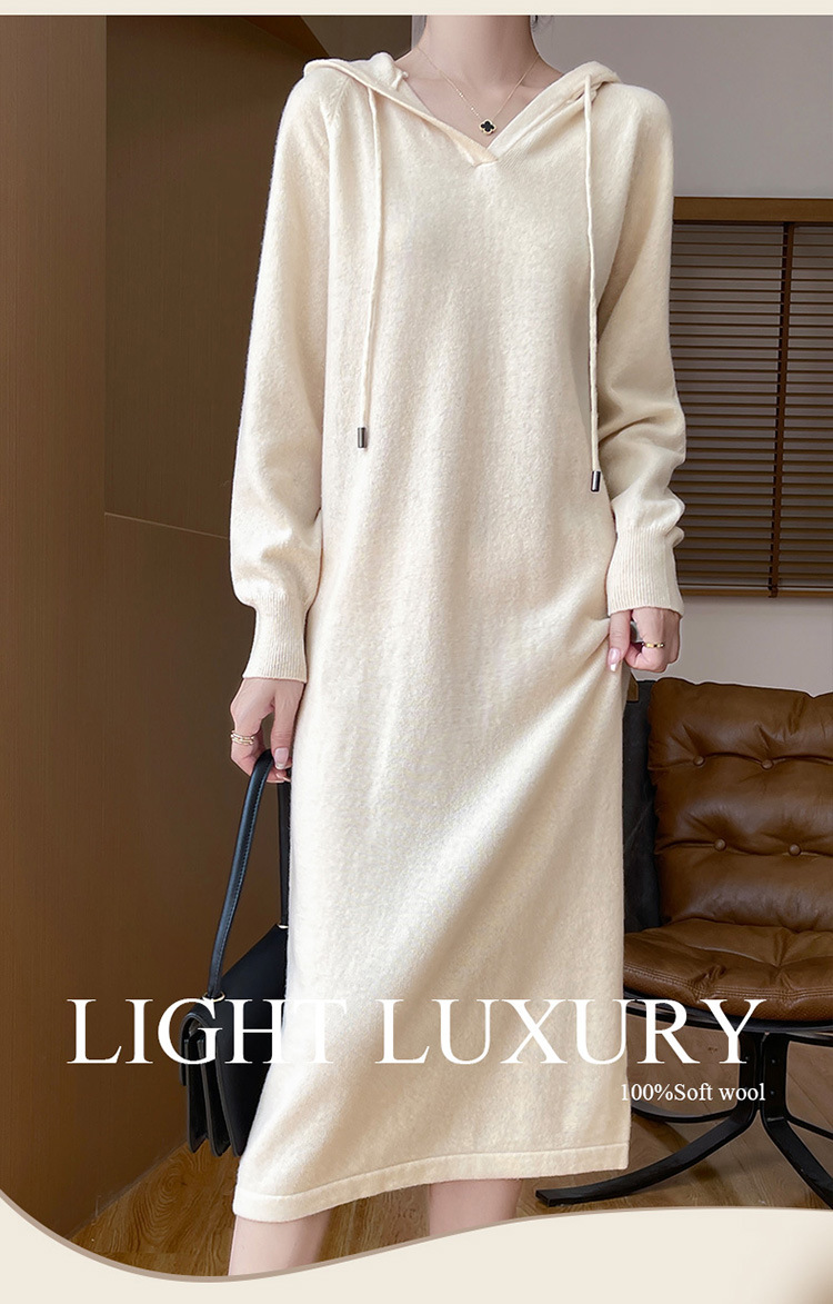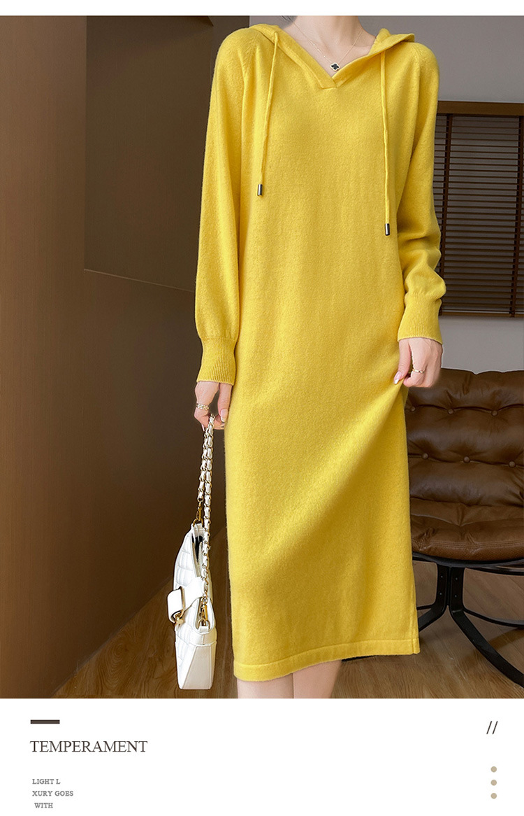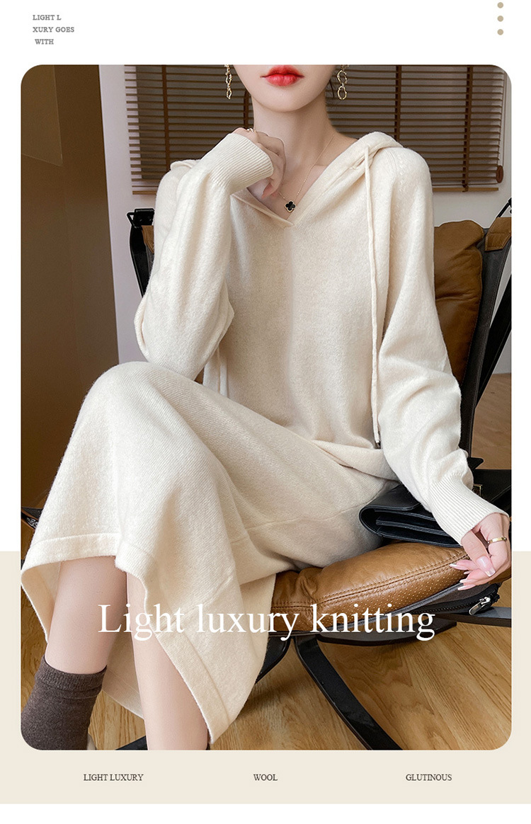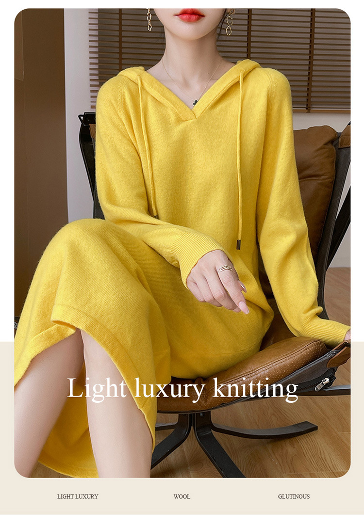 양모 원피스 2024 가을/겨울 새로운 캐주얼 느슨한 니트 스커트 무릎 위에 후드 스웨터 원피스 착용