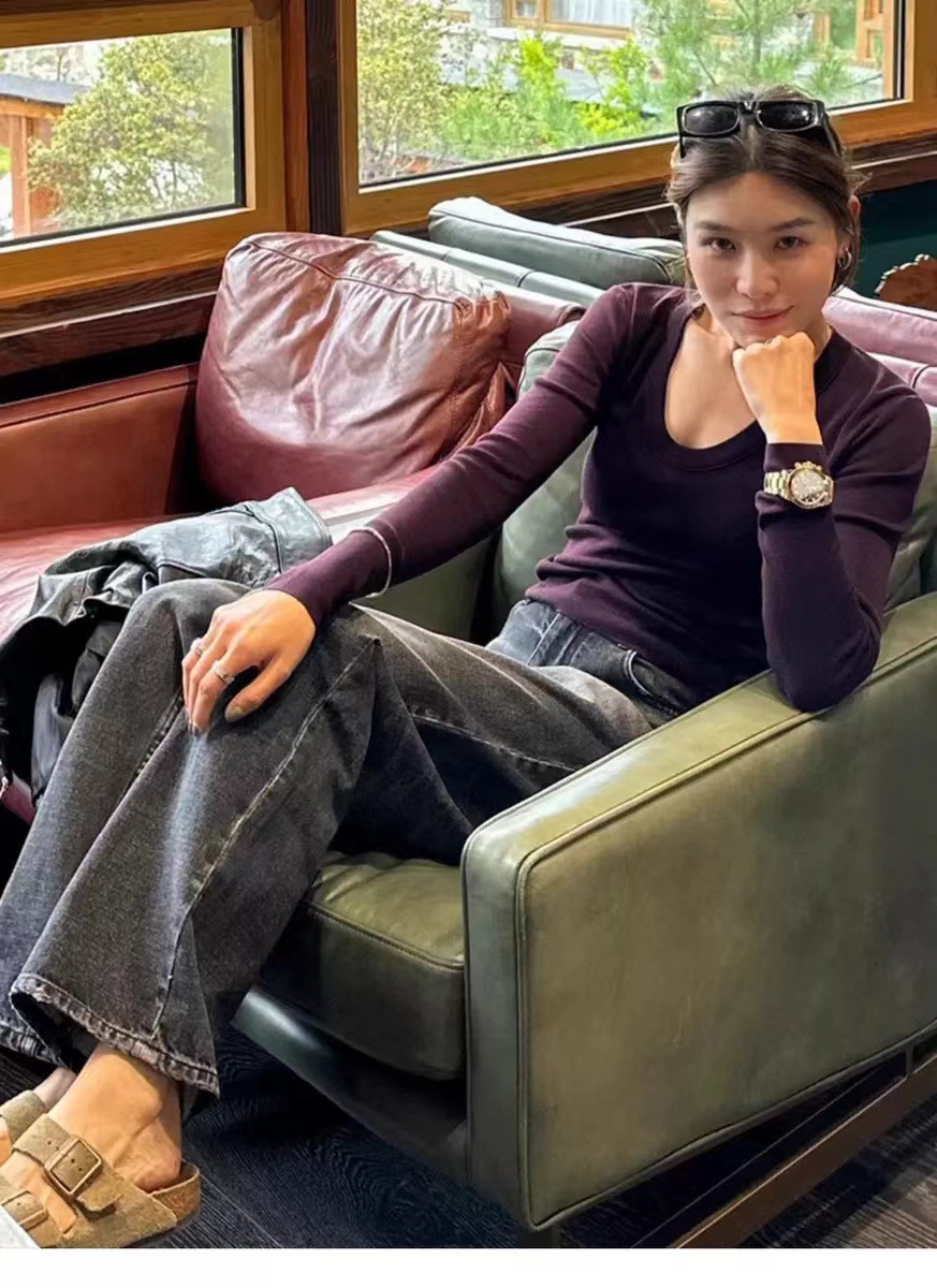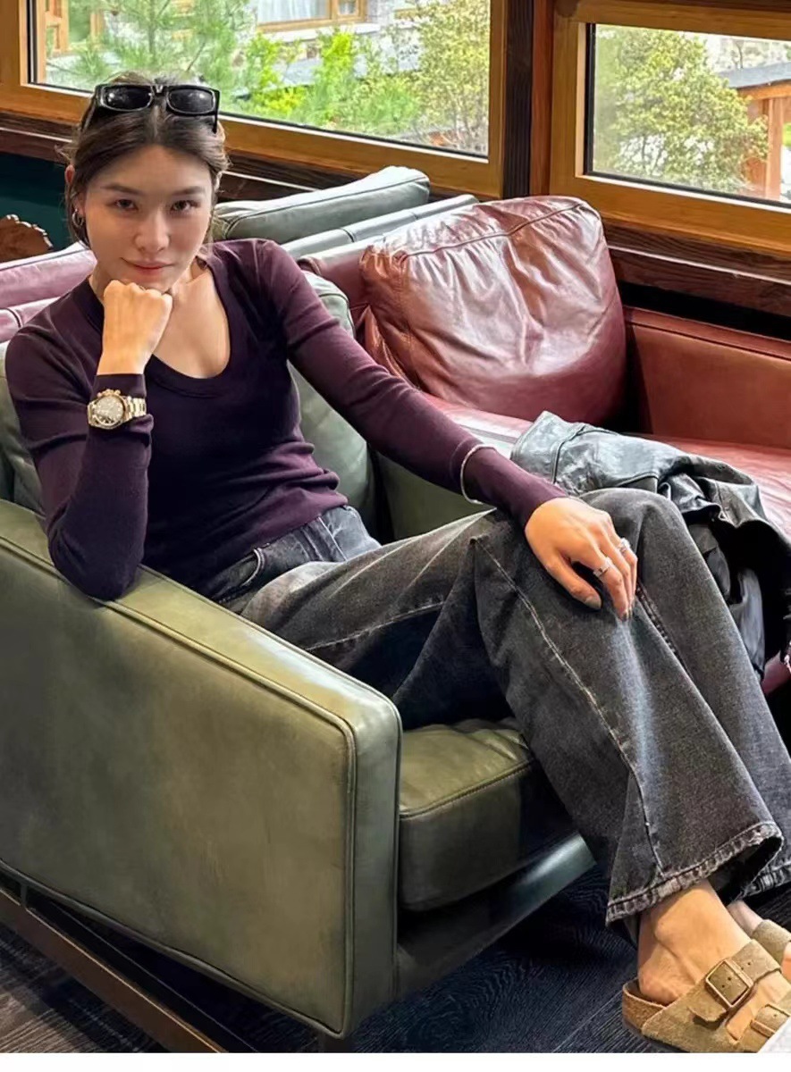 紫色针织U领长袖正肩T恤毛衣打底衫女秋季高级感气质修身内搭上衣