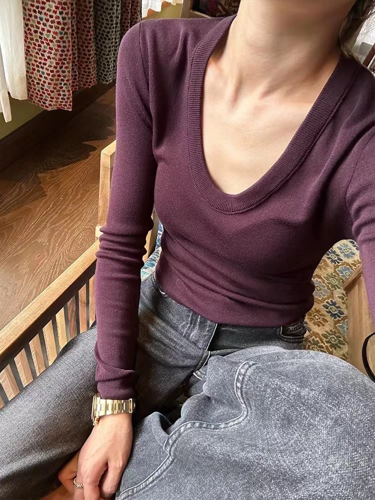 보라색 니트 U 넥 긴팔 어깨 티셔츠 스웨터베이스 셔츠 여성용 가을 고급 우아한 슬림 안쪽 탑스토어 가기