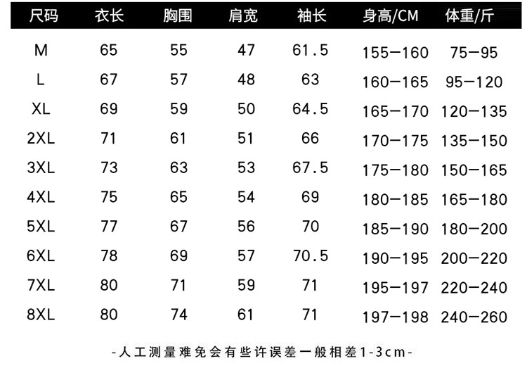跨境好品..社会工厂品质。金属拉链,高品质石墨烯棉衣,批发走量,有质有量,量大联系客服, 手工测量量法不同可能出现的数值不一样 具体请咨询客服 平均重量约680克左右 最大码8XL克重约810克左右