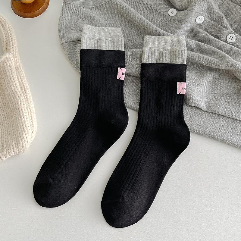 양말 여성용 더블 레이어 스티칭 대비 컬러 힐 패브릭 라벨 중간 길이 양말 Ins 유행 스포츠 스타일 스택 양말