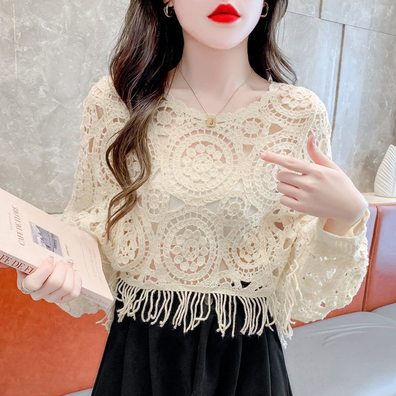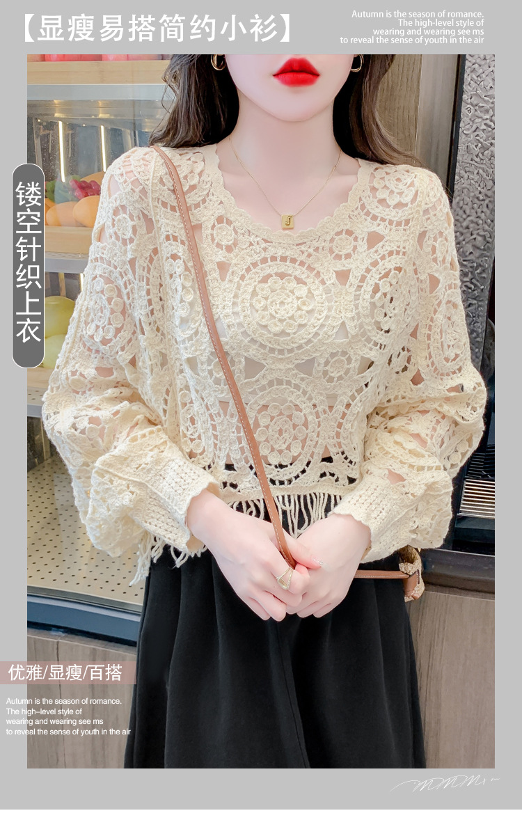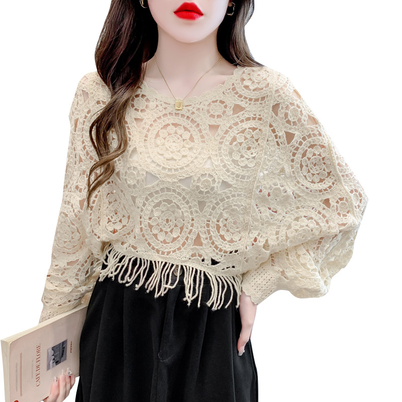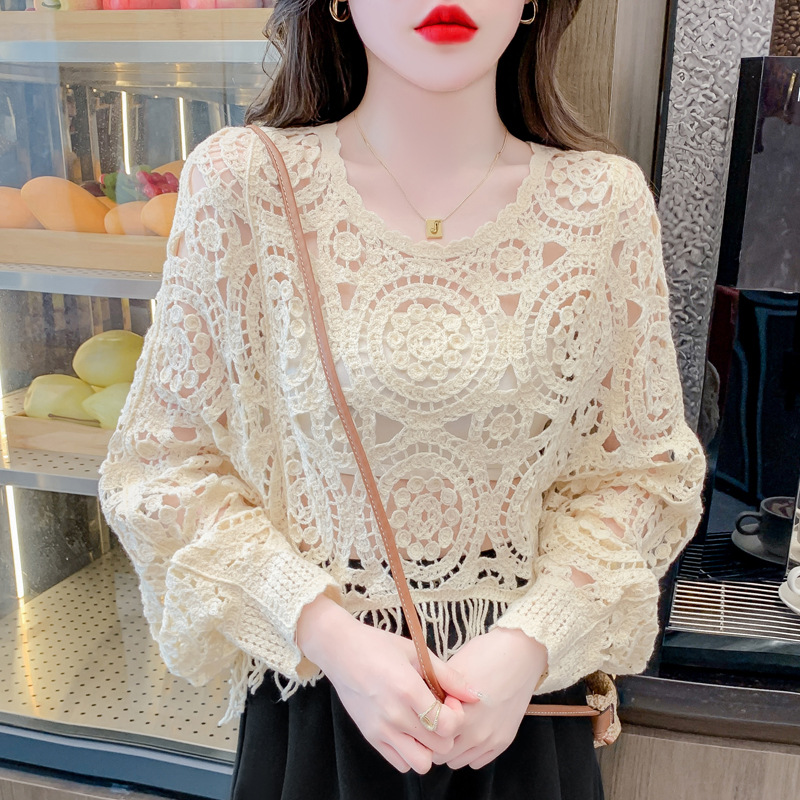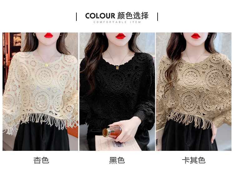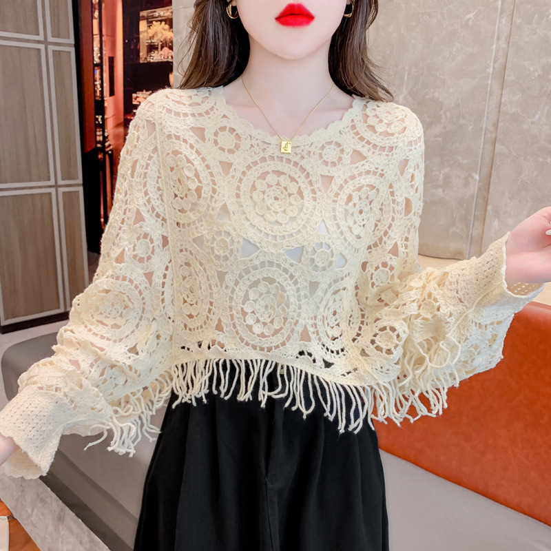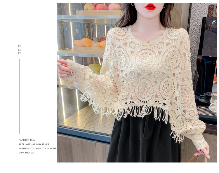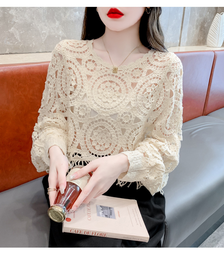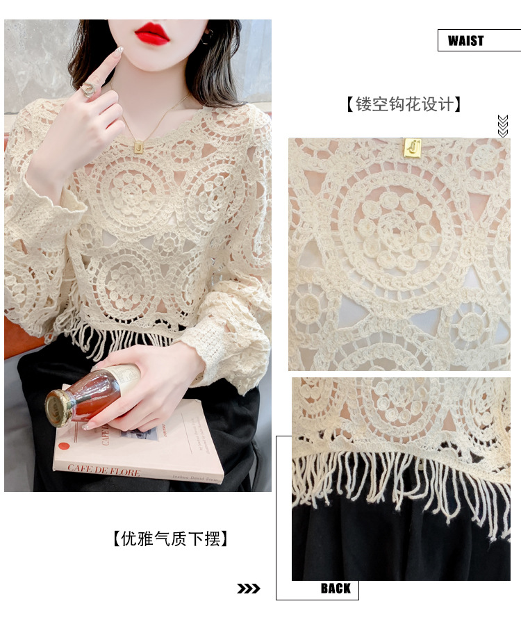 슬리밍 올 매치 크로 셰 뜨개질 중공 간단한 셔츠 매트 긴 소매 풀오버 단색 대기 레트로 라운드 넥 탑
