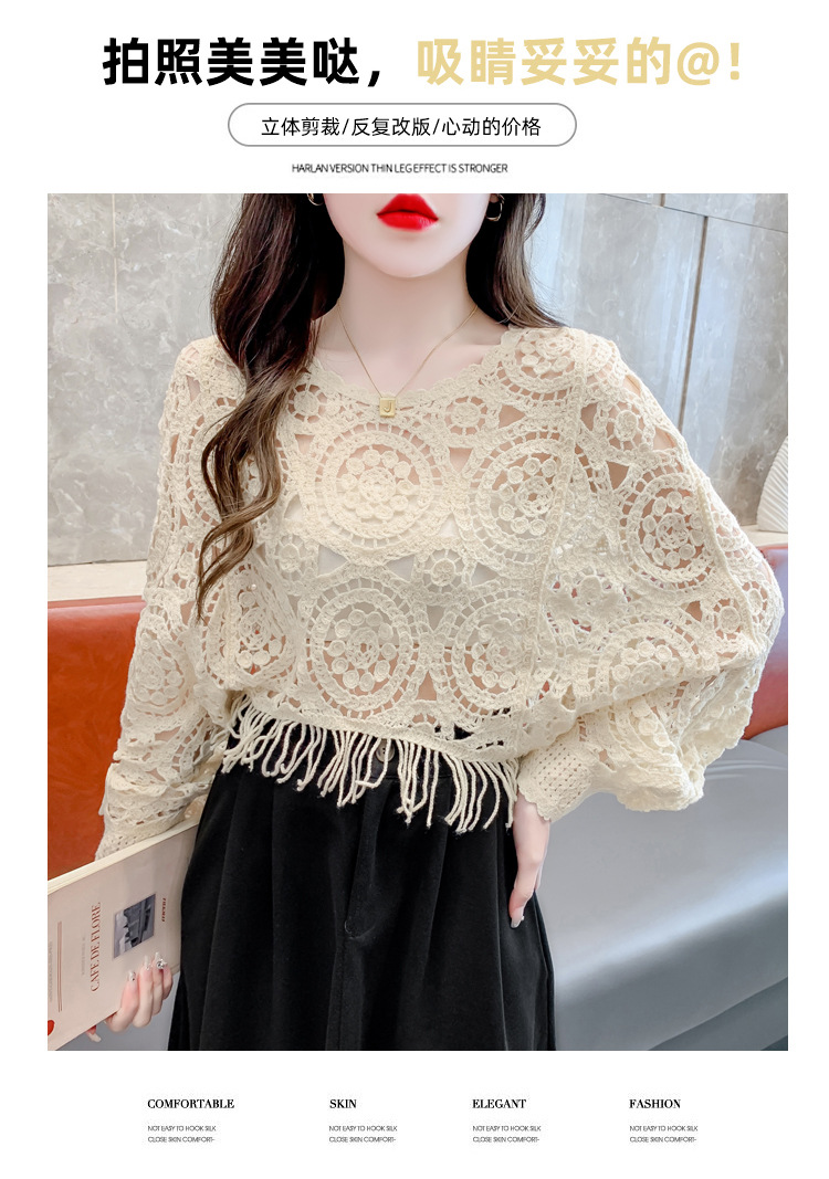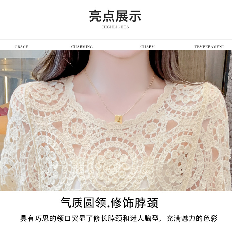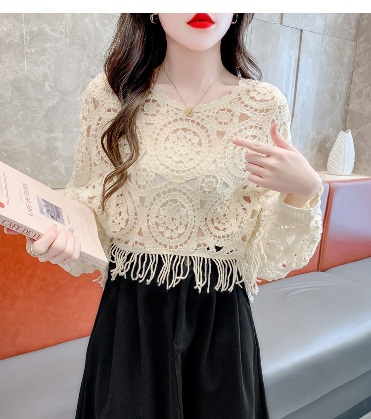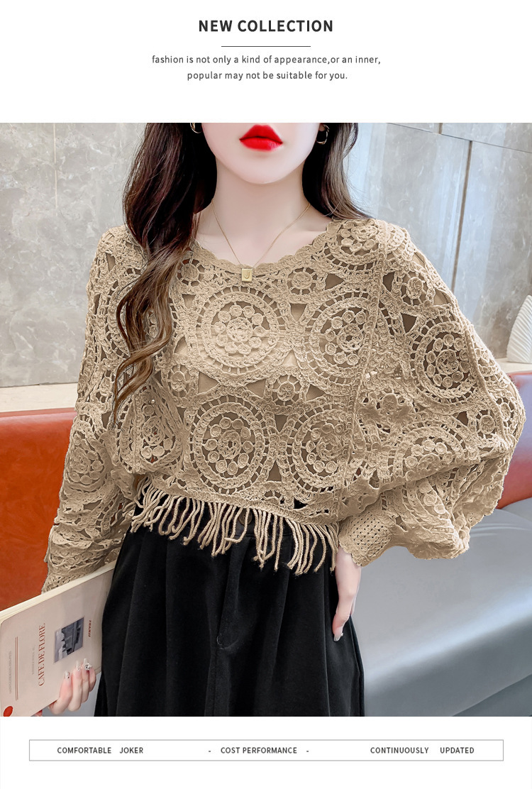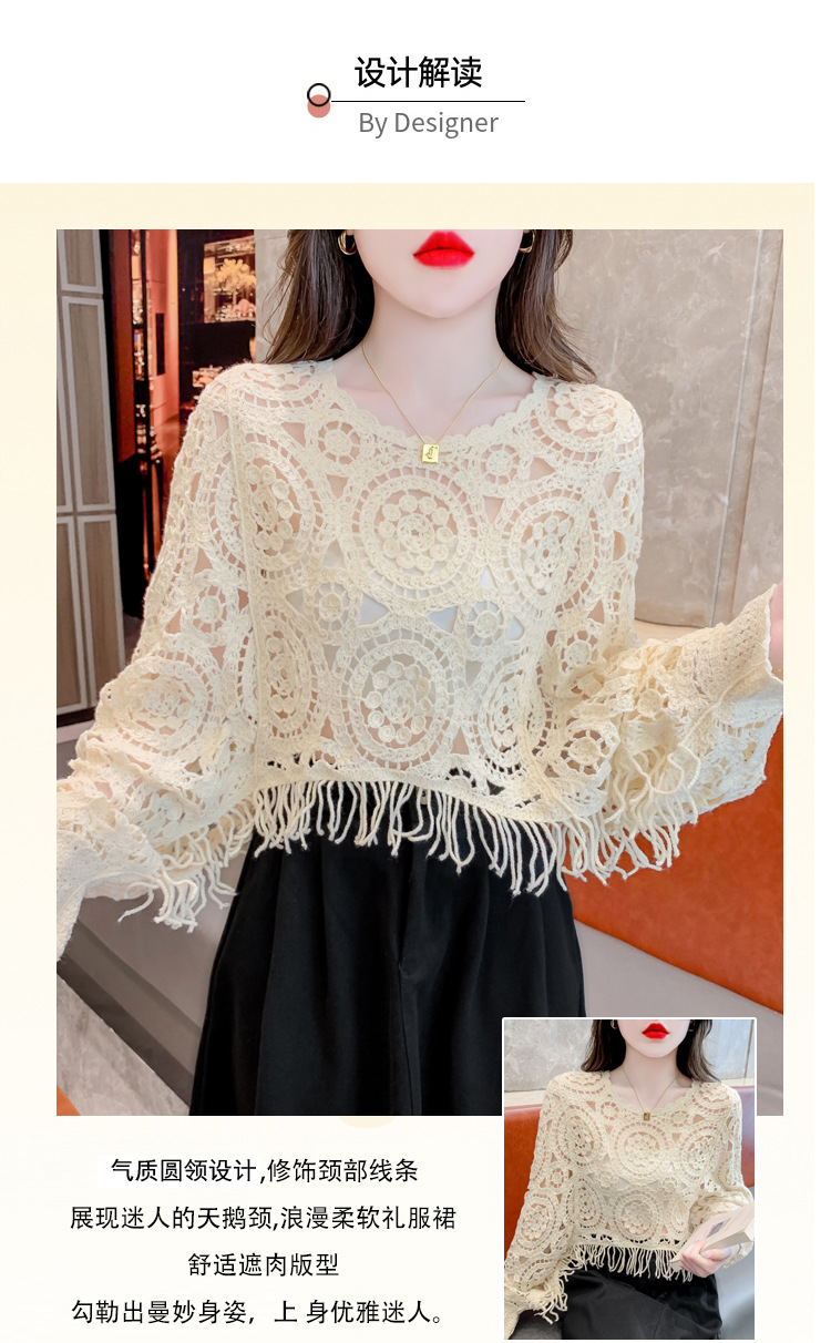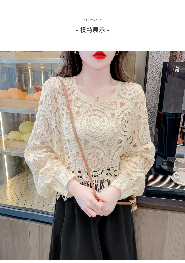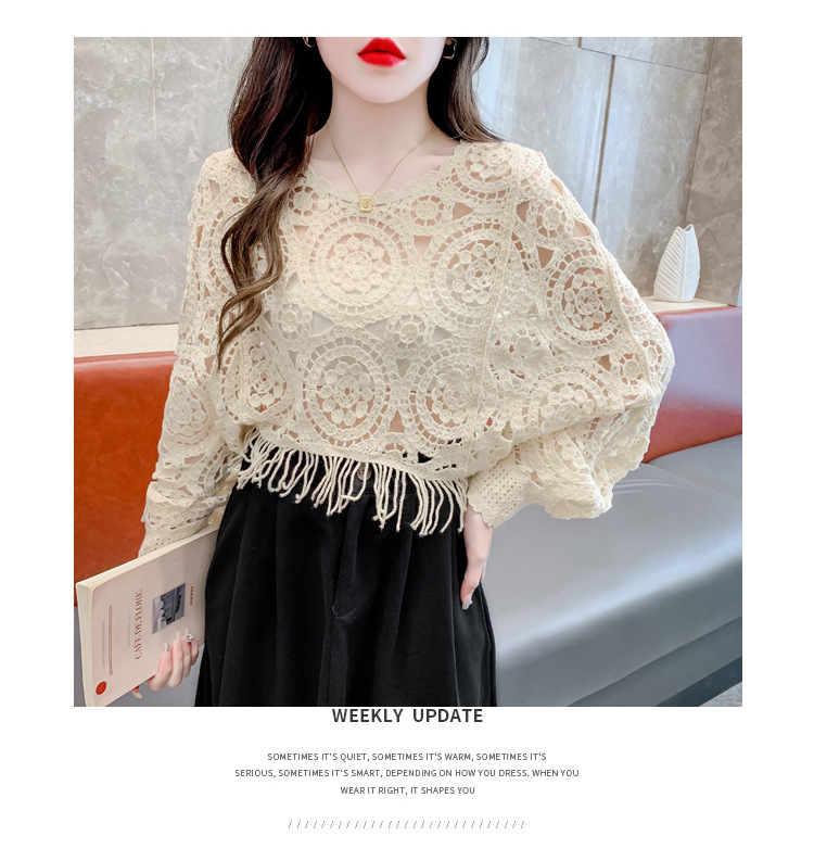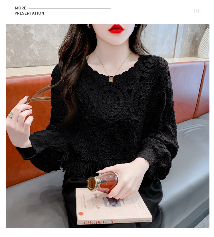 슬리밍 올 매치 크로 셰 뜨개질 중공 간단한 셔츠 매트 긴 소매 풀오버 단색 대기 레트로 라운드 넥 탑
