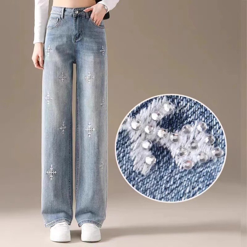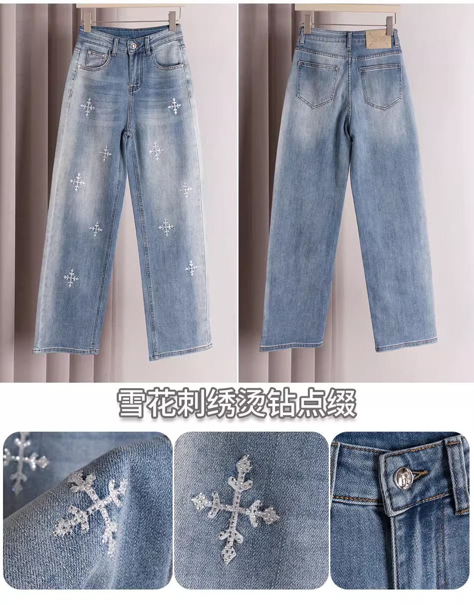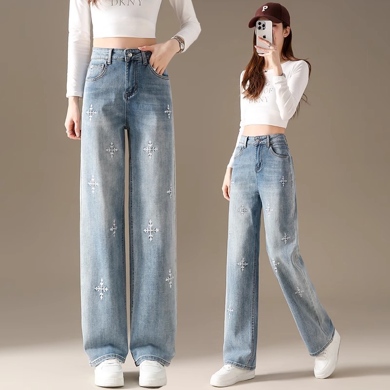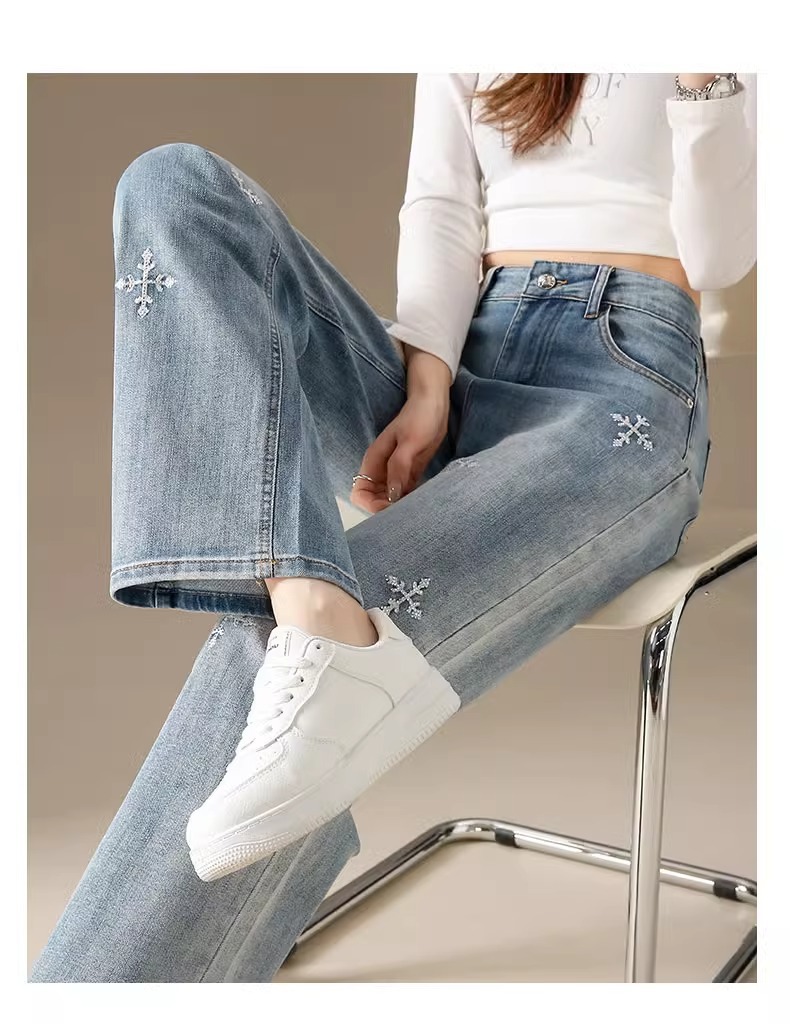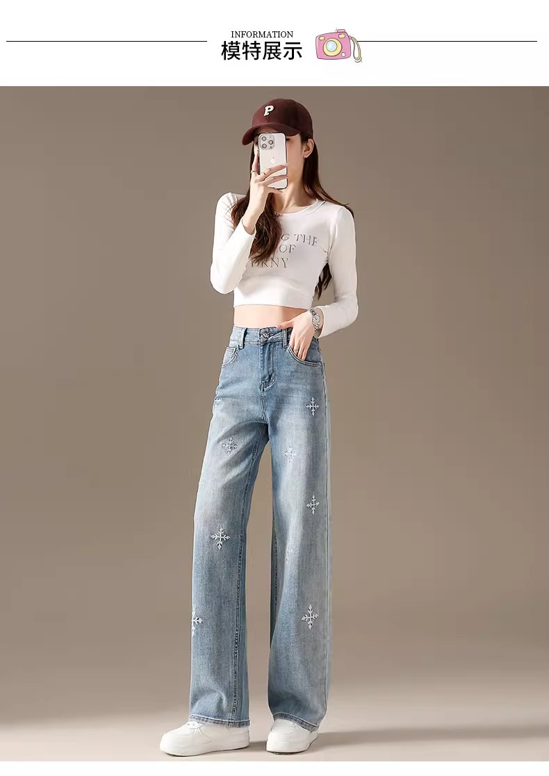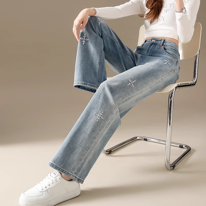 똑바로 좁은 넓은 다리 청바지 여자 2024 새로운 느슨한 높은 허리 침식 눈송이 슬리밍 올매치 스트레이트 팬츠스토어 가기