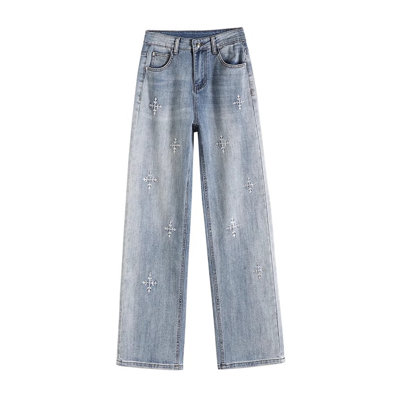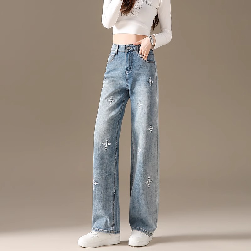 똑바로 좁은 넓은 다리 청바지 여자 2024 새로운 느슨한 높은 허리 침식 눈송이 슬리밍 올매치 스트레이트 팬츠