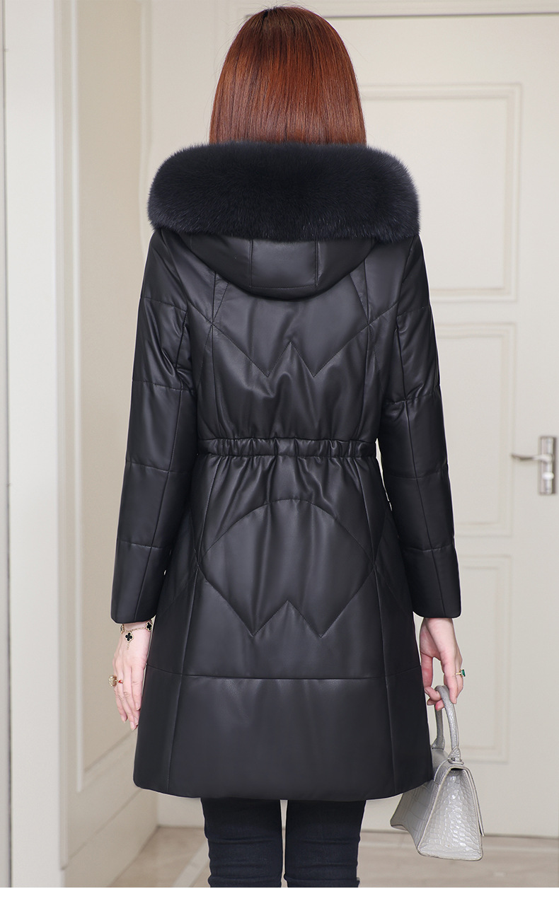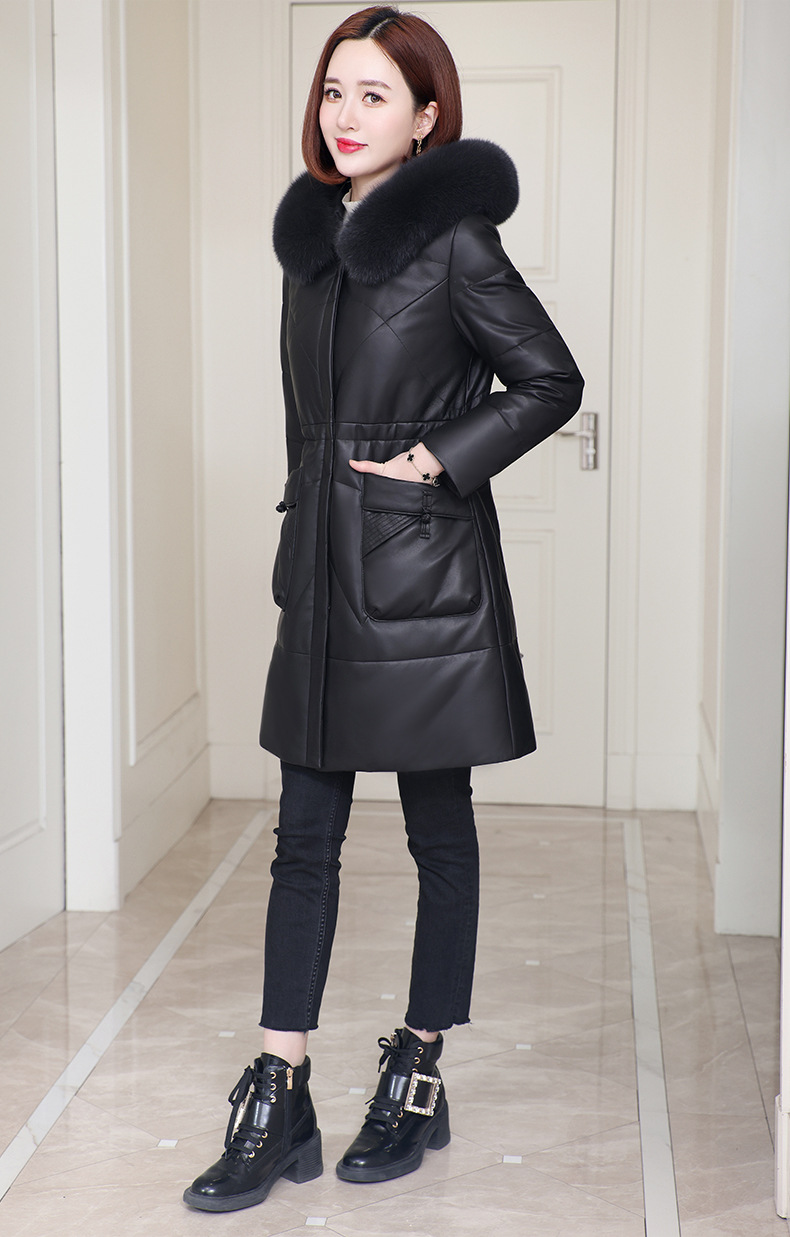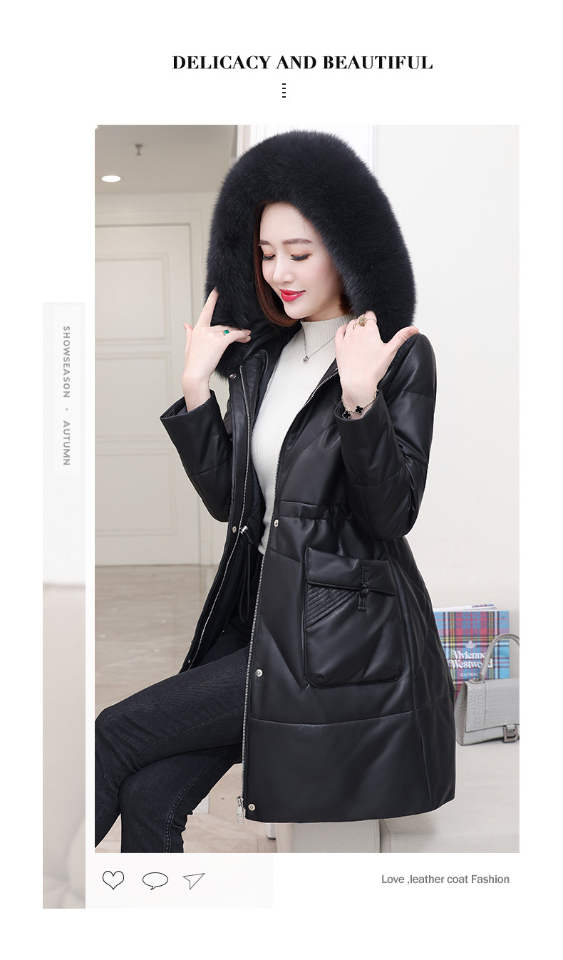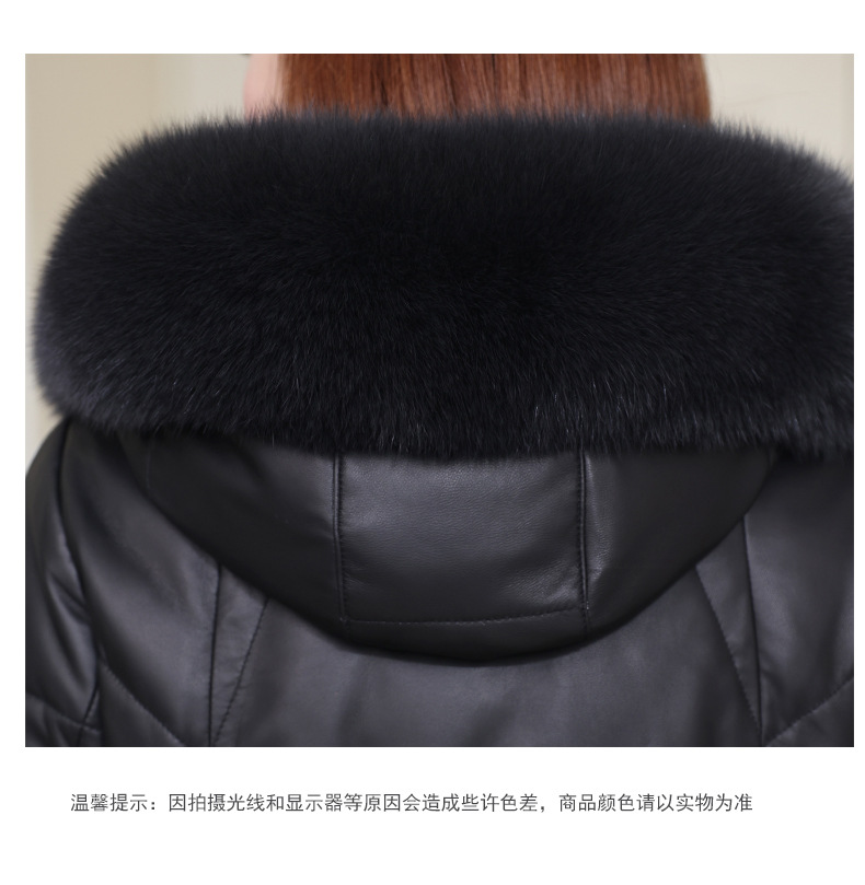 2025년 신상 겨울 헤이닝 천연 가죽 여성 후드 중간 길이 가죽 다운 재킷 양가죽 모피 코트