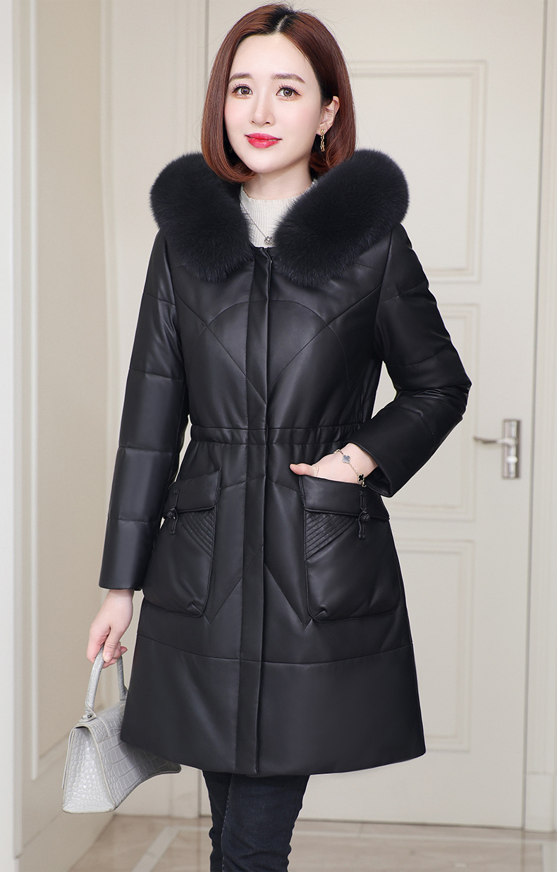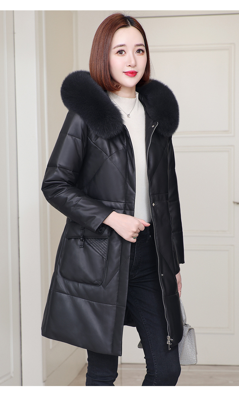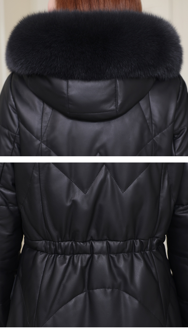 2025년 신상 겨울 헤이닝 천연 가죽 여성 후드 중간 길이 가죽 다운 재킷 양가죽 모피 코트