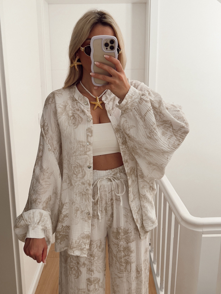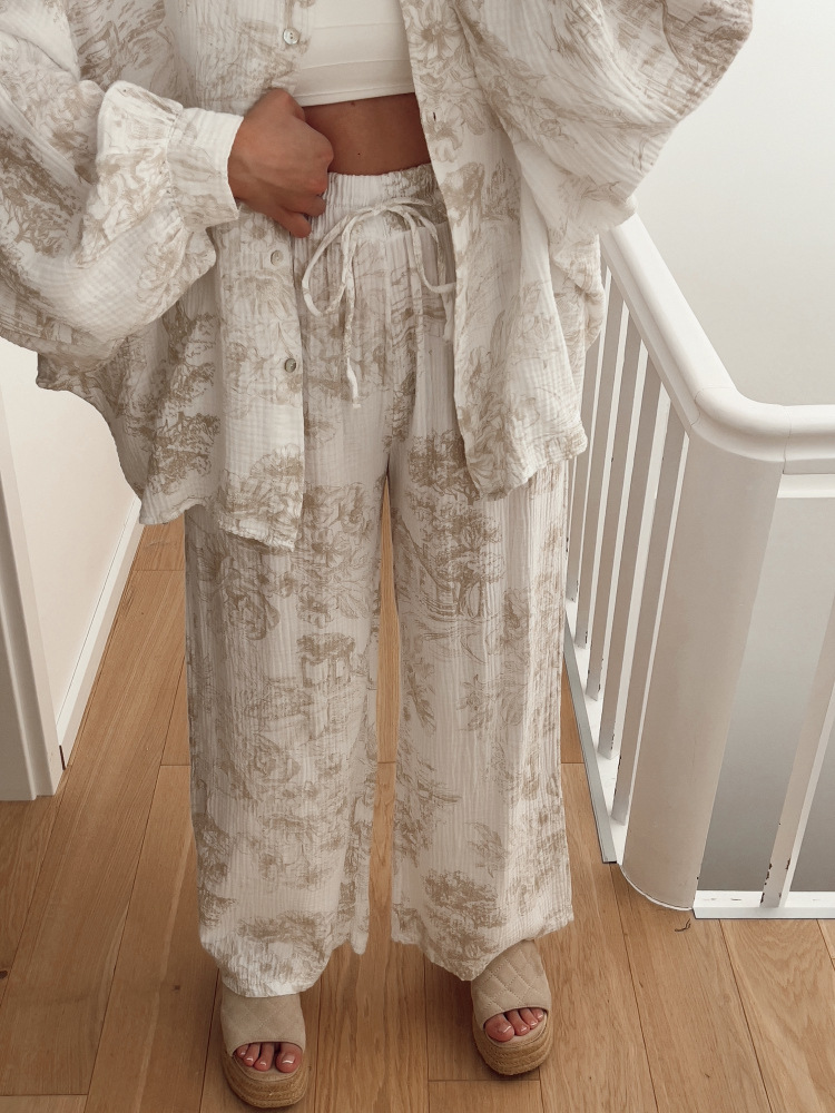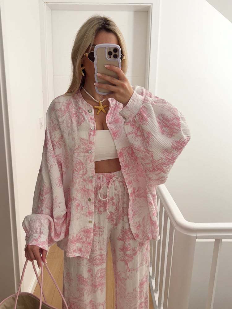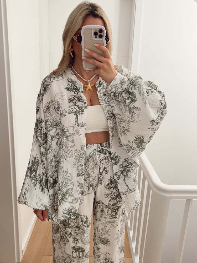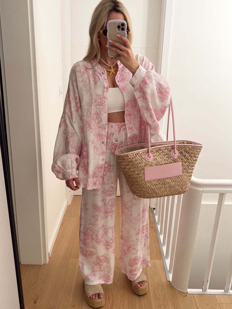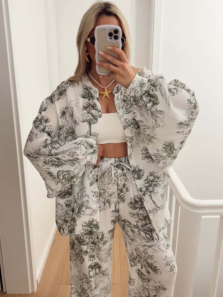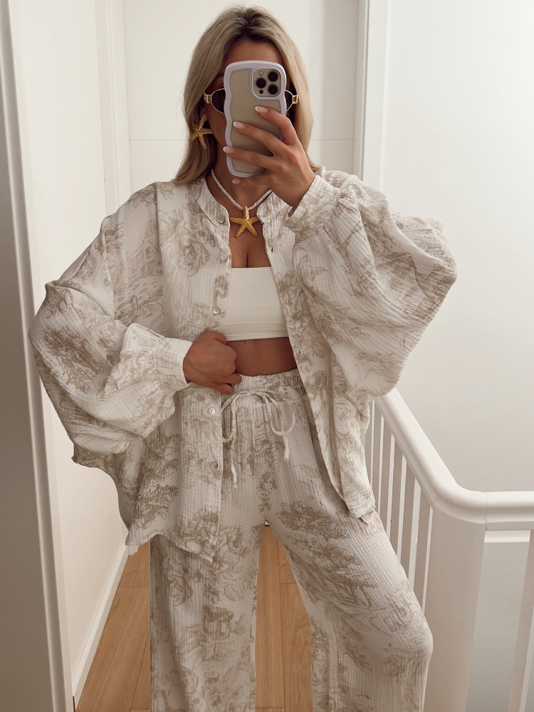 2024 유럽과 미국 스타일의 패션 레저 프린트 긴 소매 셔츠 바지 여성 세트 국경 아마존 투피스 세트