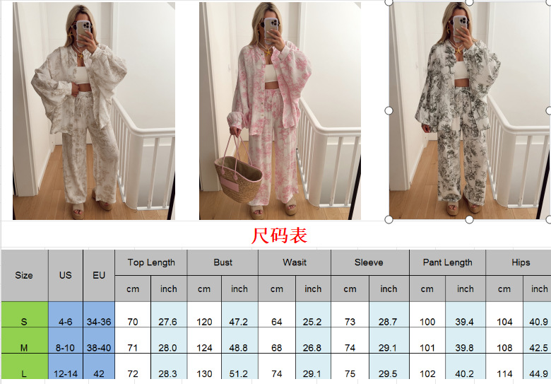 2024 유럽과 미국 스타일의 패션 레저 프린트 긴 소매 셔츠 바지 여성 세트 국경 아마존 투피스 세트스토어 가기