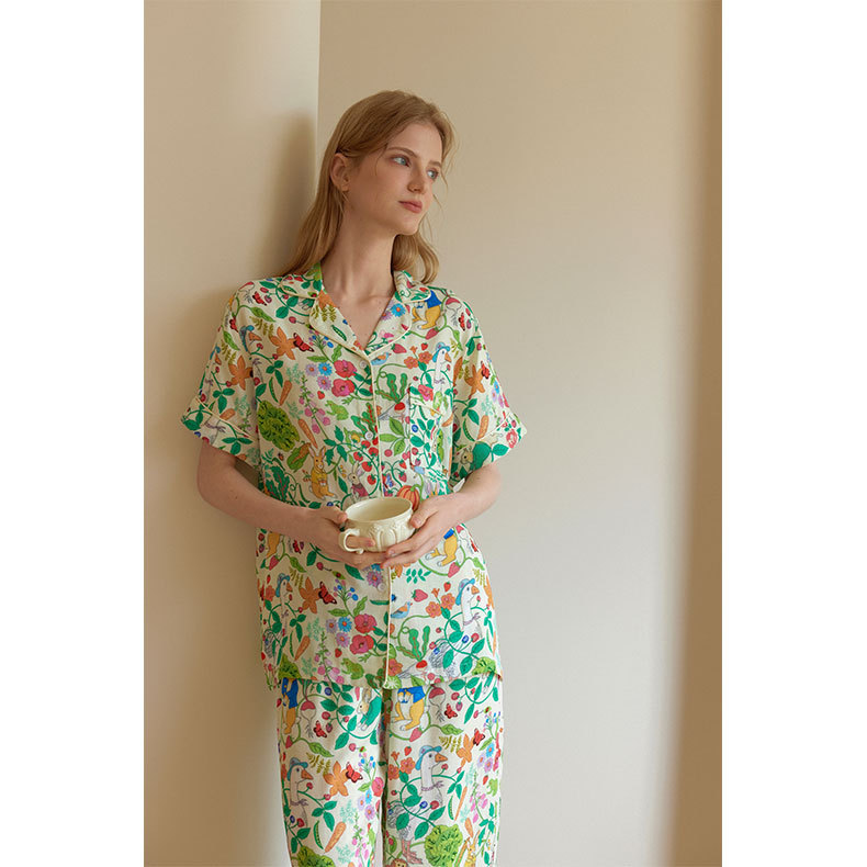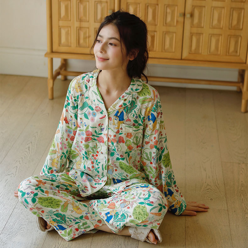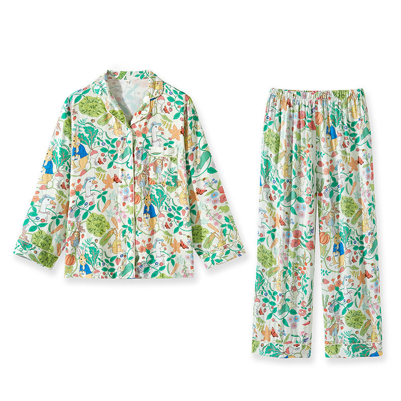 봄과 여름 인기 상품, 천주 섬유 이중 거즈 녹색 잎 거위 프린트 잠옷, 여성용 긴팔 홈웨어 세트스토어 가기