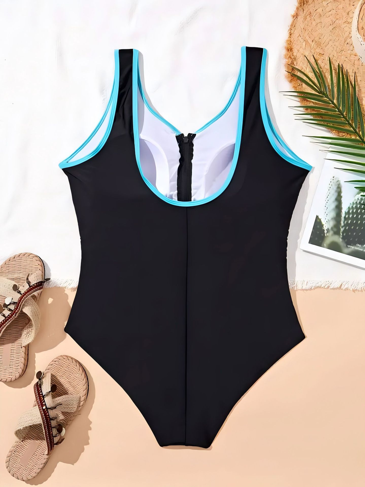 유럽과 미국 스타일의 큰 사이즈 원피스 수영복, 블랙 블루 배색, 앞 지퍼, 슬리밍 효과, 허리를 잘록하게 잡아주고 배를 가려주는 디자인, 뚱뚱한 여성을 위한 온천 수영복스토어 가기