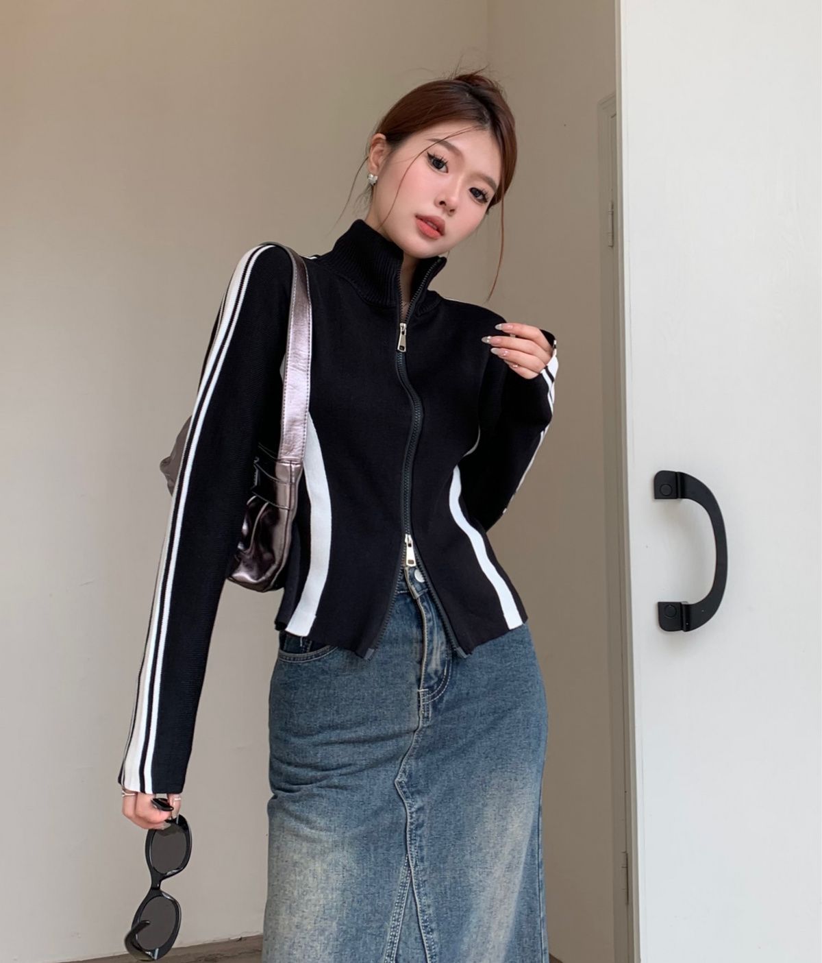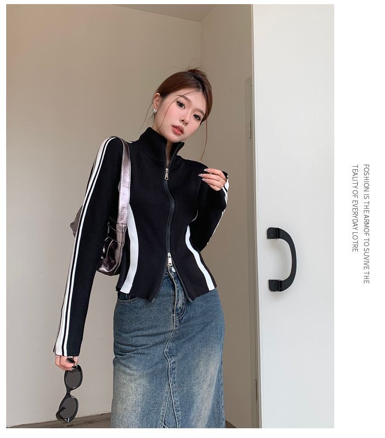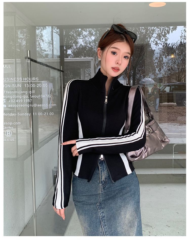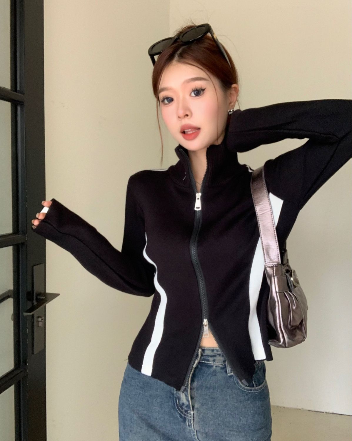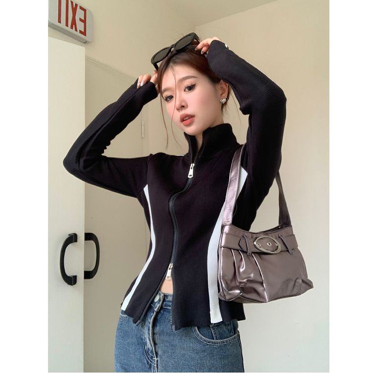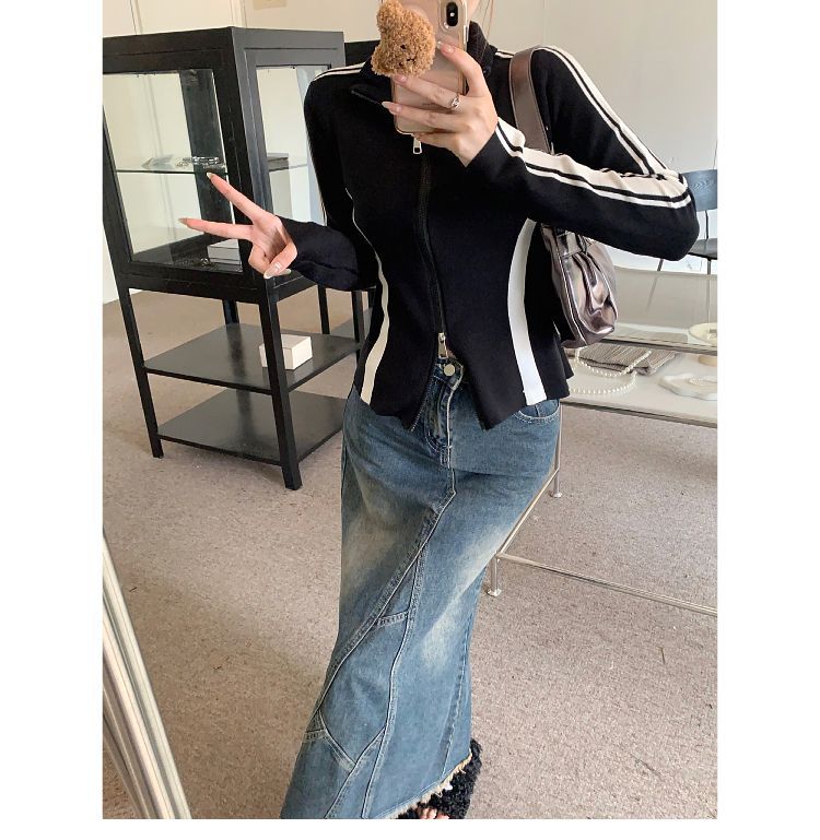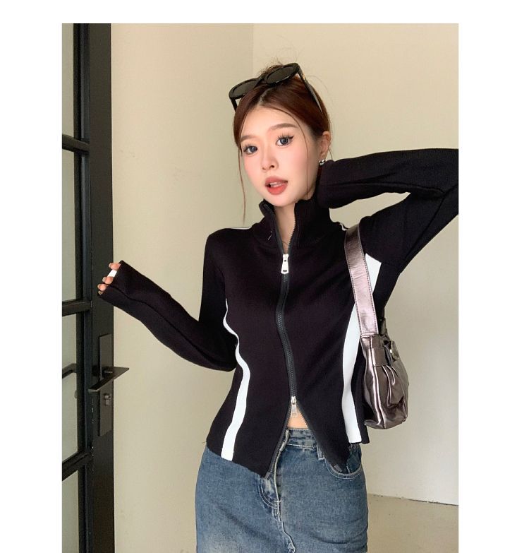 2024 디자인 감각 더블 지퍼 스탠드 칼라 긴팔 스웨터 여성의 가을 새로운 대비 컬러 스티칭 웨스턴 스타일 슬림 핏스토어 가기
