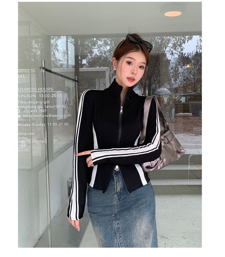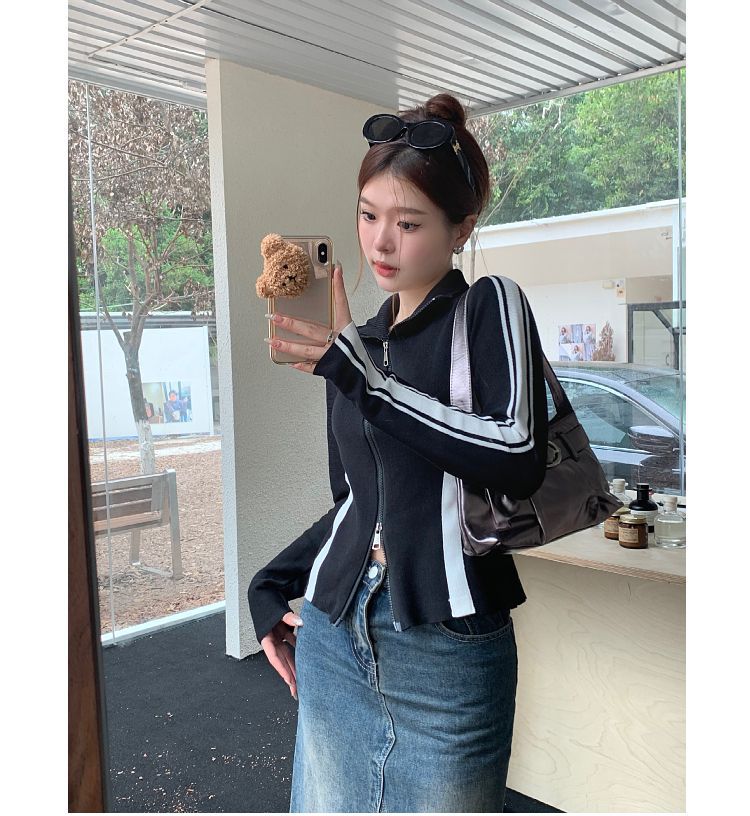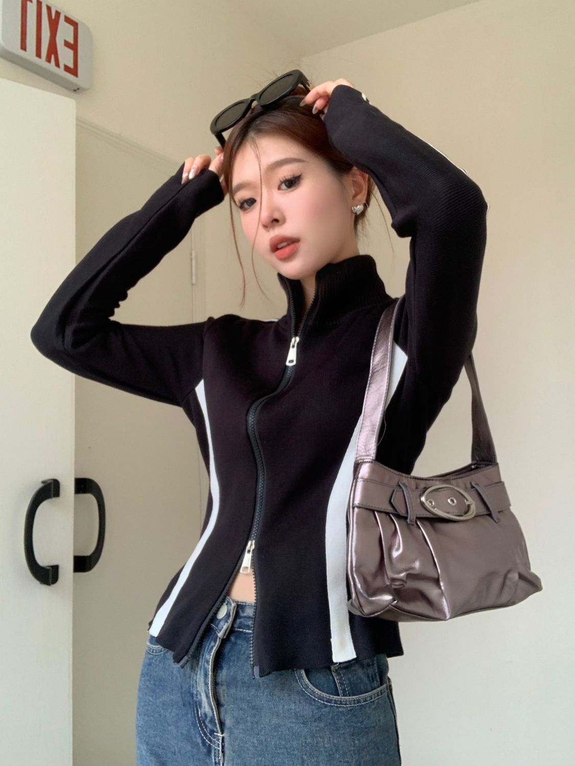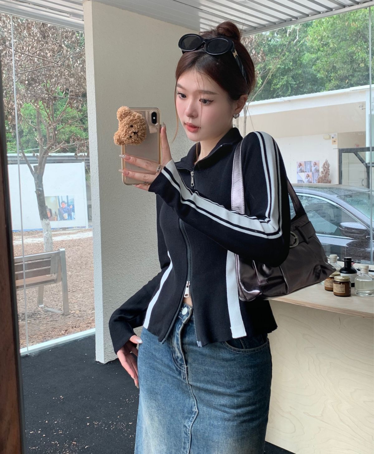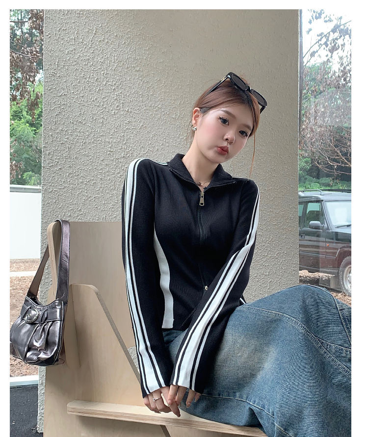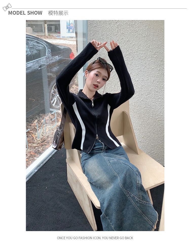 2024 디자인 감각 더블 지퍼 스탠드 칼라 긴팔 스웨터 여성의 가을 새로운 대비 컬러 스티칭 웨스턴 스타일 슬림 핏스토어 가기