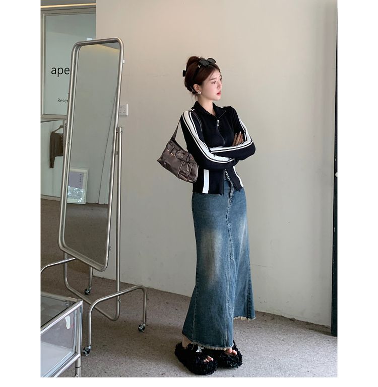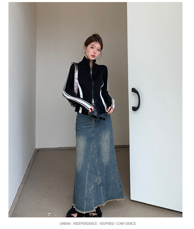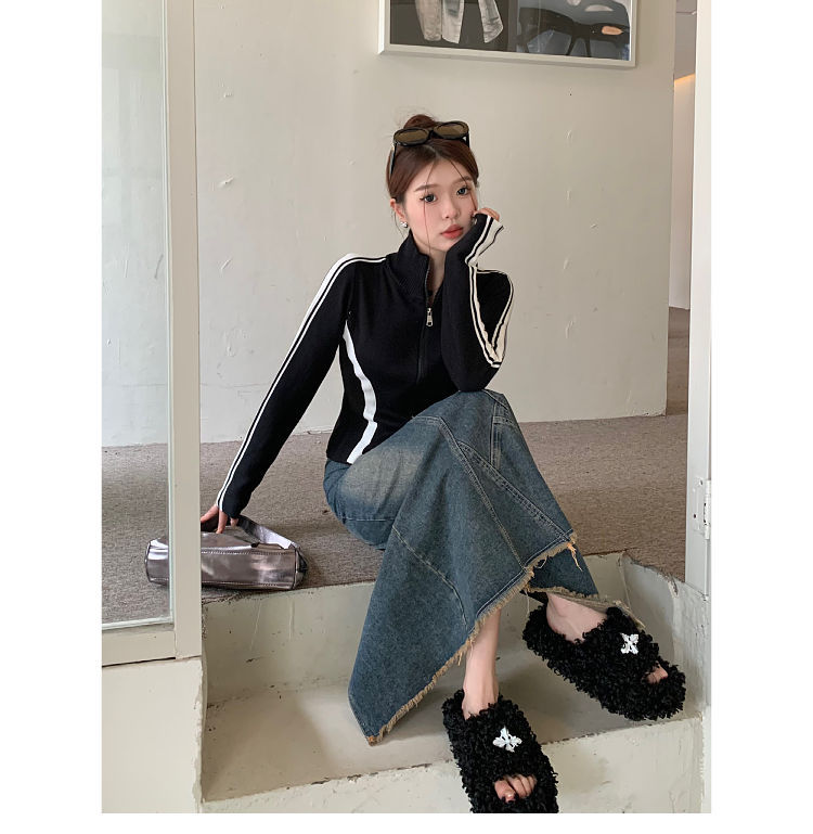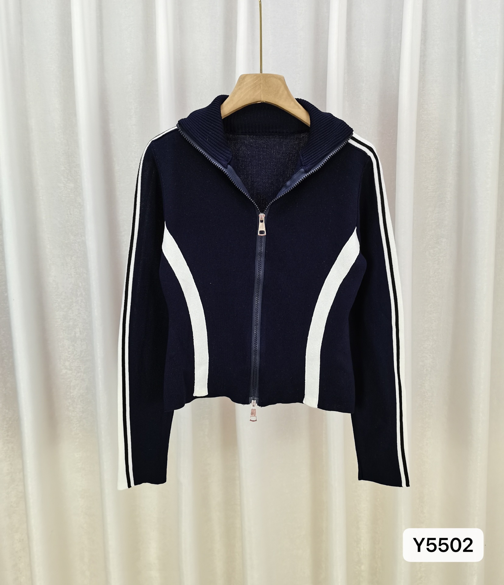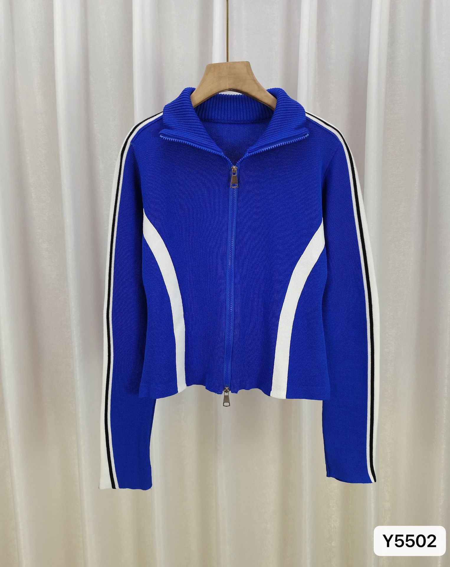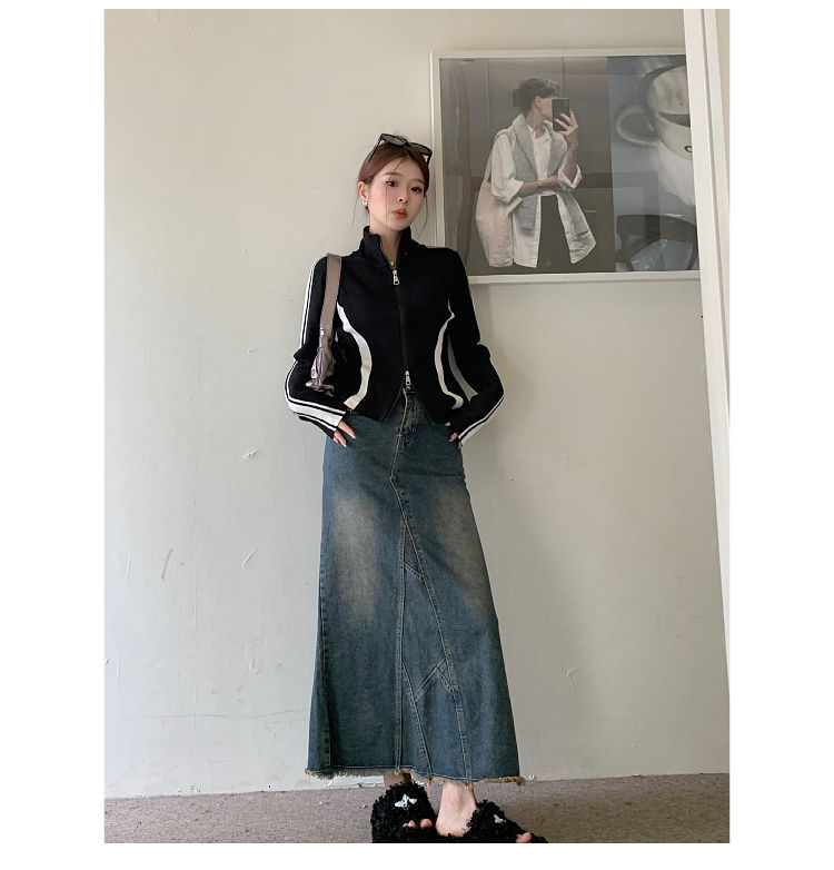 2024 디자인 감각 더블 지퍼 스탠드 칼라 긴팔 스웨터 여성의 가을 새로운 대비 컬러 스티칭 웨스턴 스타일 슬림 핏스토어 가기