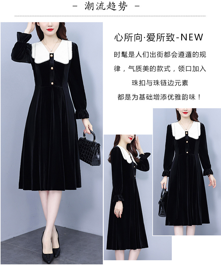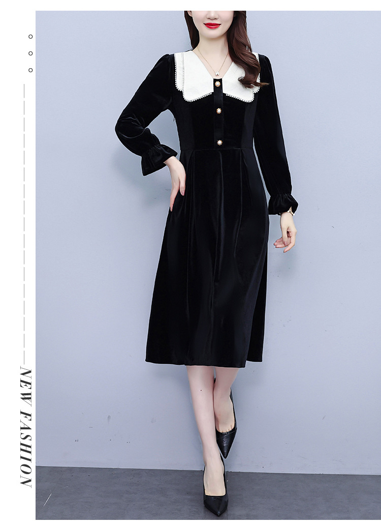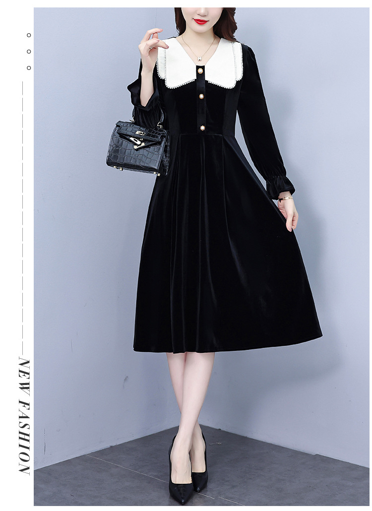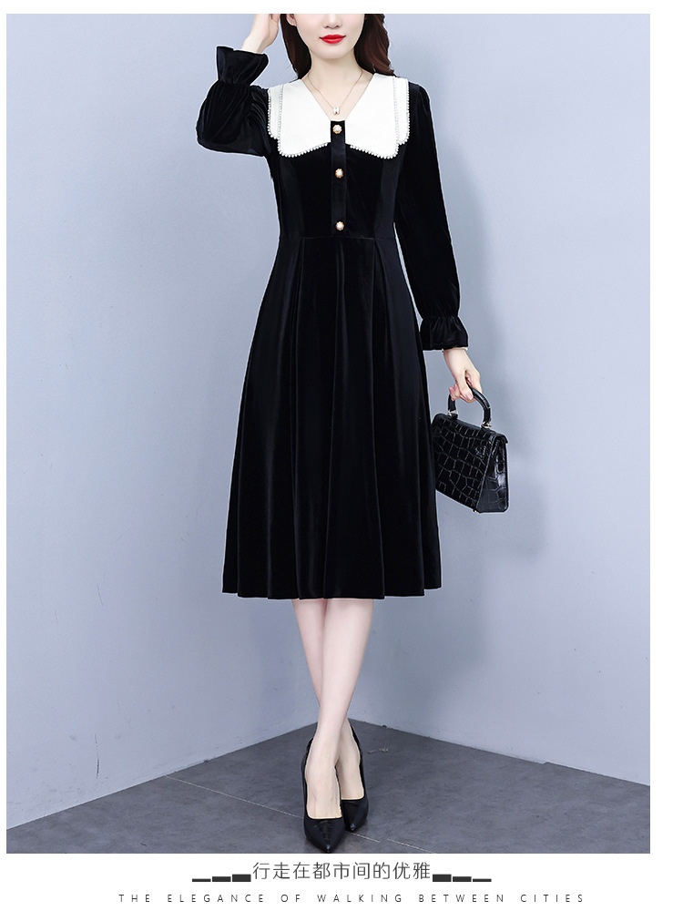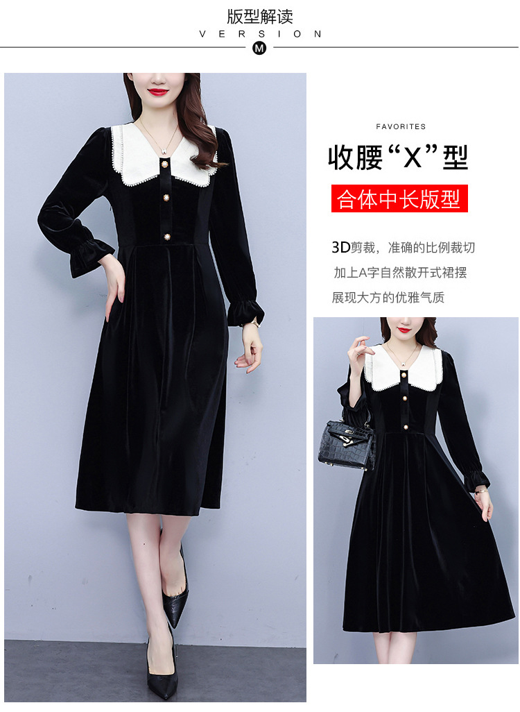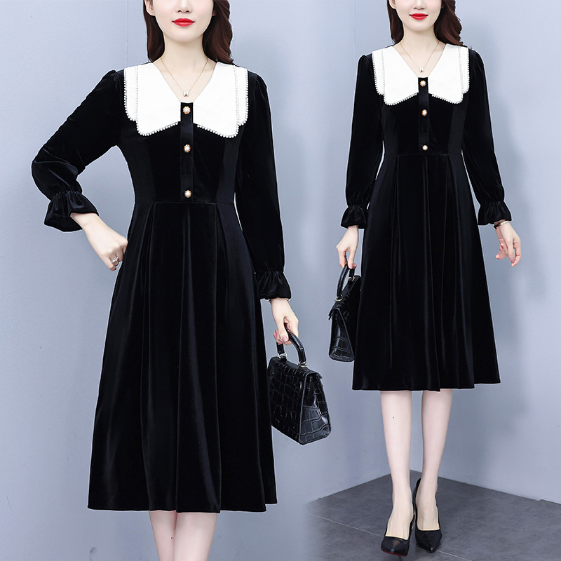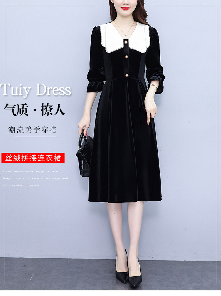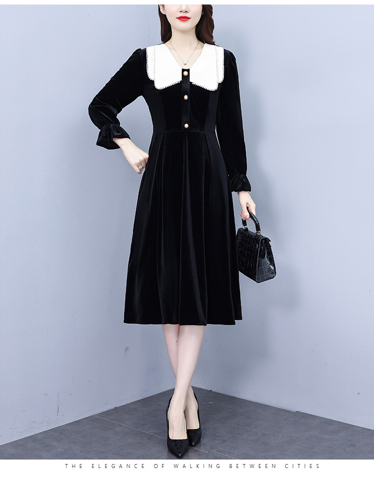 프랑스 레트로 인형 칼라 벨벳 원피스 여성 가을 2024 새로운 높은 허리 슬리밍 우아한 V 넥 작은 검은 원피스