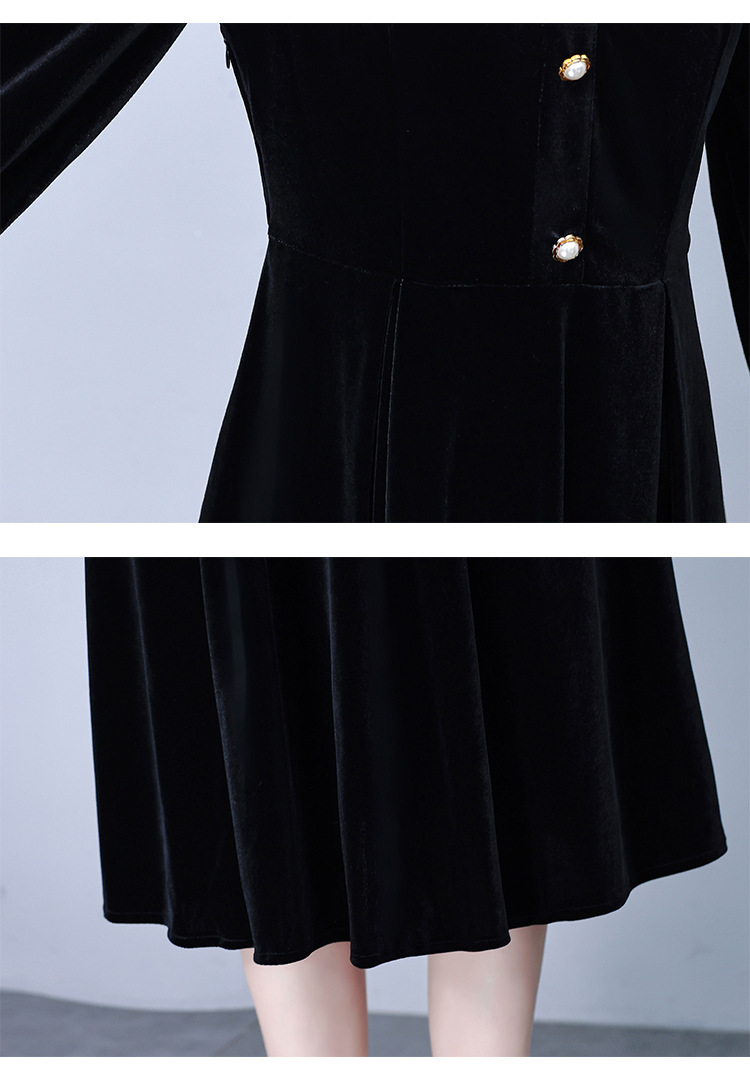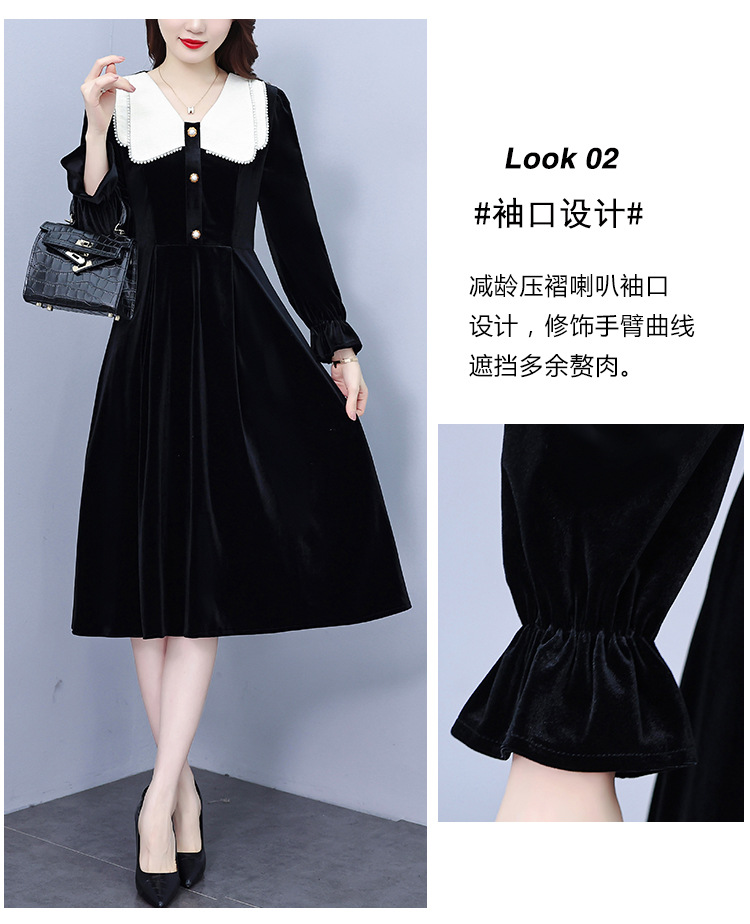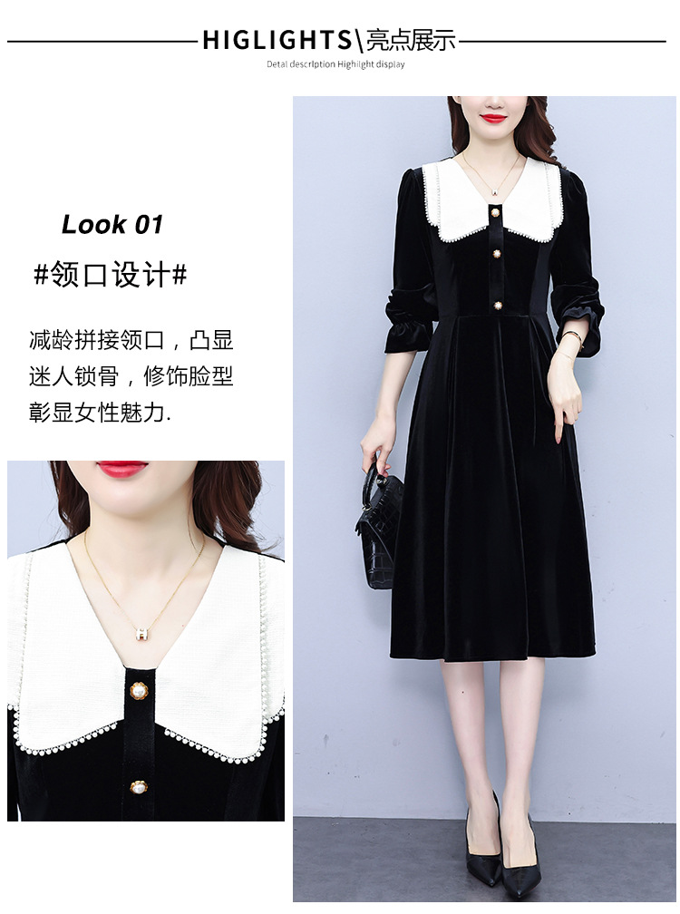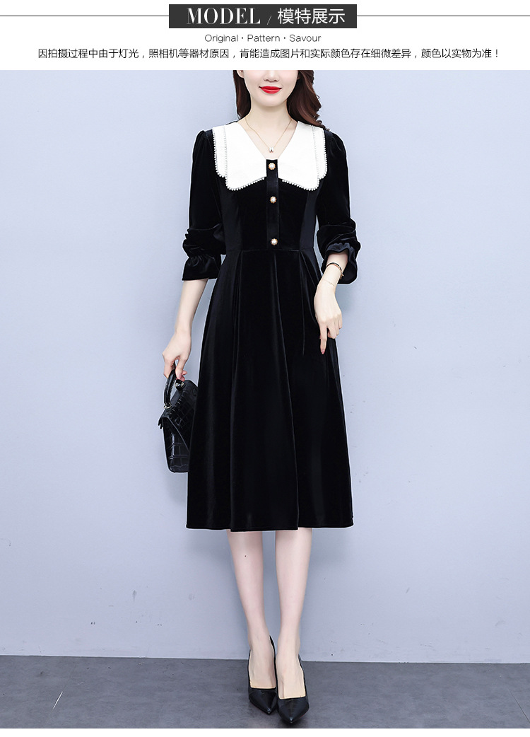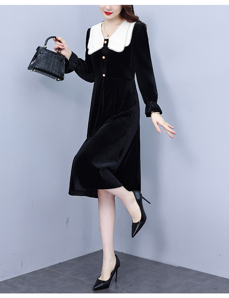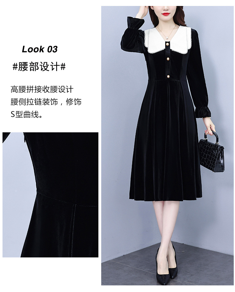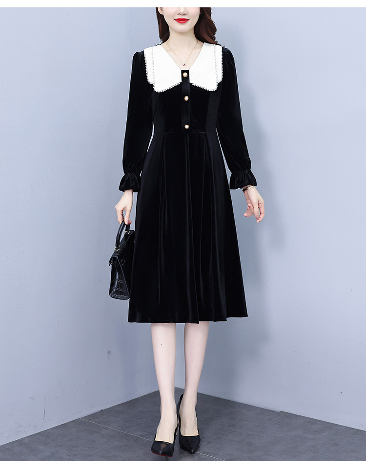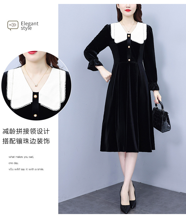 프랑스 레트로 인형 칼라 벨벳 원피스 여성 가을 2024 새로운 높은 허리 슬리밍 우아한 V 넥 작은 검은 원피스