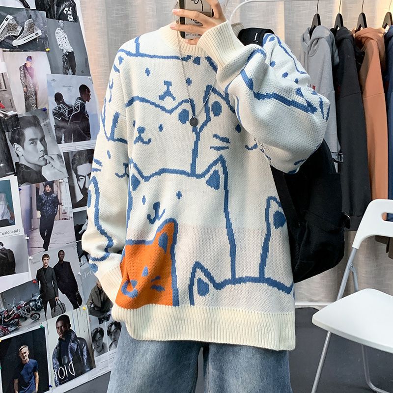2024 가을과 겨울 새로운 고양이 스웨터 남성용 느슨한 캐주얼 트렌디 브랜드 라운드 넥 스웨터 한국 스타일 커플의 트렌디 코트